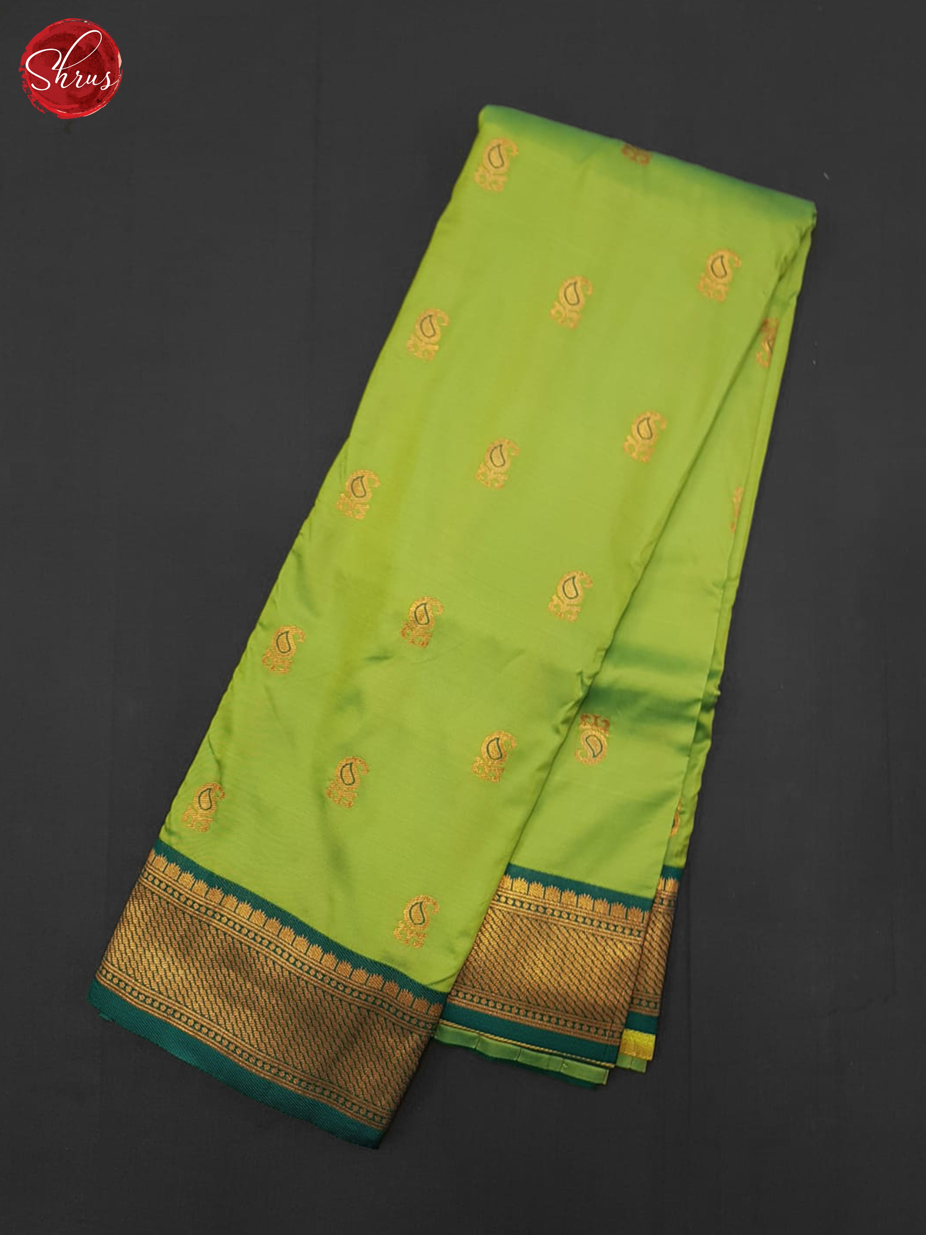 Pretty Light greenSemi Kanchipuram Silk saree enchants with zari woven peacock butta on the body .The rich contrast green gold zari woven border & brocade pallu adds prettiness Comes with plain green blouse with zari border looks enchantingly pretty