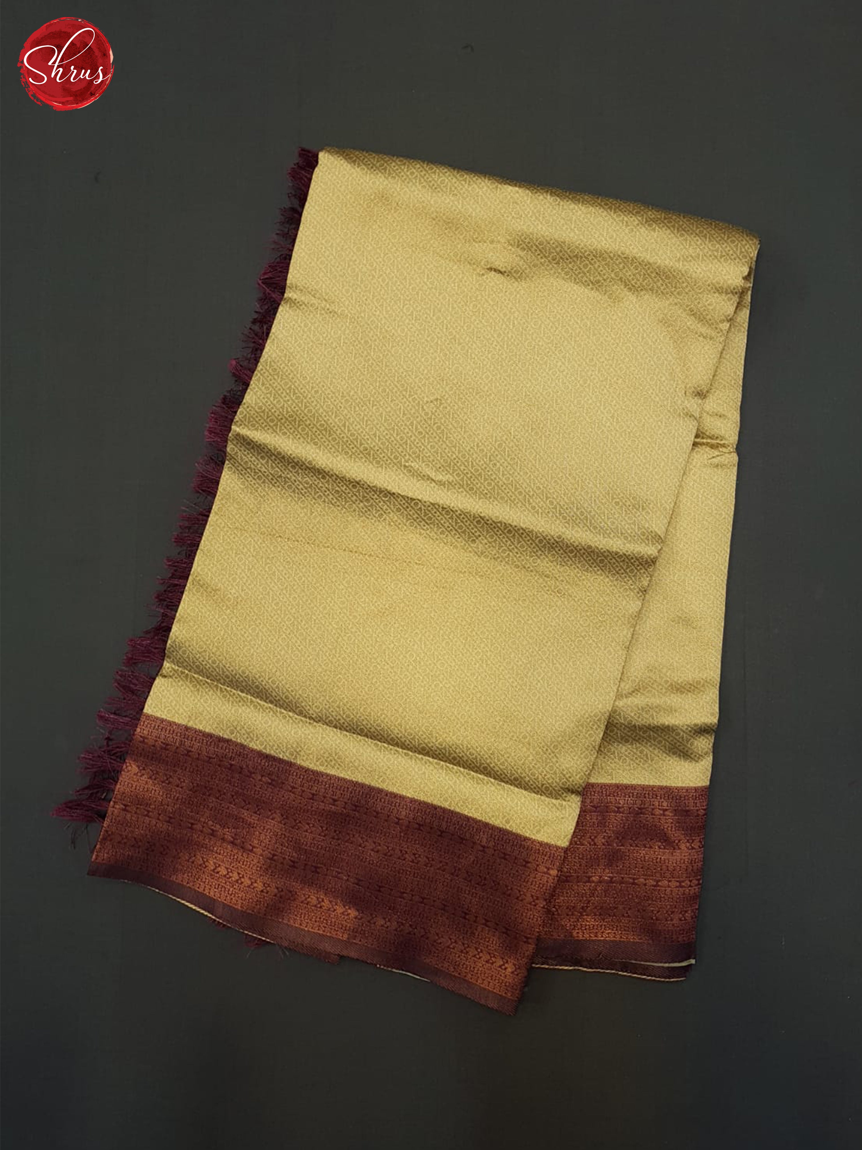 Very pretty Beige Semi Kanchipuram Silk saree enchants with zari woven body .The rich purple gold zari woven border & brocade pallu adds prettiness Comes with zari butta purple blouse with zari border looks enchantingly pretty