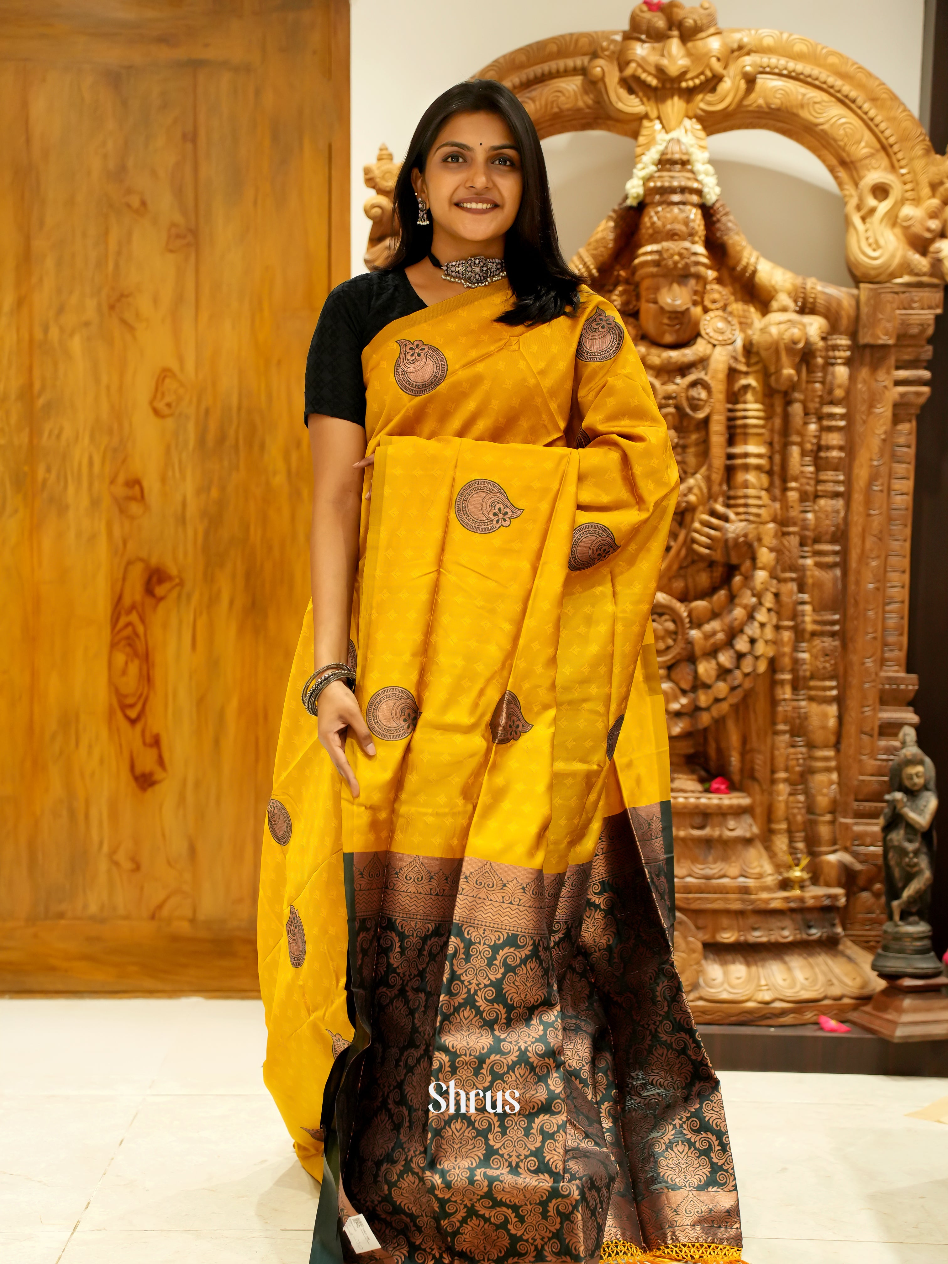 Pretty Mustard Semi soft Silk saree enchants with gold zari woven floral motifs on the body .The rich contrast Green zari woven brocade Pallu adds elegance . Attached with zari butta Green blouse with border completes The ensemble