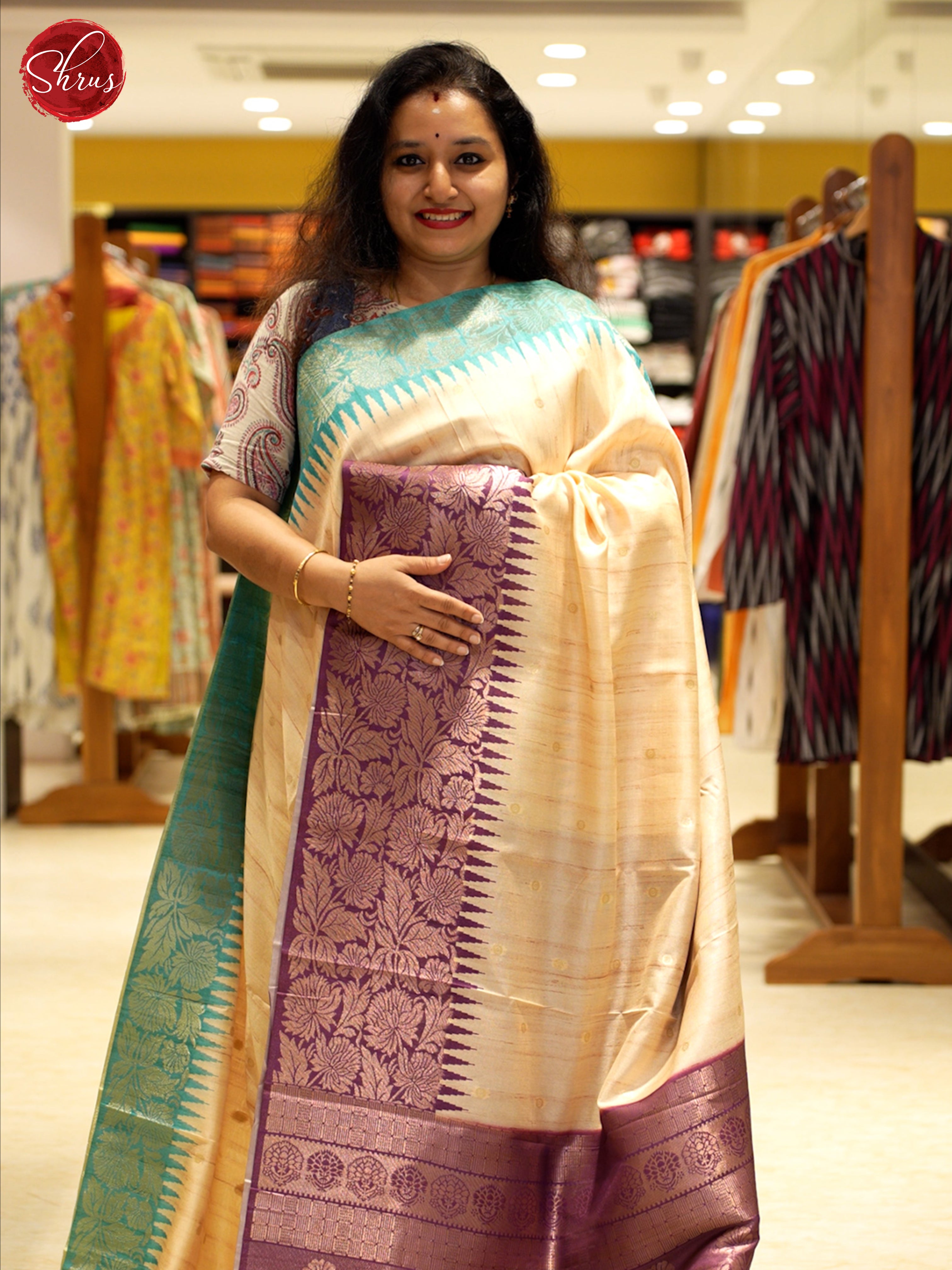 Elegant Beige Semi Raw silk saree enchants with zari buttas on the body & bounded with Purple & Green Ganga Jamuna zari border adds prettiness . The splendid Purple zari woven pallu and plain blouse with zari Border completes the ensemble