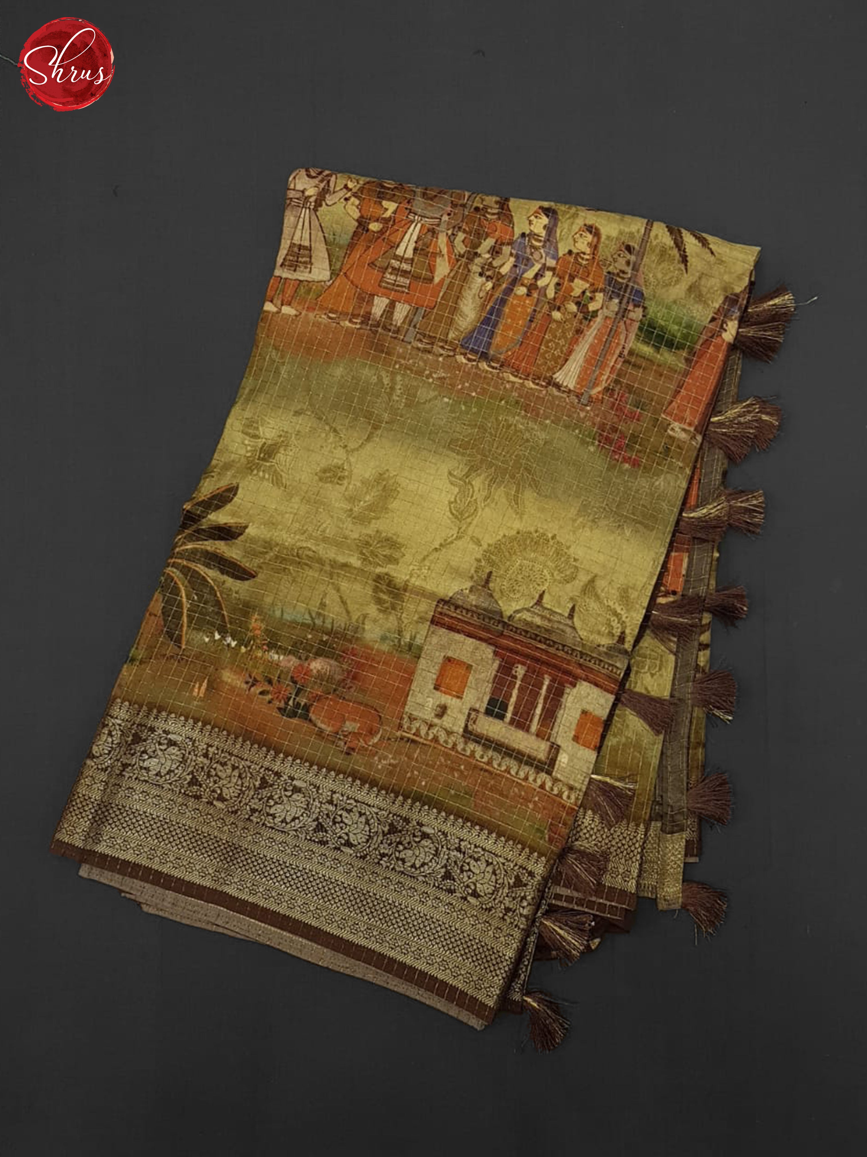 Pretty Beige Semi Crepe Saree enchants with art print on the body & bounded with Brown zari border & pallu compliments beautifully Comes with brown blouse gives a perfect finish