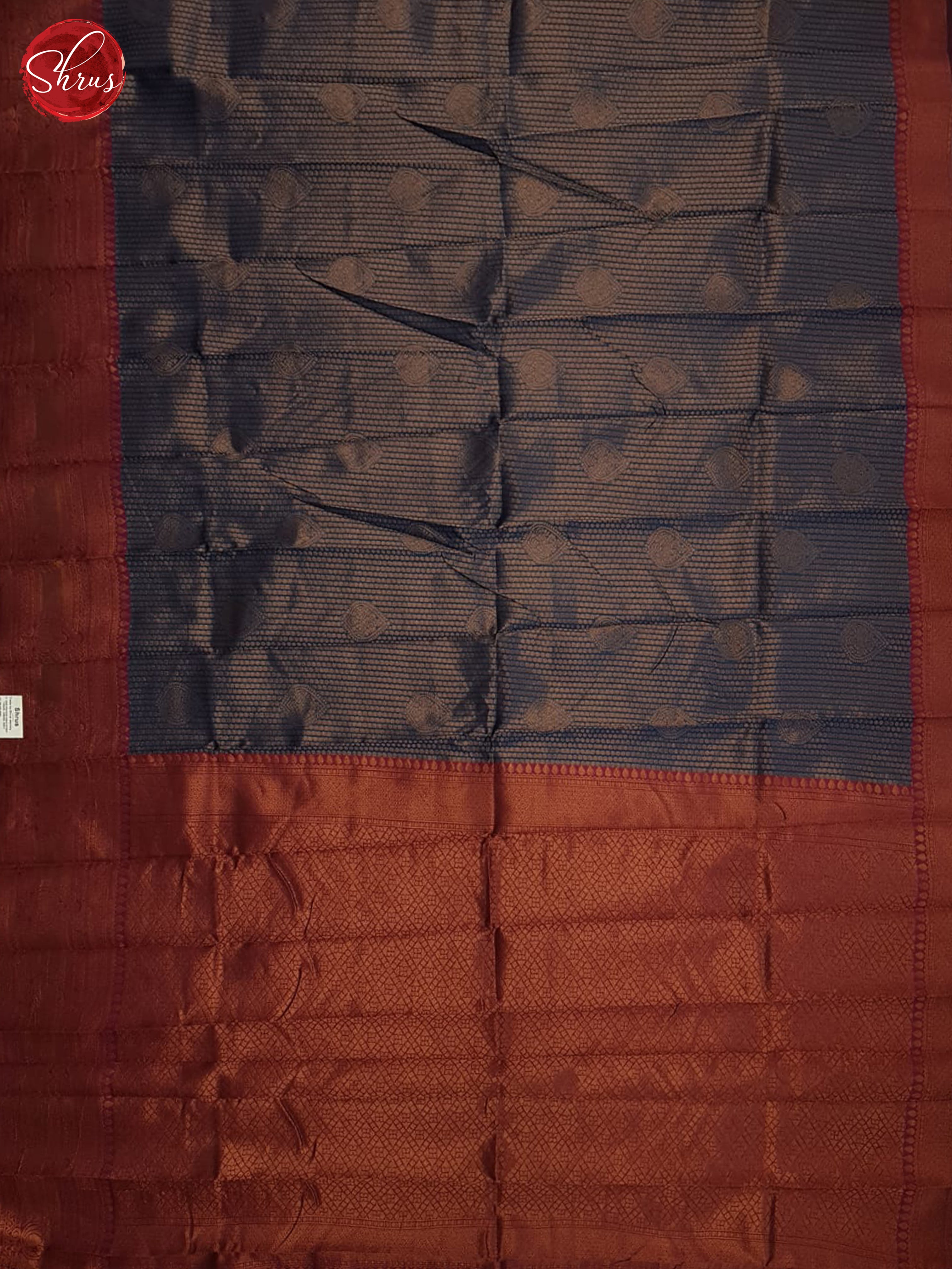 Elegant Blue Semi Kanchipuram Silk saree enchants with zari woven body .The rich wine gold zari woven border & brocade pallu adds prettiness Comes with plain wine blouse with zari border looks enchantingly pretty