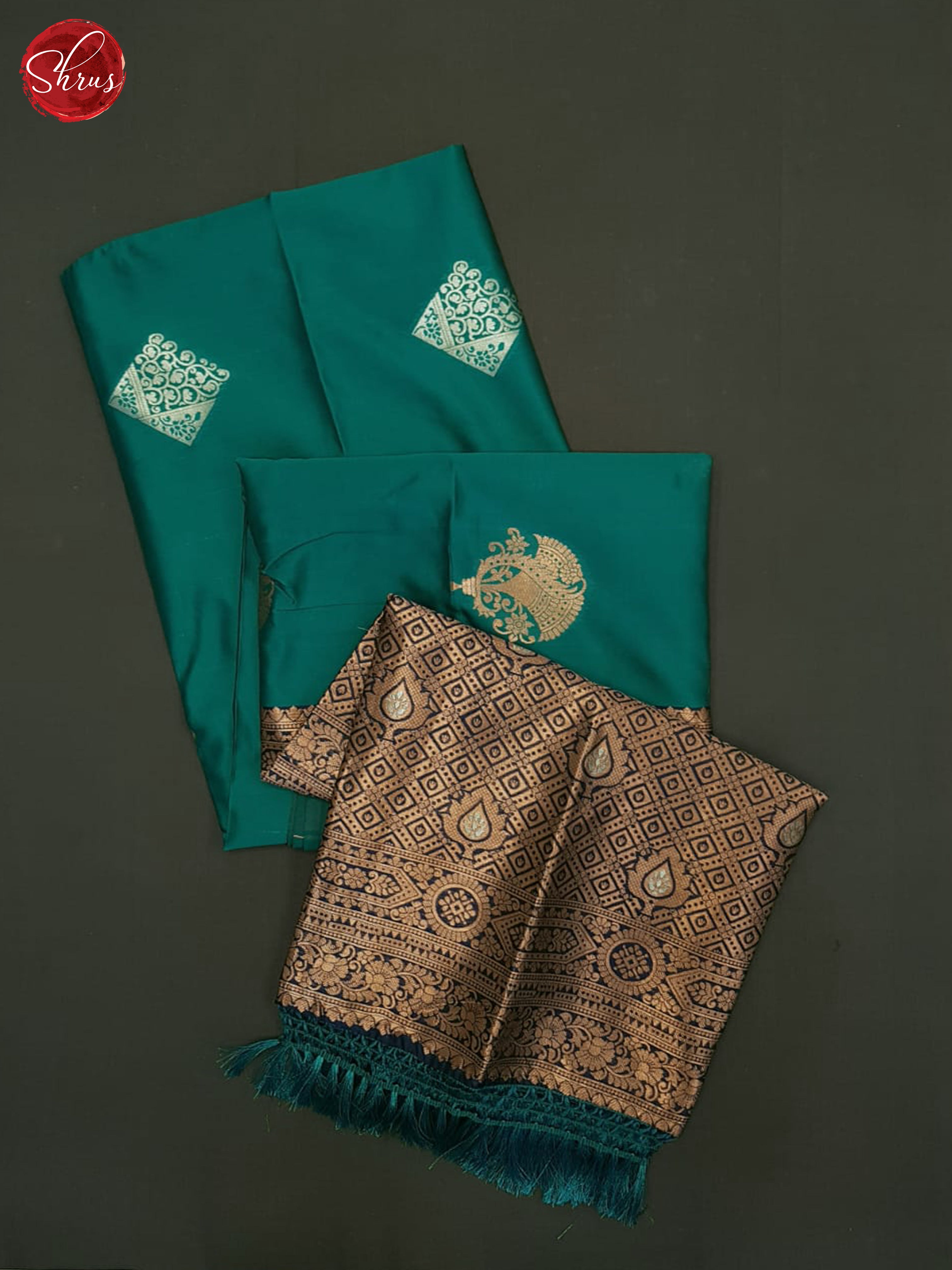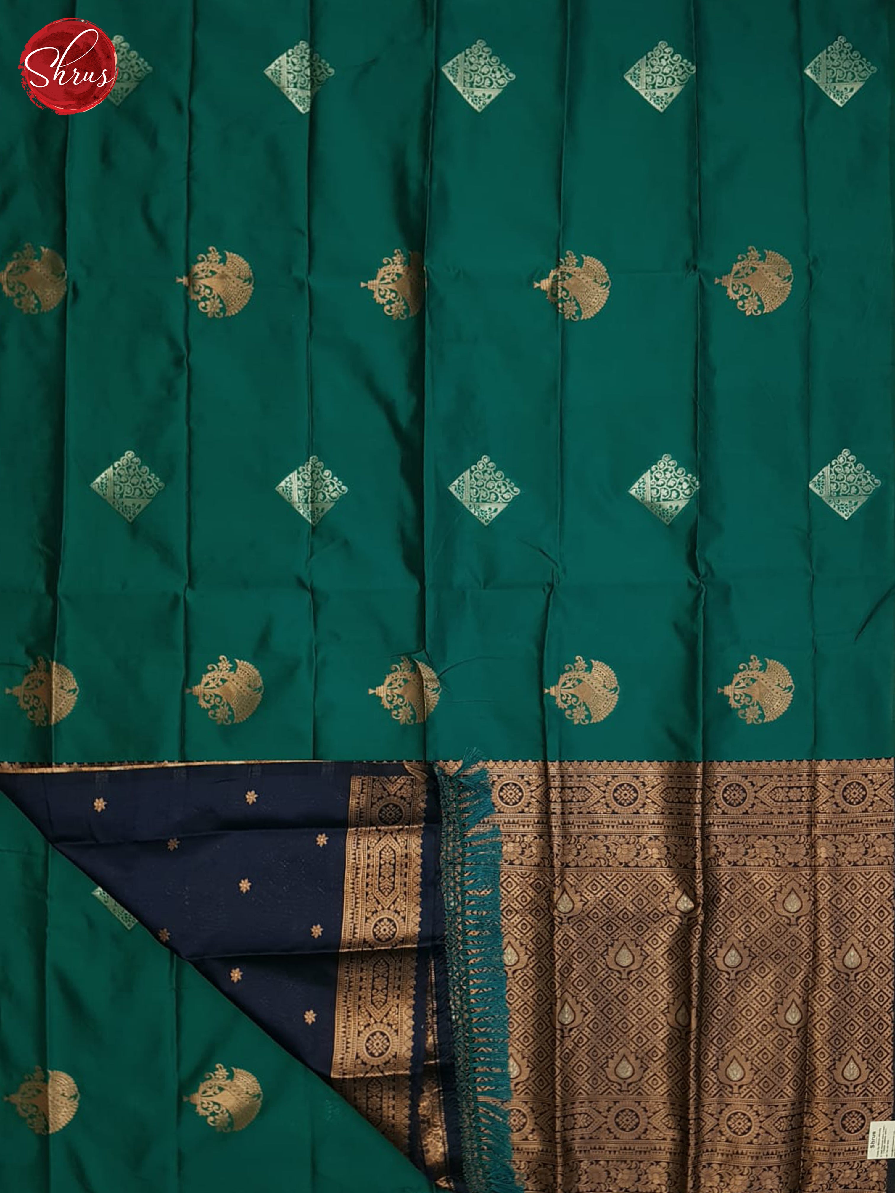 Pretty Green Semi soft Silk saree enchants with gold zari woven floral motifs on the body .The rich blue zari woven brocade Pallu adds elegance . Attached with zari butta blue blouse with border completes The ensemble