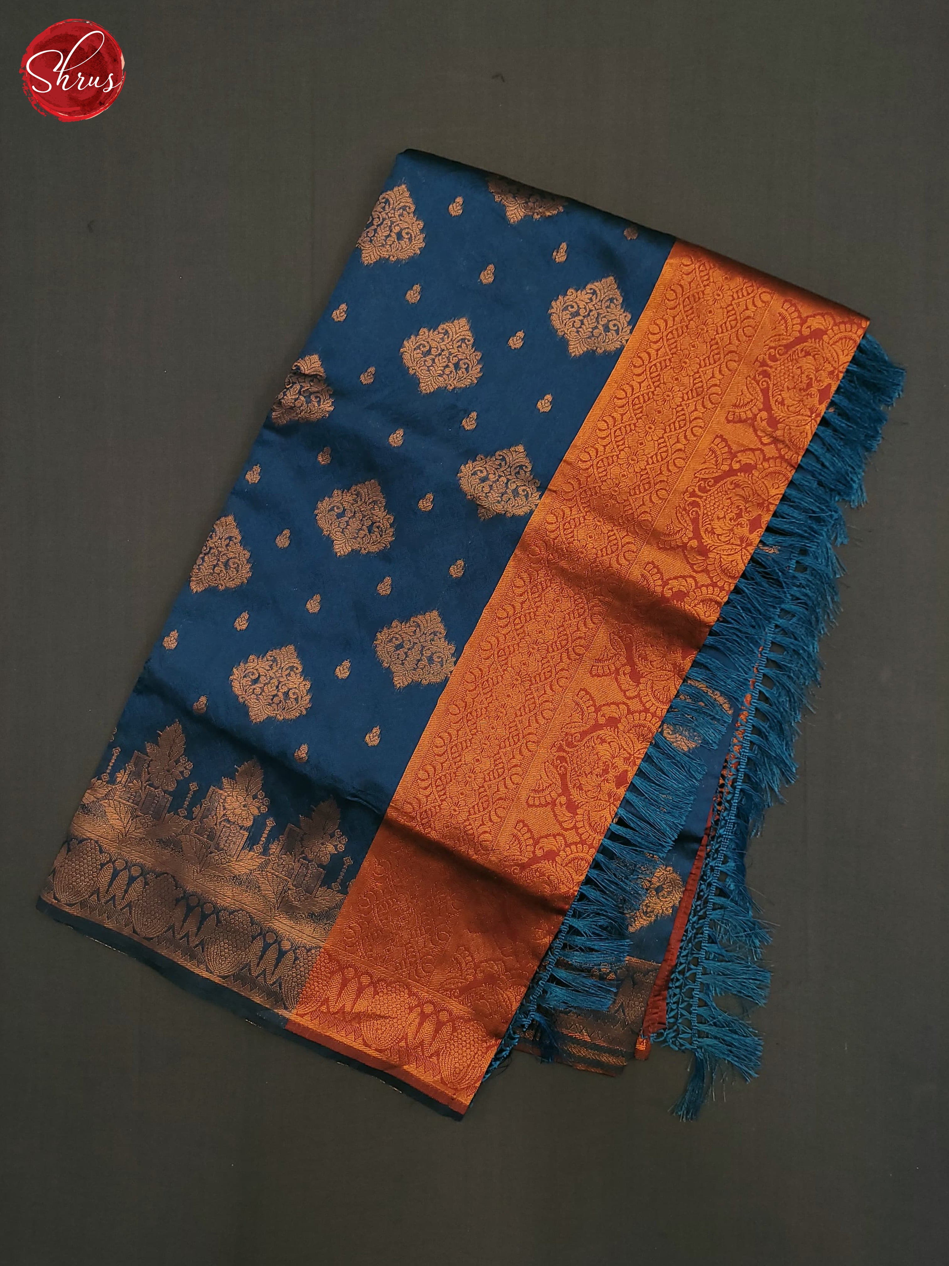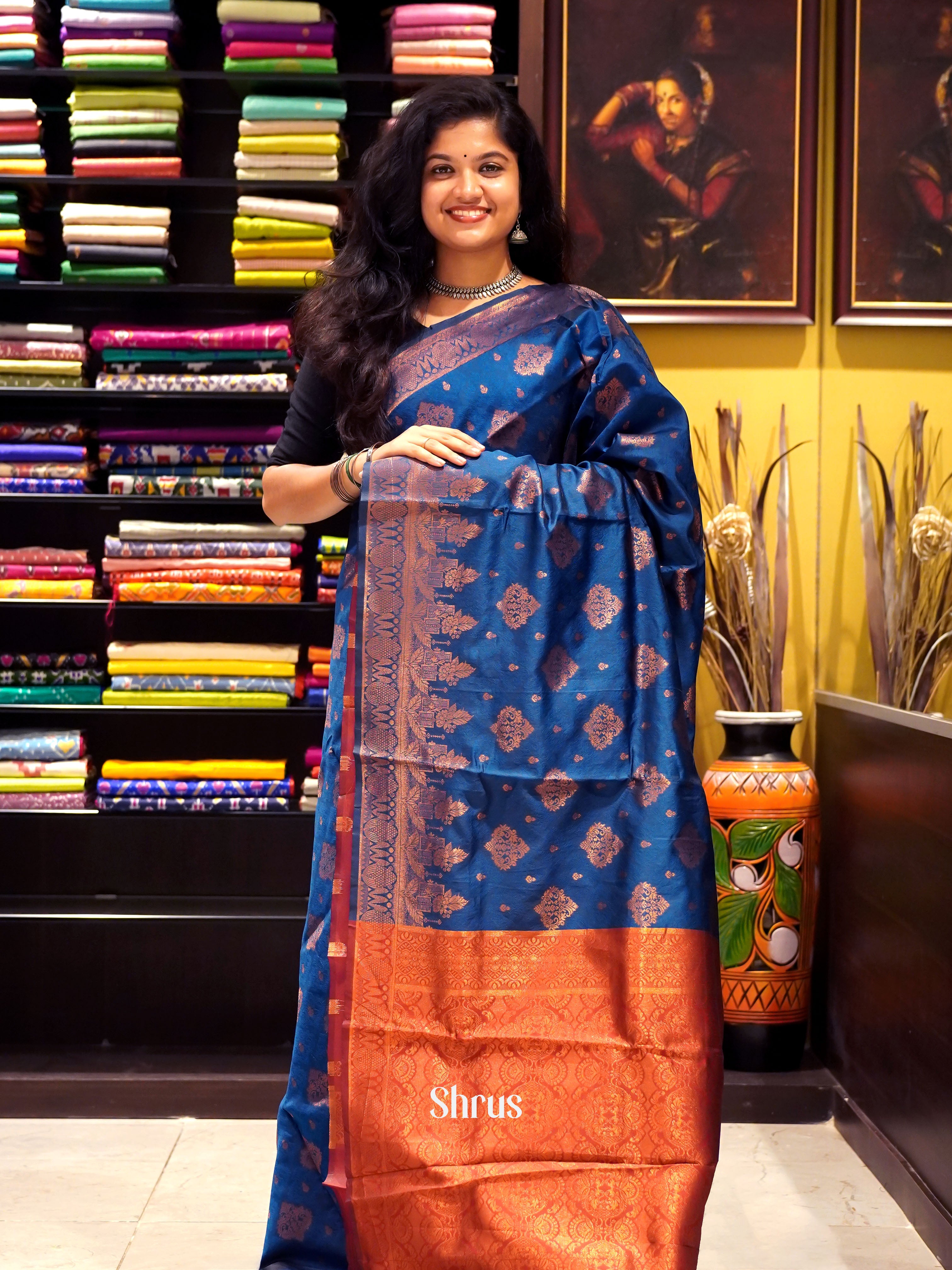 Pretty Blue Semi soft Silk saree enchants with gold zari woven floral motifs on the body .The rich self zari border & contrast Maroon zari woven brocade Pallu adds elegance . Attached with zari butta Maroon blouse with border completes The ensemble