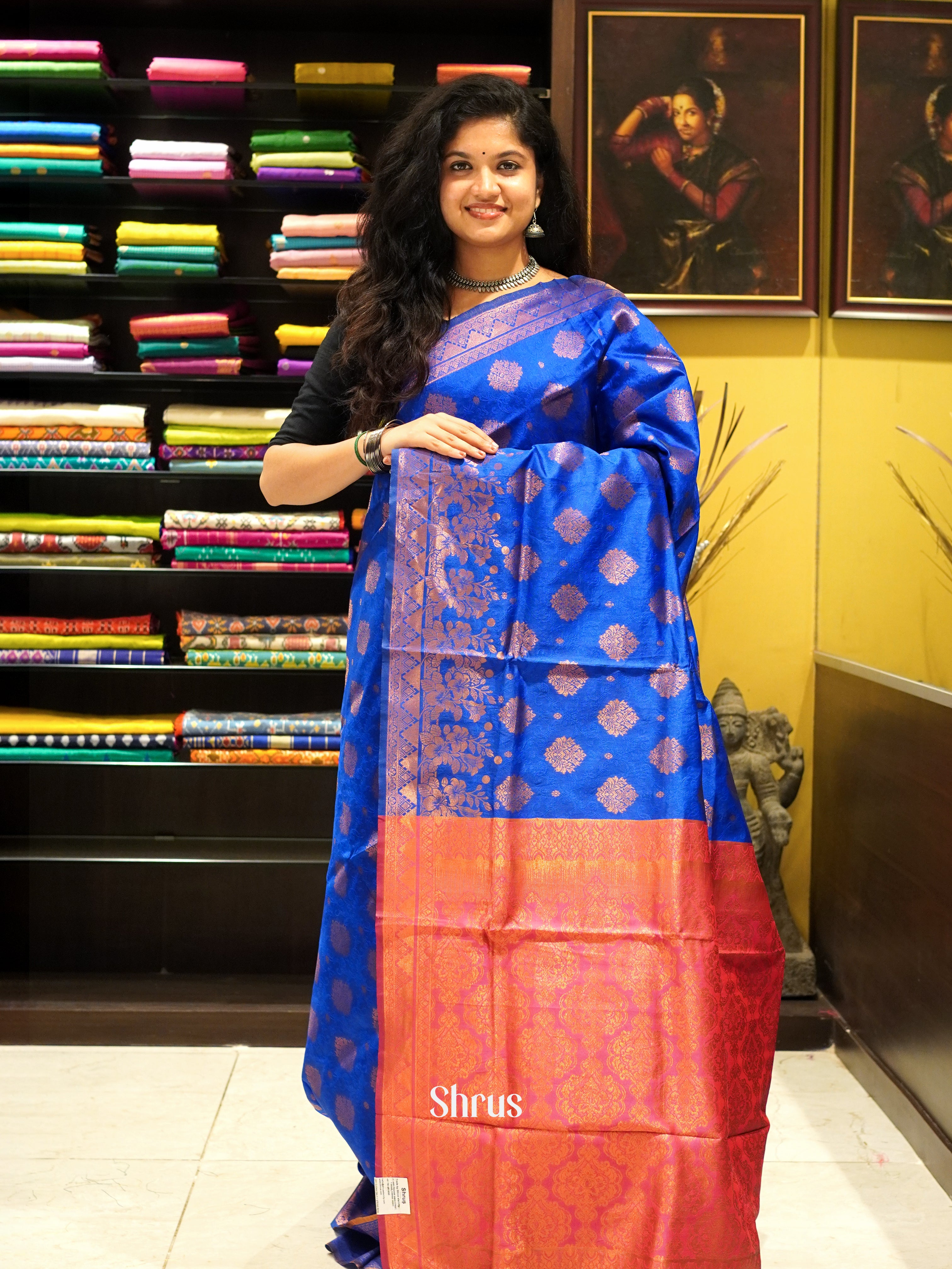 Elegant Blue Semi soft Silk saree enchants with gold zari woven floral buttas on the body .The rich self zari border & contrast Pink zari woven brocade Pallu adds elegance . Attached with zari butta Pink blouse with border completes The ensemble