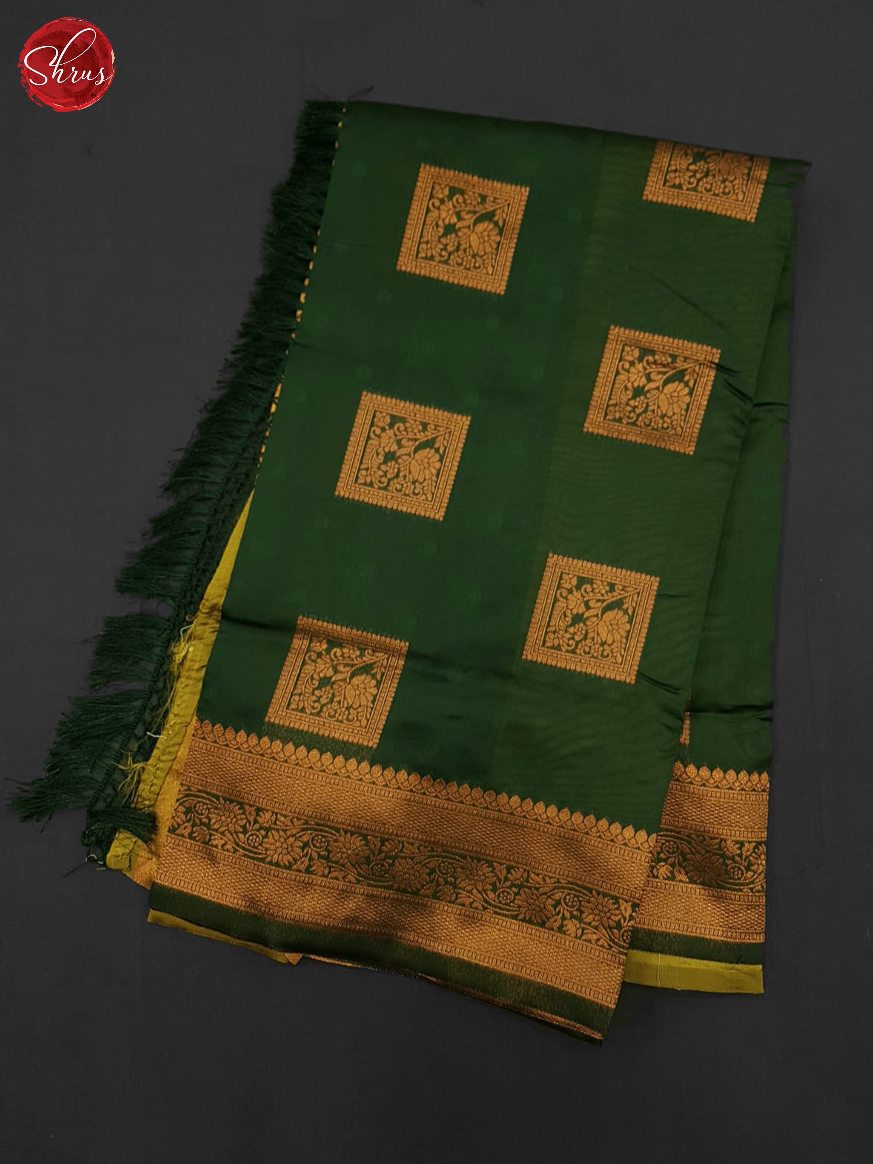 Pretty Green Semi soft Silk saree enchants with gold zari woven floral block motifs on the body .The rich self zari border & contrast Mustard zari woven brocade Pallu adds elegance . Attached with plain mustard blouse with border completes The ensemble