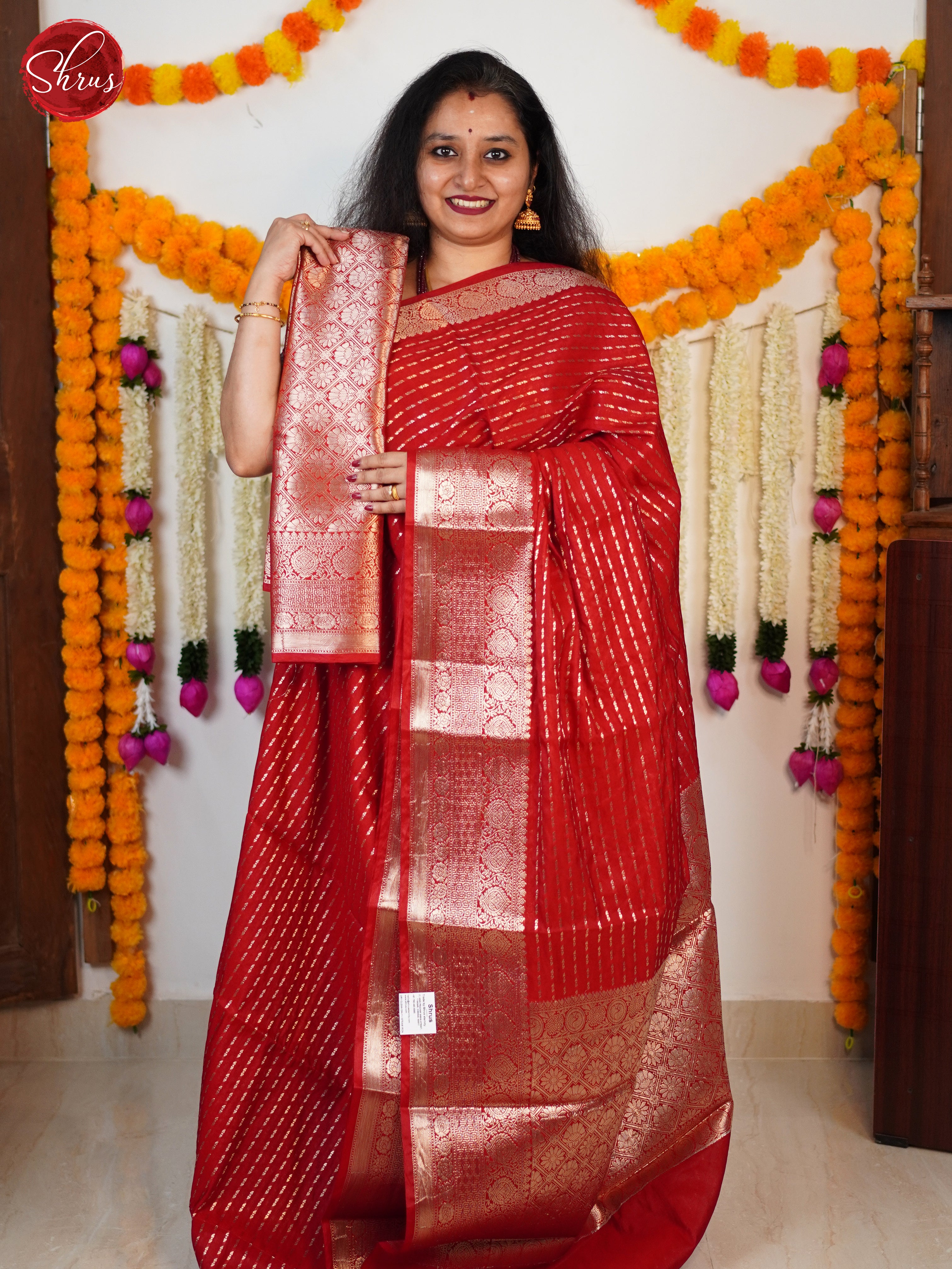 Elegant Red Semi dupion saree enchants with zari stripes on the body & bounded with self zari woven border .The self zari woven Pallu & brocade blouse with zari border completes the ensemble