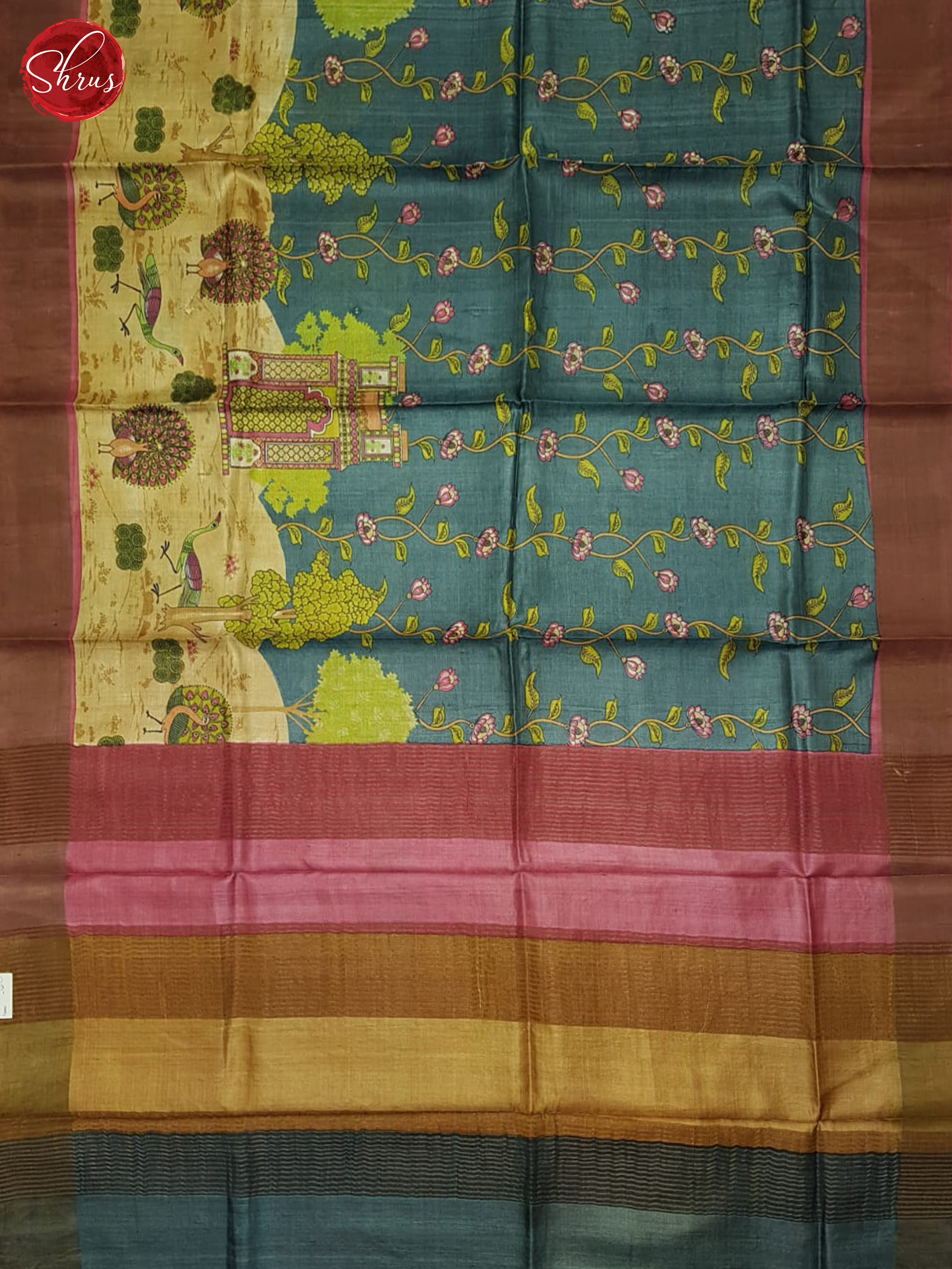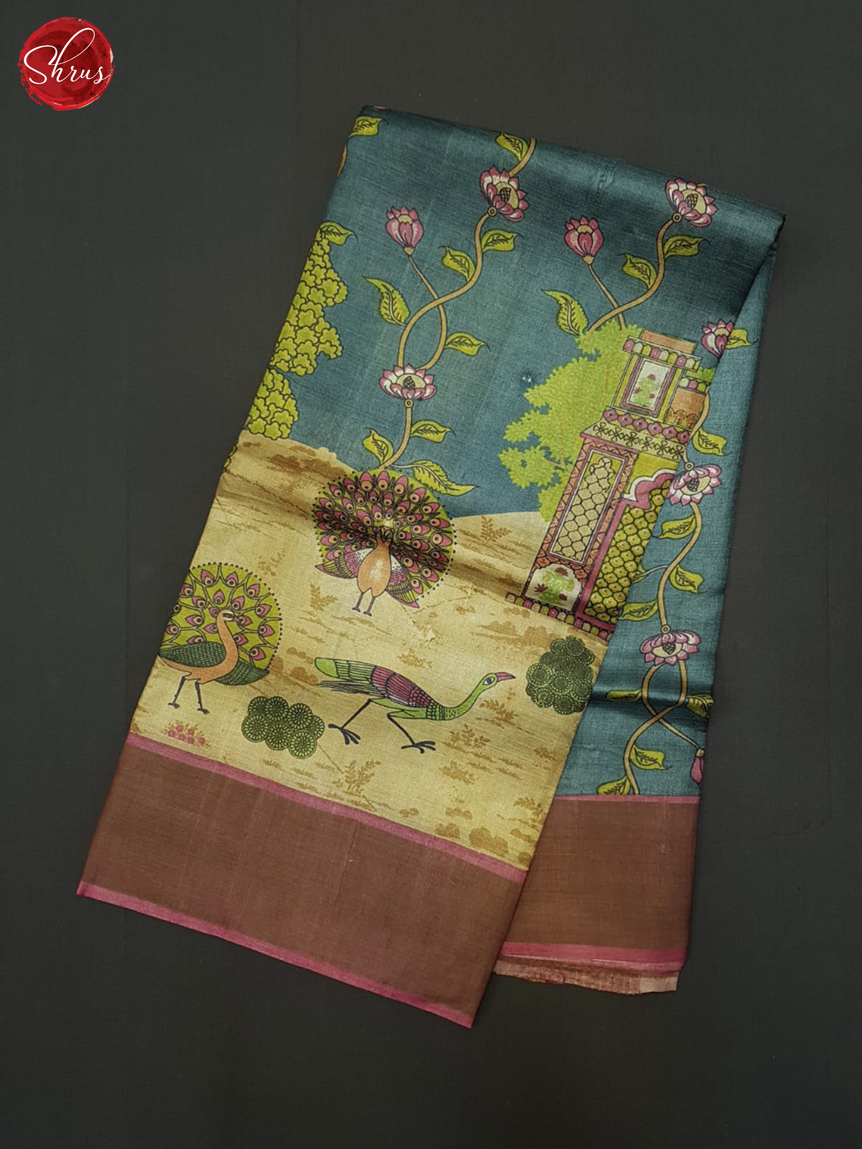 Pretty Blue Tussar saree enchants with Kalamkari floral print on the body & bounded with contrast Pink zari woven border .The rich self printed Pallu & plain Pink blouse with Zari Border completes the ensemble