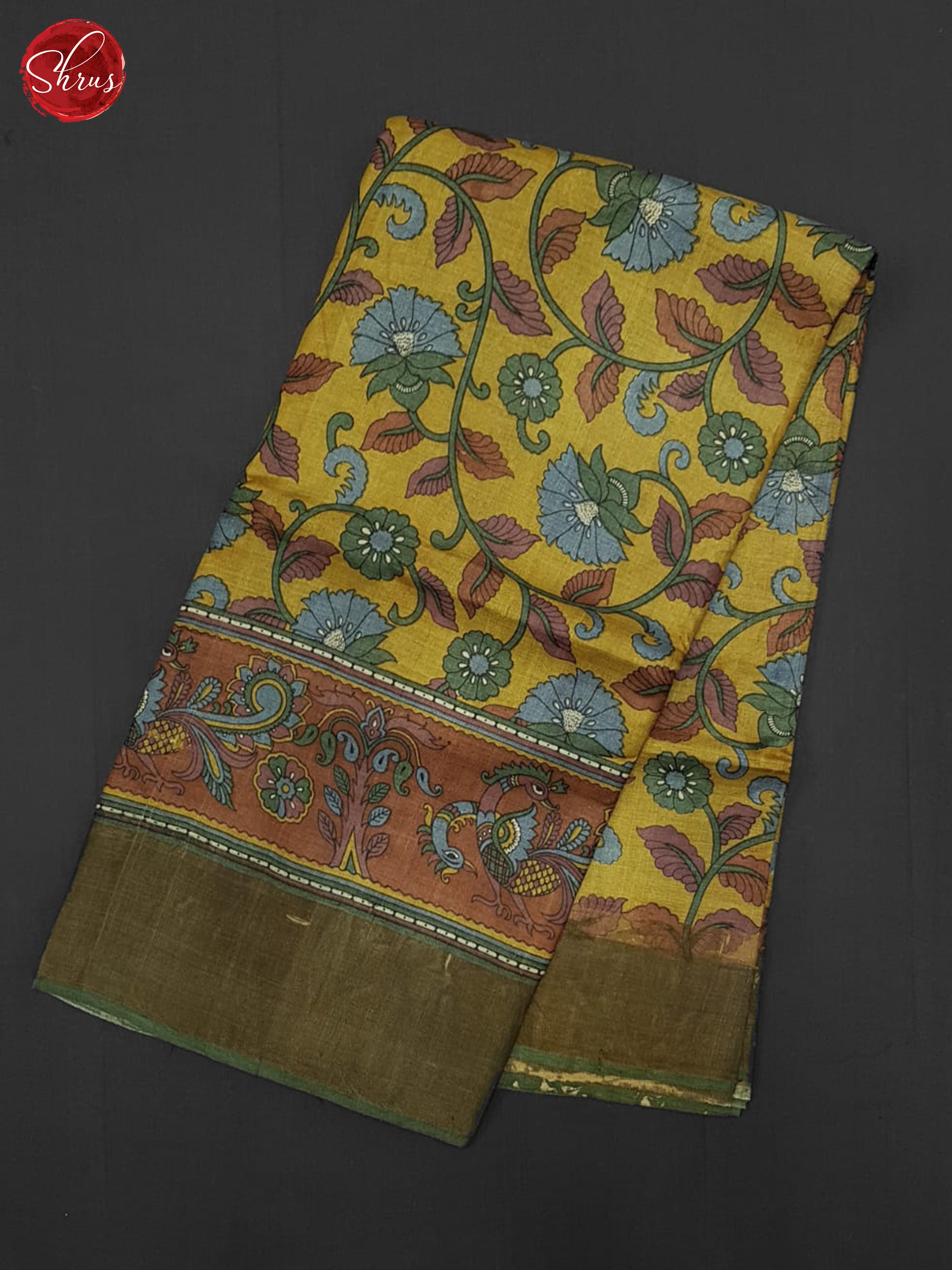 Beautiful Mustard Tussar saree enchants with Kalamkari floral print on the body & bounded with contrast Grey zari woven border .The rich self printed Pallu & plain Grey blouse with Zari Border completes the ensemble