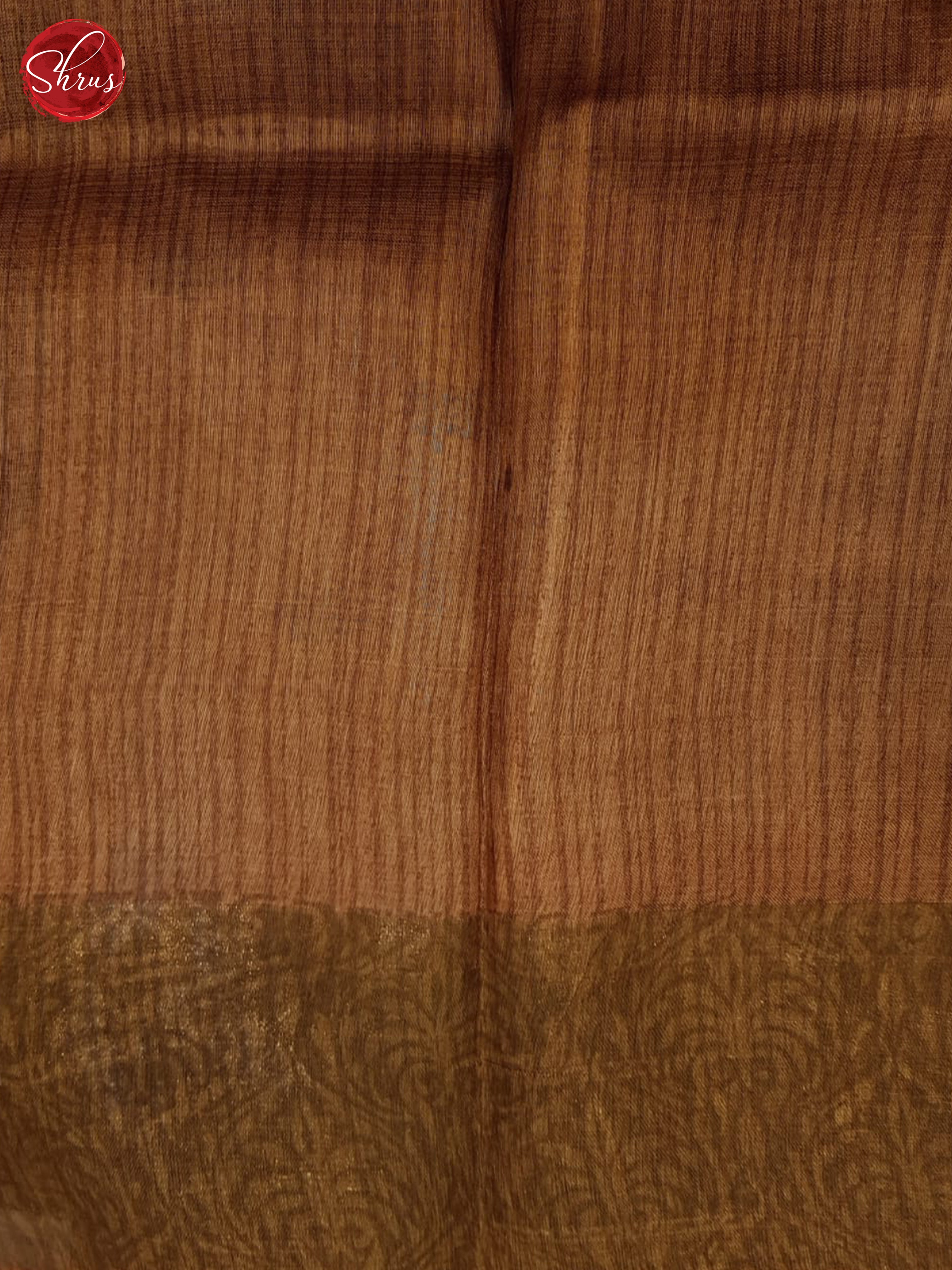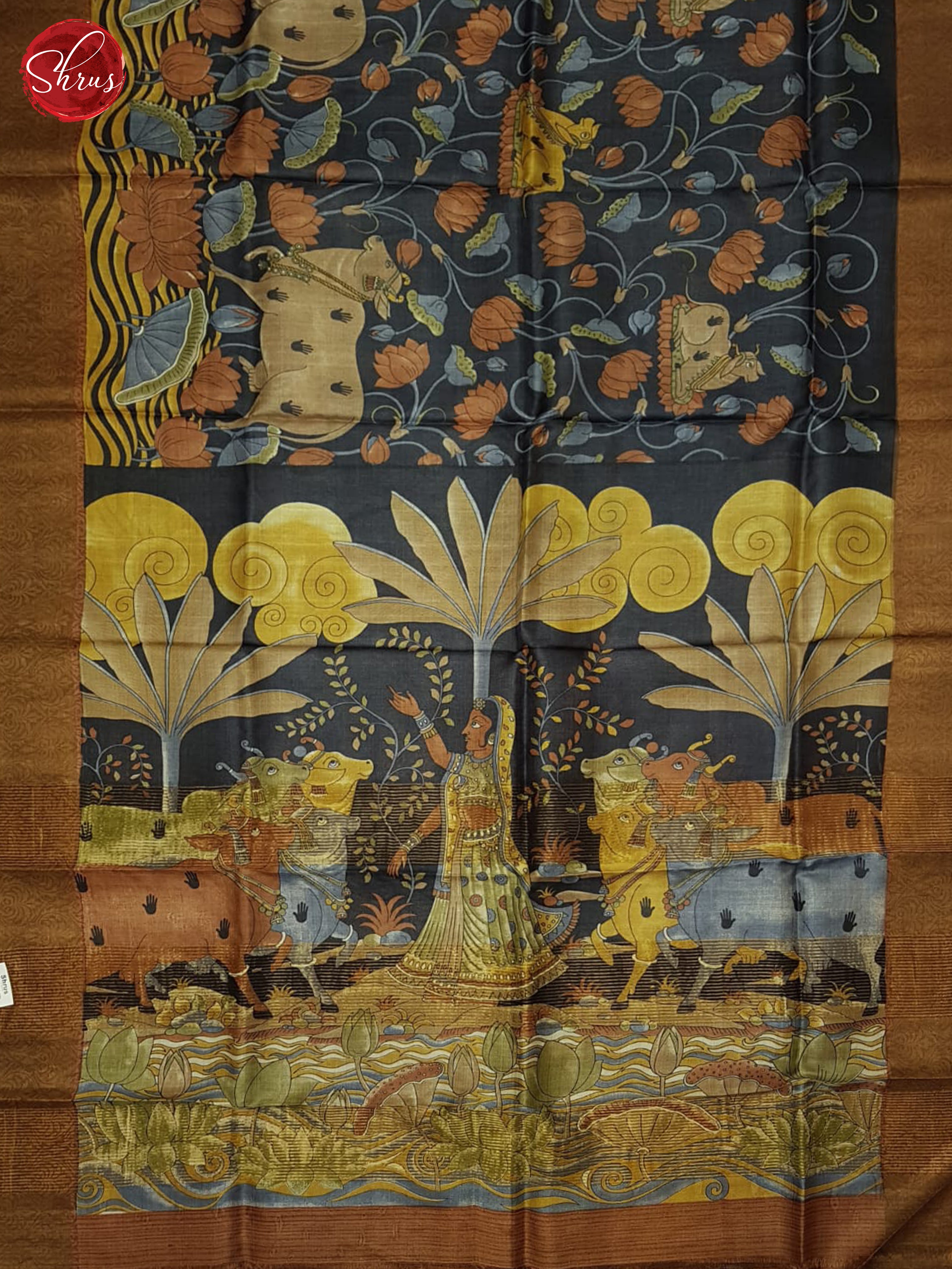 Beautiful Bluish grey Tussar saree enchants with Kalamkari floral print on the body & bounded with contrast Brown zari woven border .The rich self printed Pallu & plain Brown blouse with Zari Border completes the ensemble