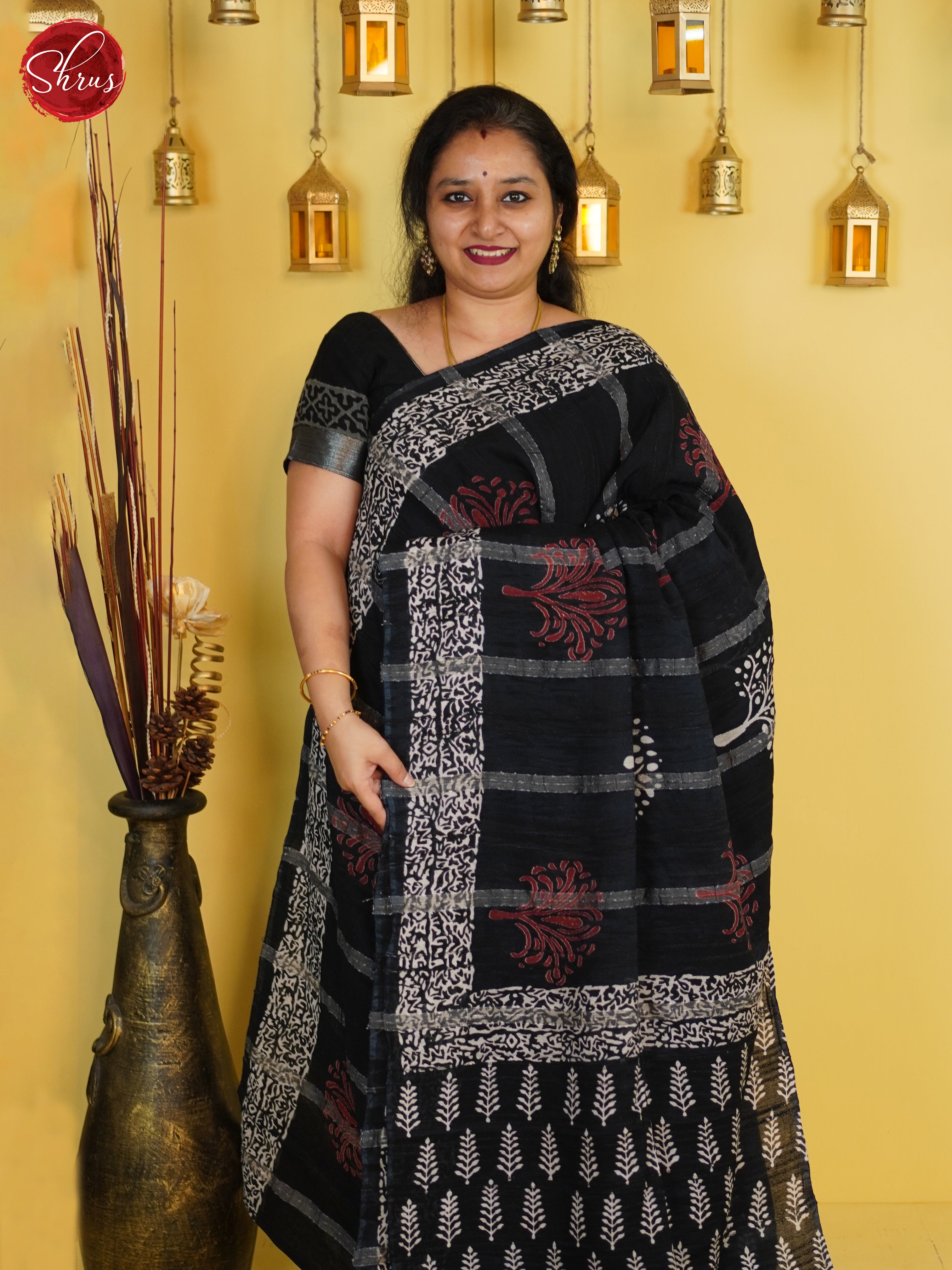 Pretty Black Linen Cotton sarees enchants with floral print on the body & bounded with self printed border. The self pallu with zari stripes & floral print . Comes with self printed blouse gives a perfect fit