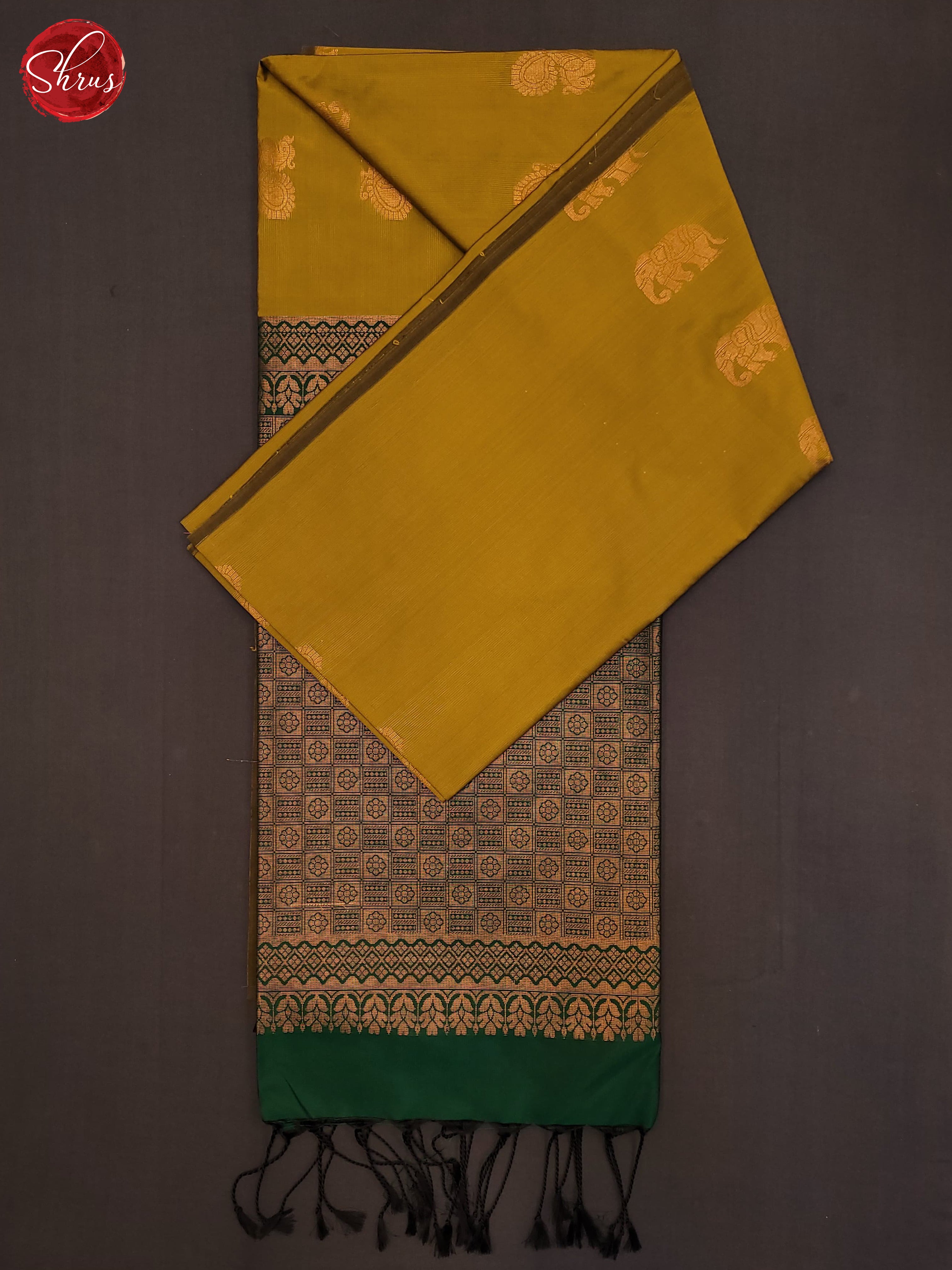 Pretty Mehandi Green Semi soft Silk saree enchants with gold zari woven elephant , peacock motifs on the body .The rich contrast Green zari woven brocade Pallu adds elegance . Attached with green blouse with border completes The ensemble