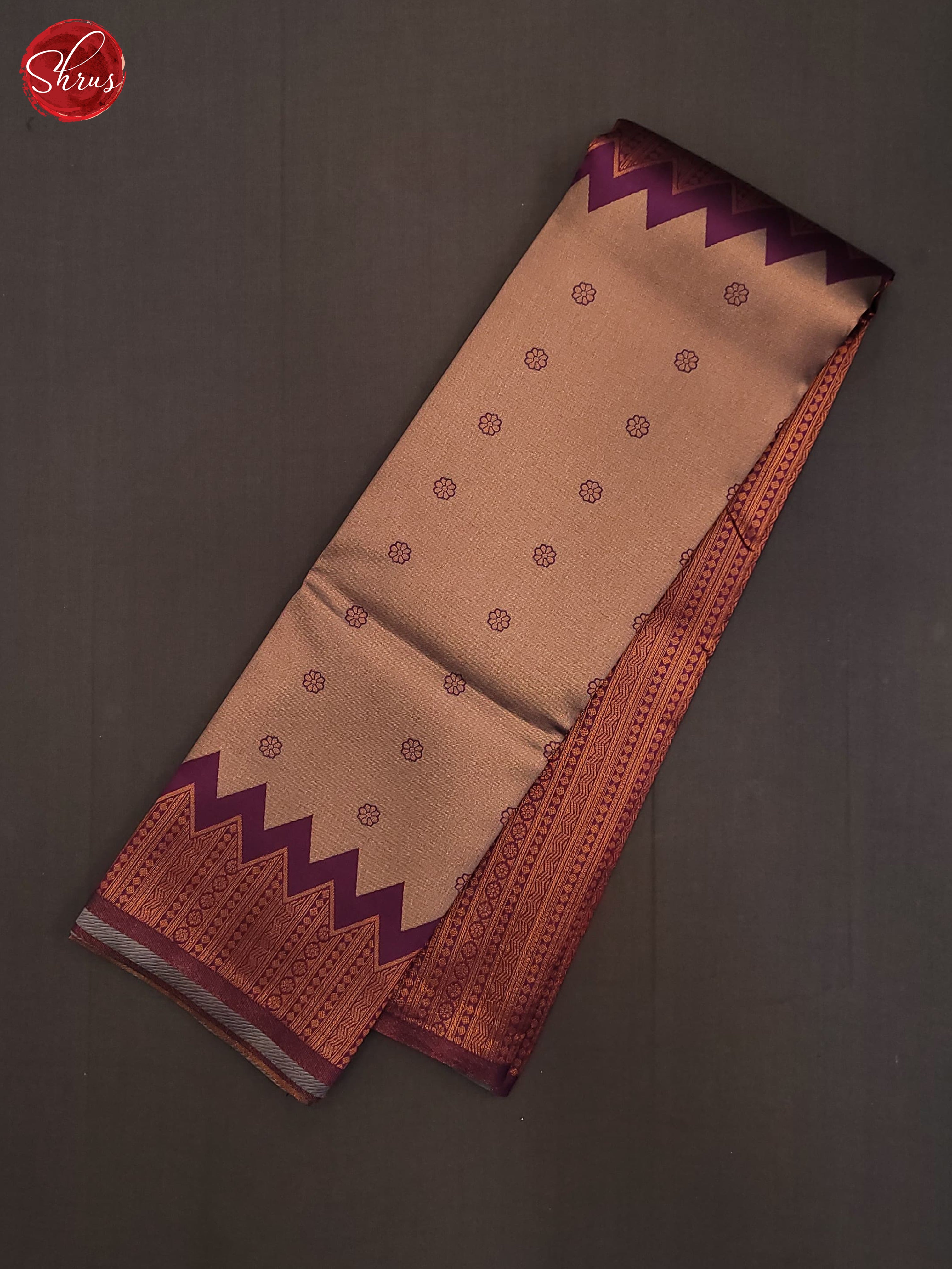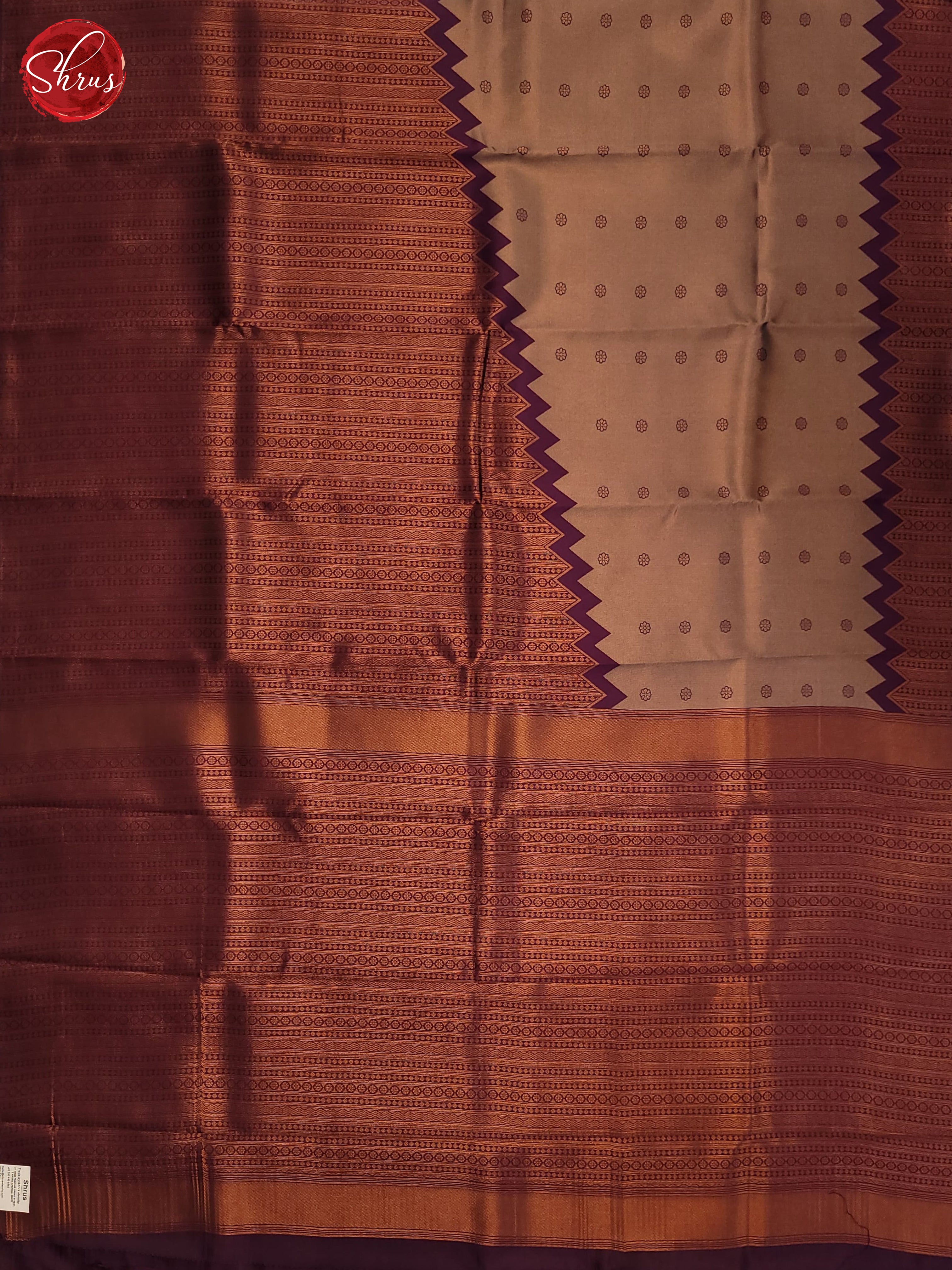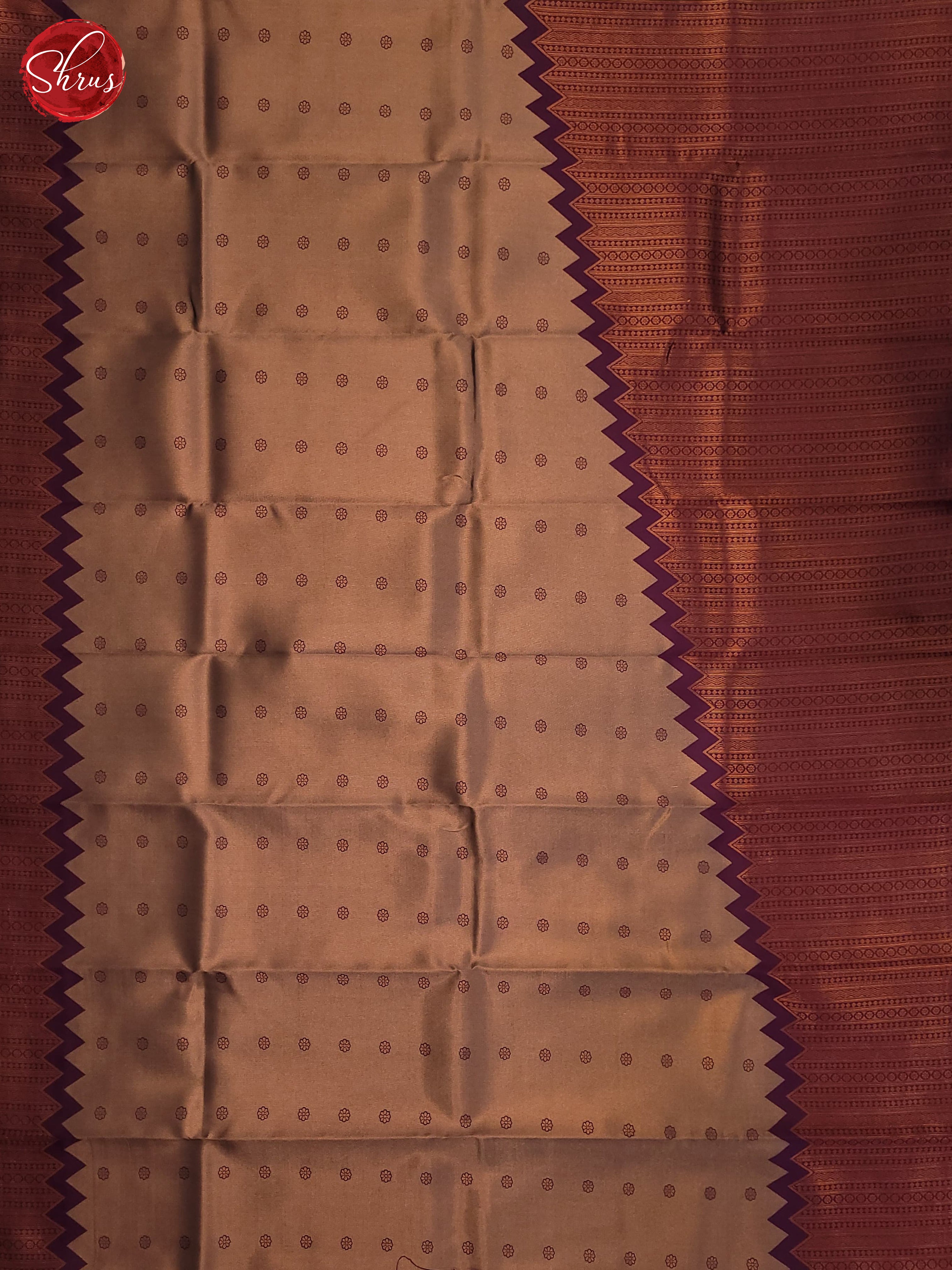Pretty Light Brown Semi Tissue Saree enchants with zari buttas Body & Bounded with Wine half & Half zari woven border . Comes with Contrast Wine zari brocade Pallu & Blouse with zari border complement beautifully