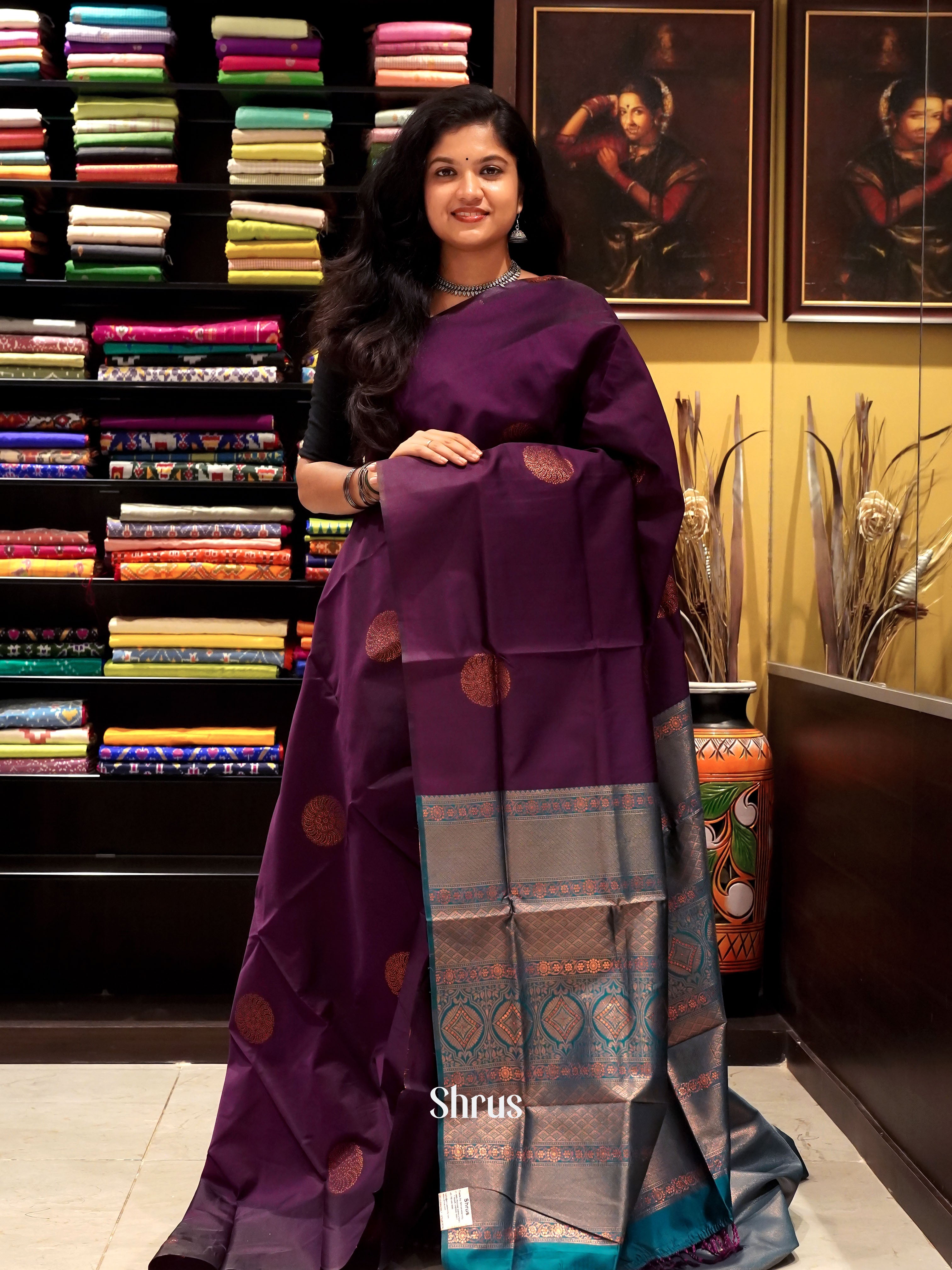Pretty purple Semi soft Silk saree enchants with gold zari woven floral motifs on the body .The rich contrast green zari woven brocade Pallu adds elegance . Attached with zari green blouse with border completes The ensemble