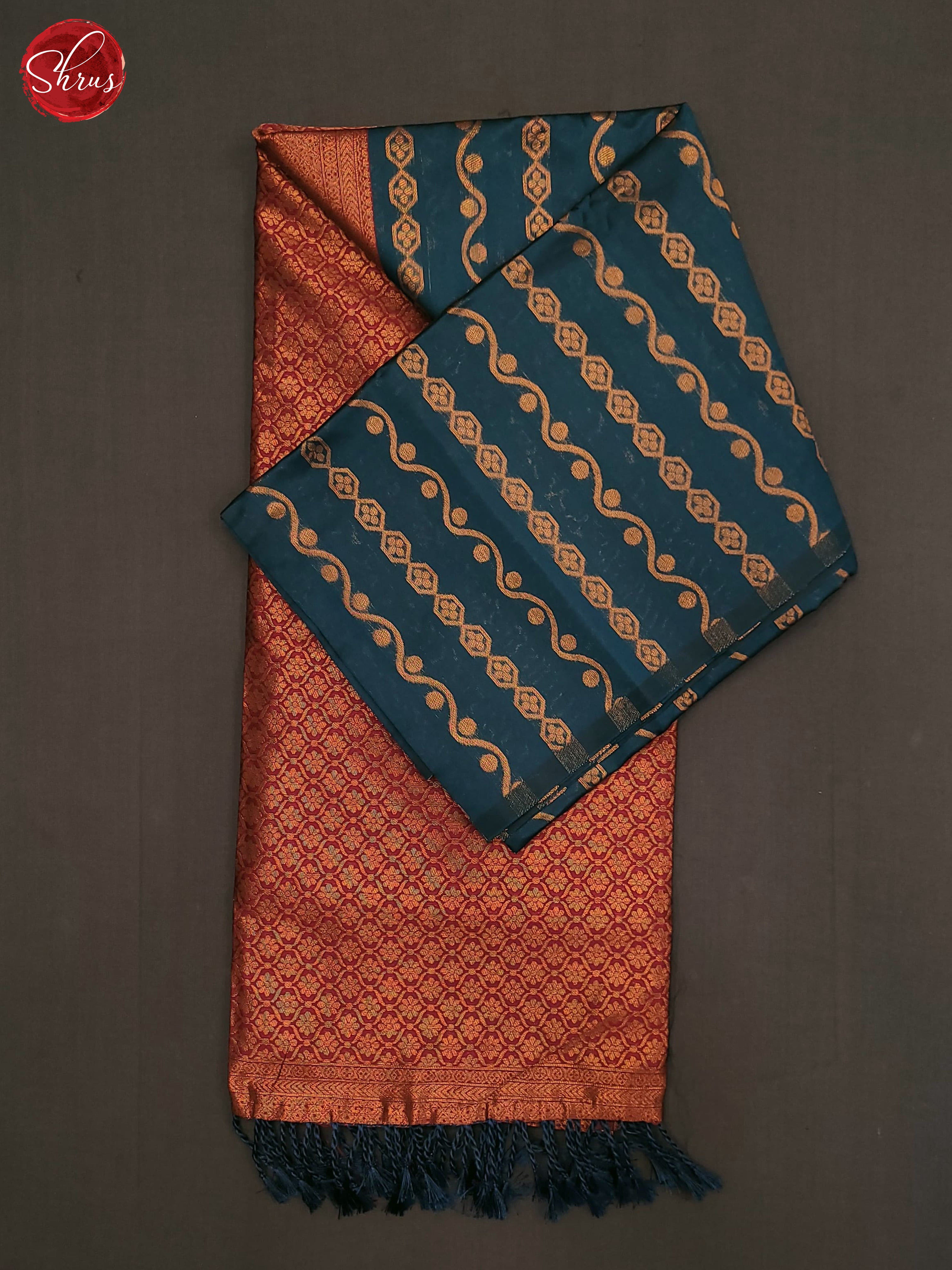 Pretty German blue Semi soft Silk saree enchants with gold zari woven floral stripes on the body .The rich contrast Maroon brocade Pallu adds elegance . Attached with zari butta Maroon blouse with border completes The ensemble