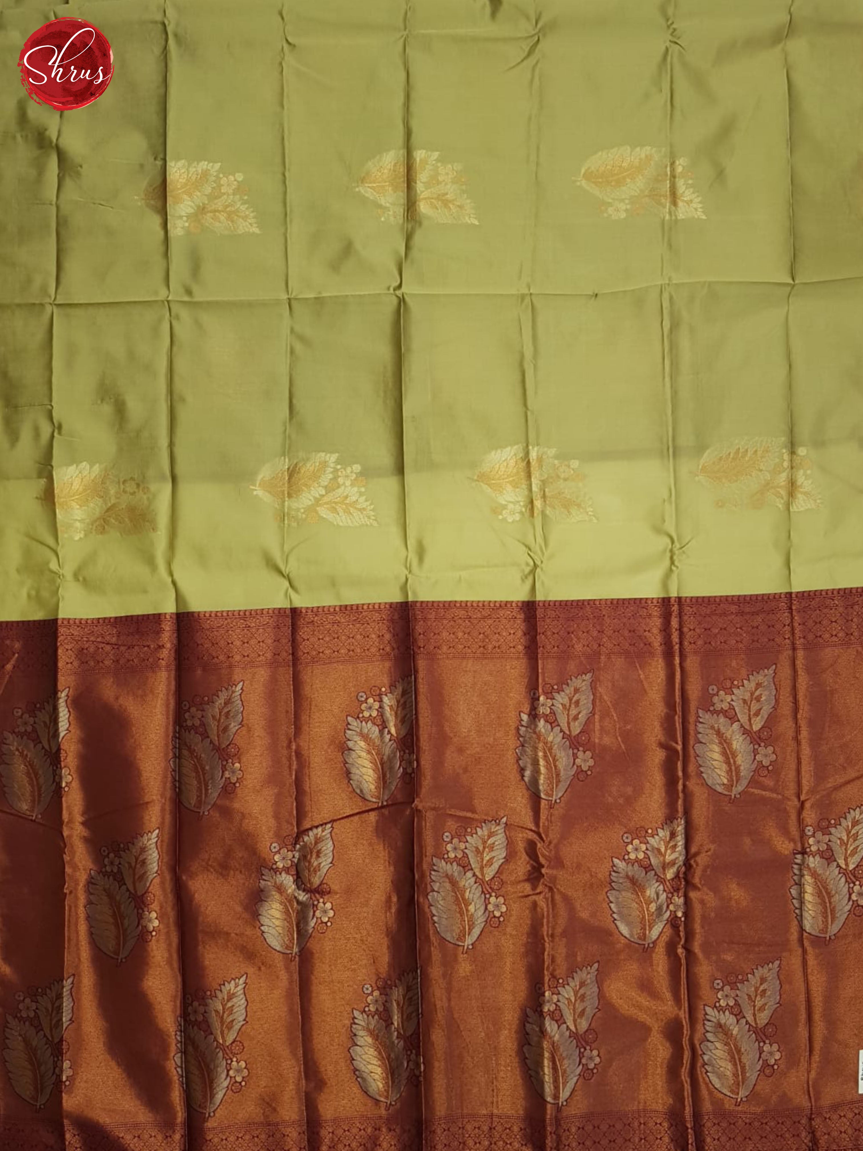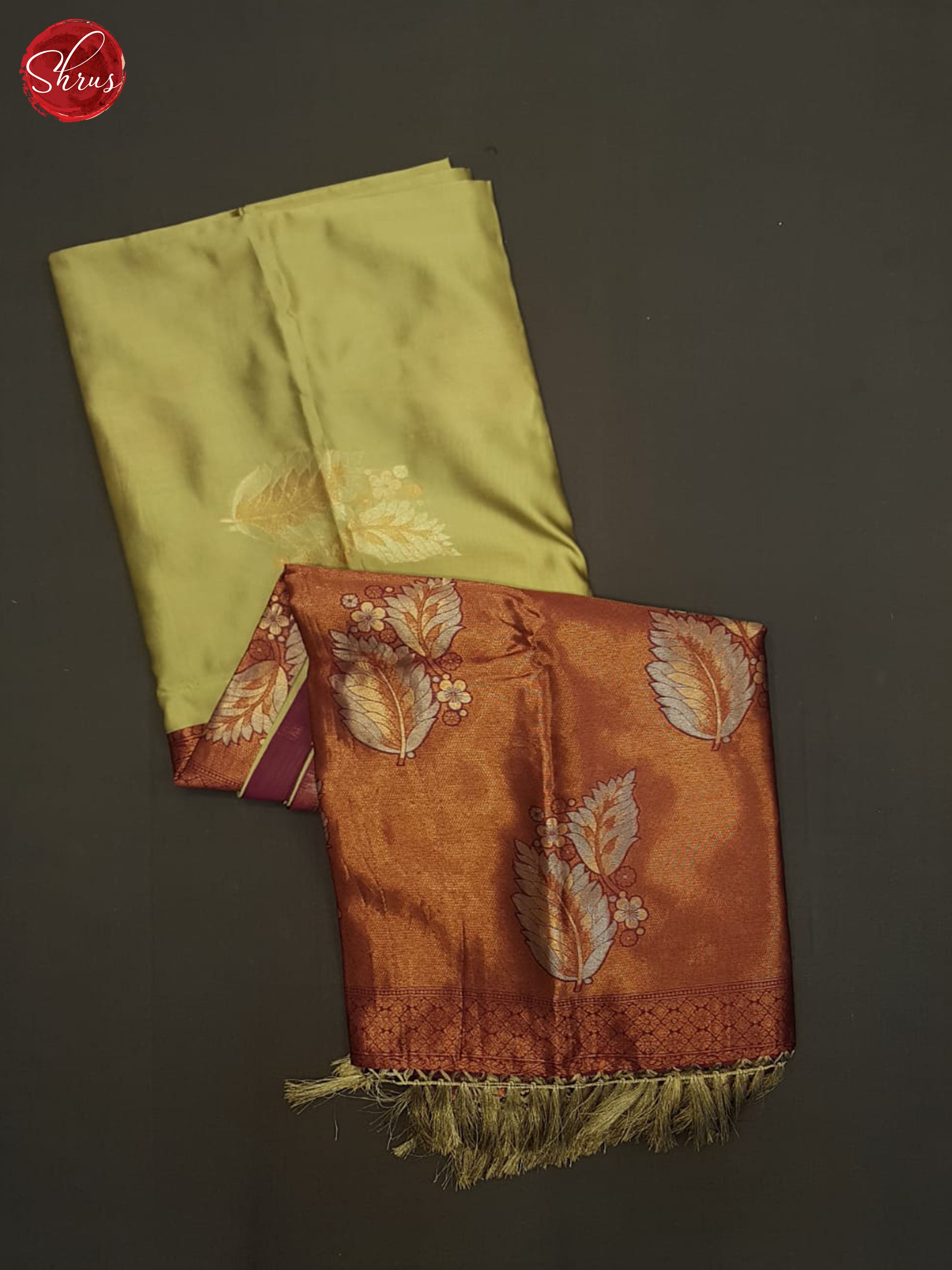 Pretty elachi green Semi Silk saree enchants with zari woven floral motifs on the body .The rich contrast wine zari woven brocade Pallu adds elegance . Attached with zari butta wine blouse with border completes The ensemble