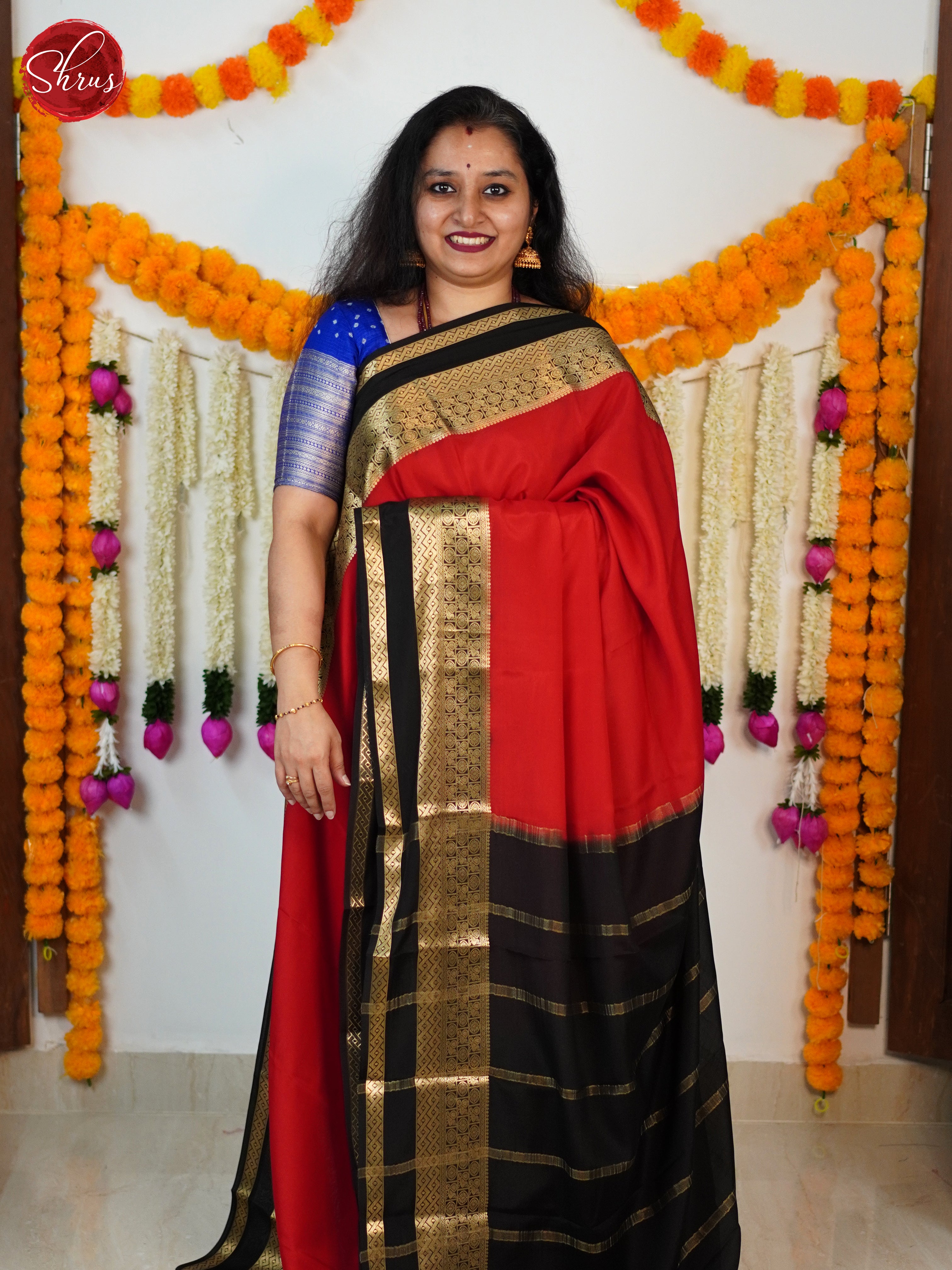 Pretty Red Mysore Silk Saree enchants with plain body & bounded with Green zari border . The contrast Green striped pallu complements. The Green plain blouse with Zari border is a beautiful finish.