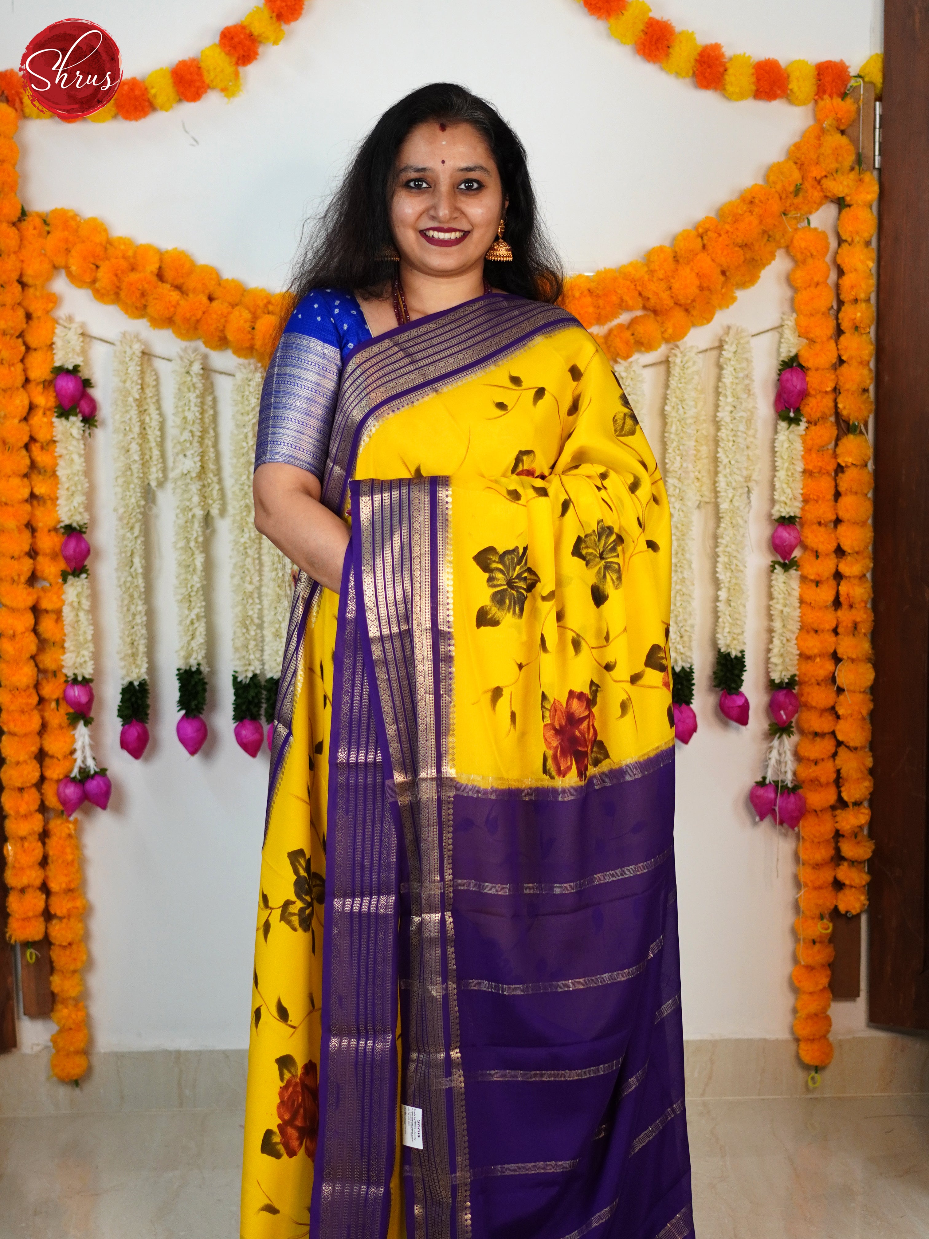 Bright Yellow Mysore Silk Saree enchants with floral print on the body & bounded with Purple zari border . The contrast Purple striped pallu complements. The Purple plain blouse with Zari border is a beautiful finish.