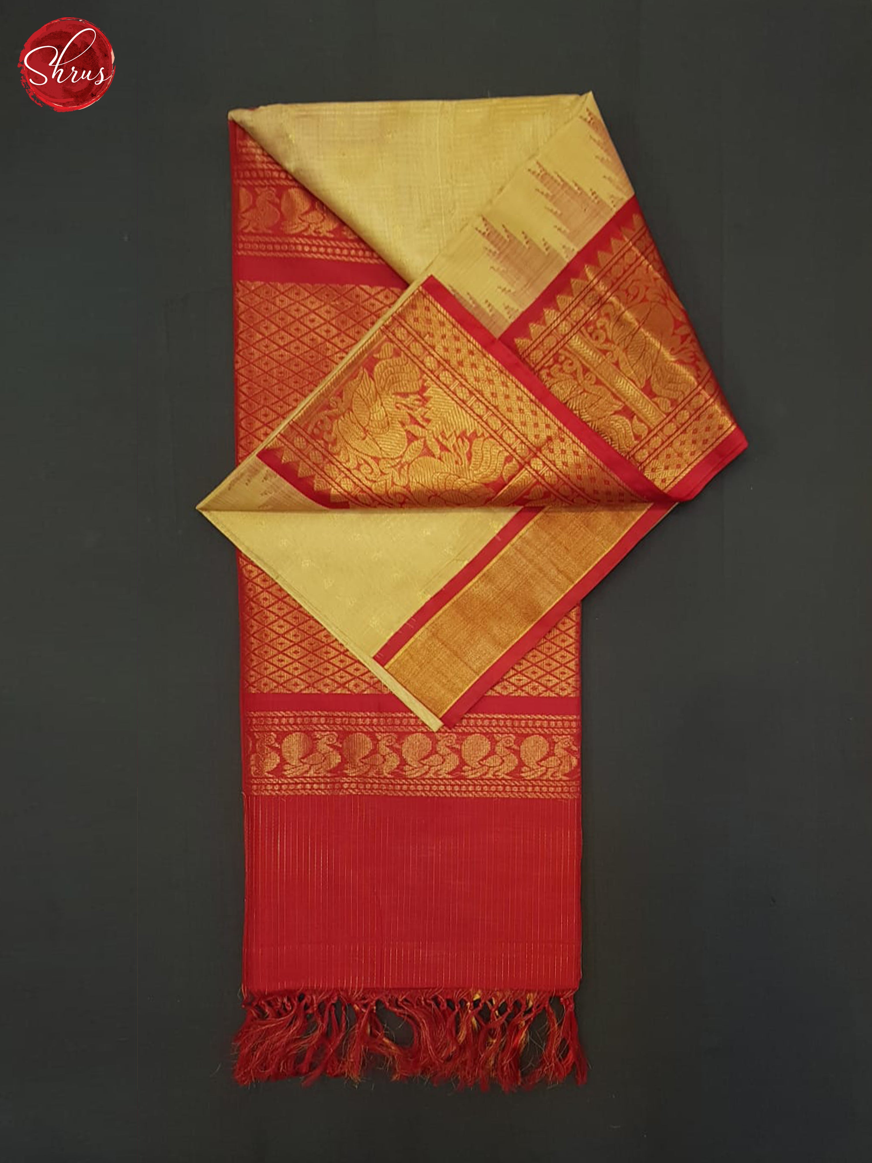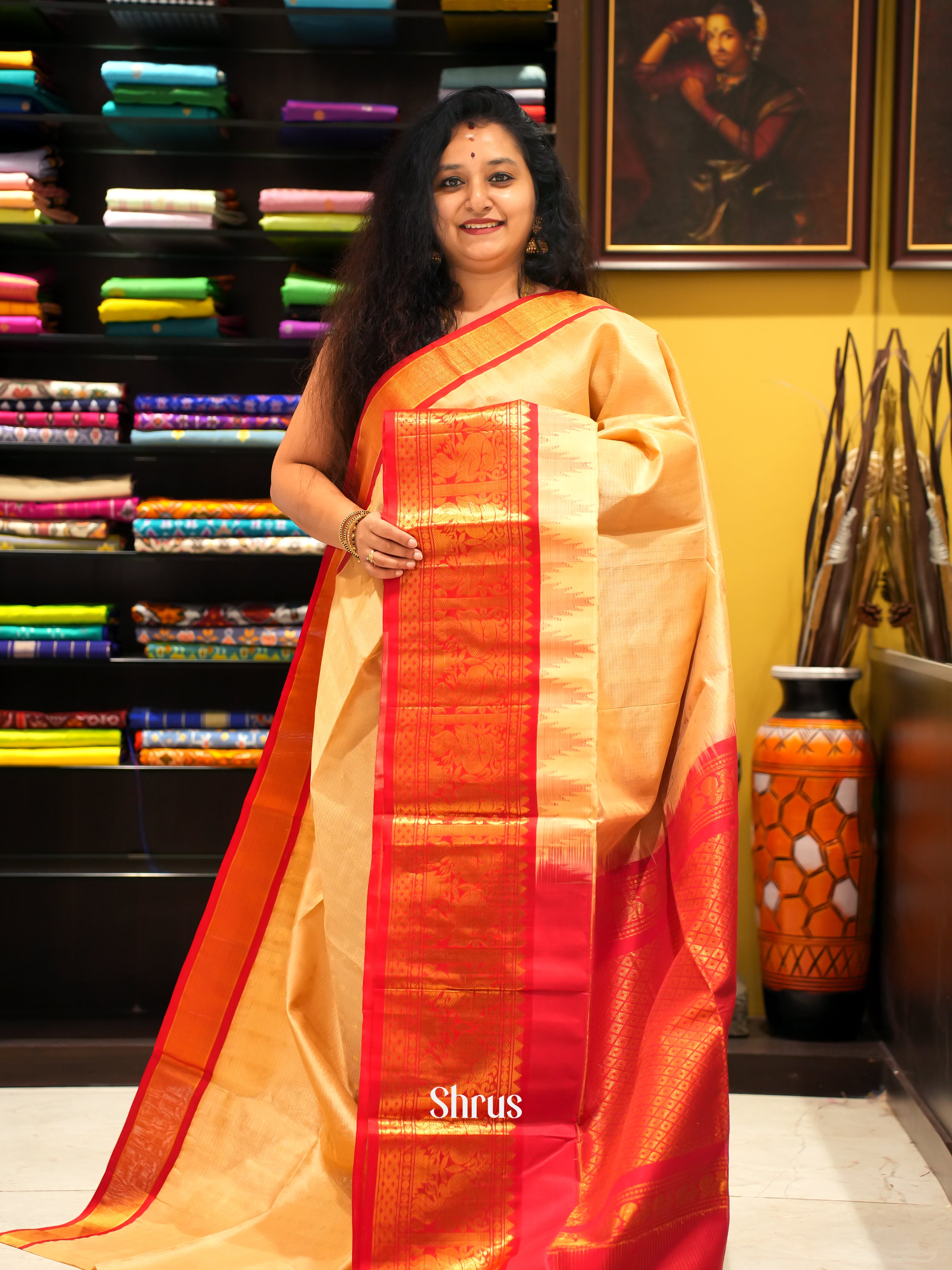 Very Pretty Beige Silk Cotton Saree enchants with plain Body & bounded with Red zari border gives a classy look .The Splendid Contrast Red zari woven pallu & plain blouse with border lends compliments