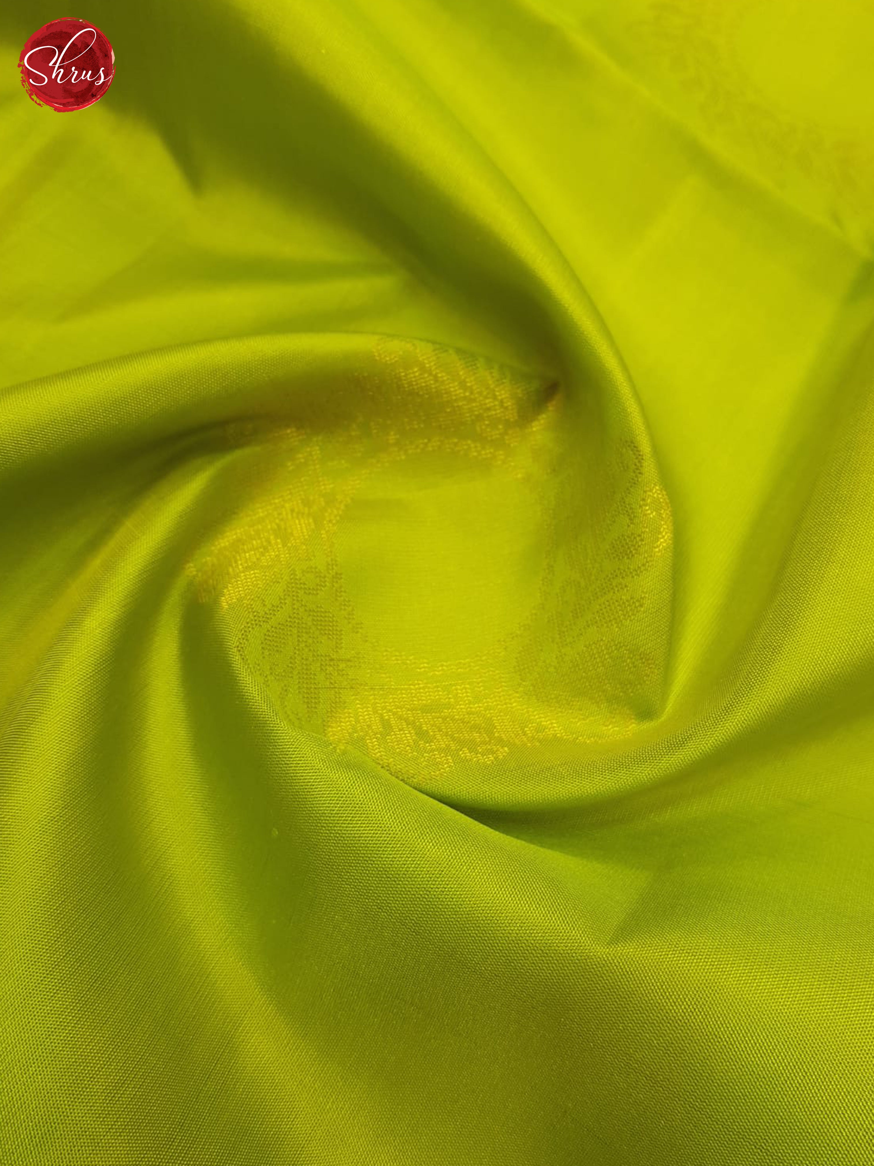 Sizzling gold zari floral motifs cast a sublime sheen to this lime Greenn Soft Silk Saree. The chic weave is complemented with a Contrast blue zari woven pallu The blue plain blouse with zari border is a beautiful finish.