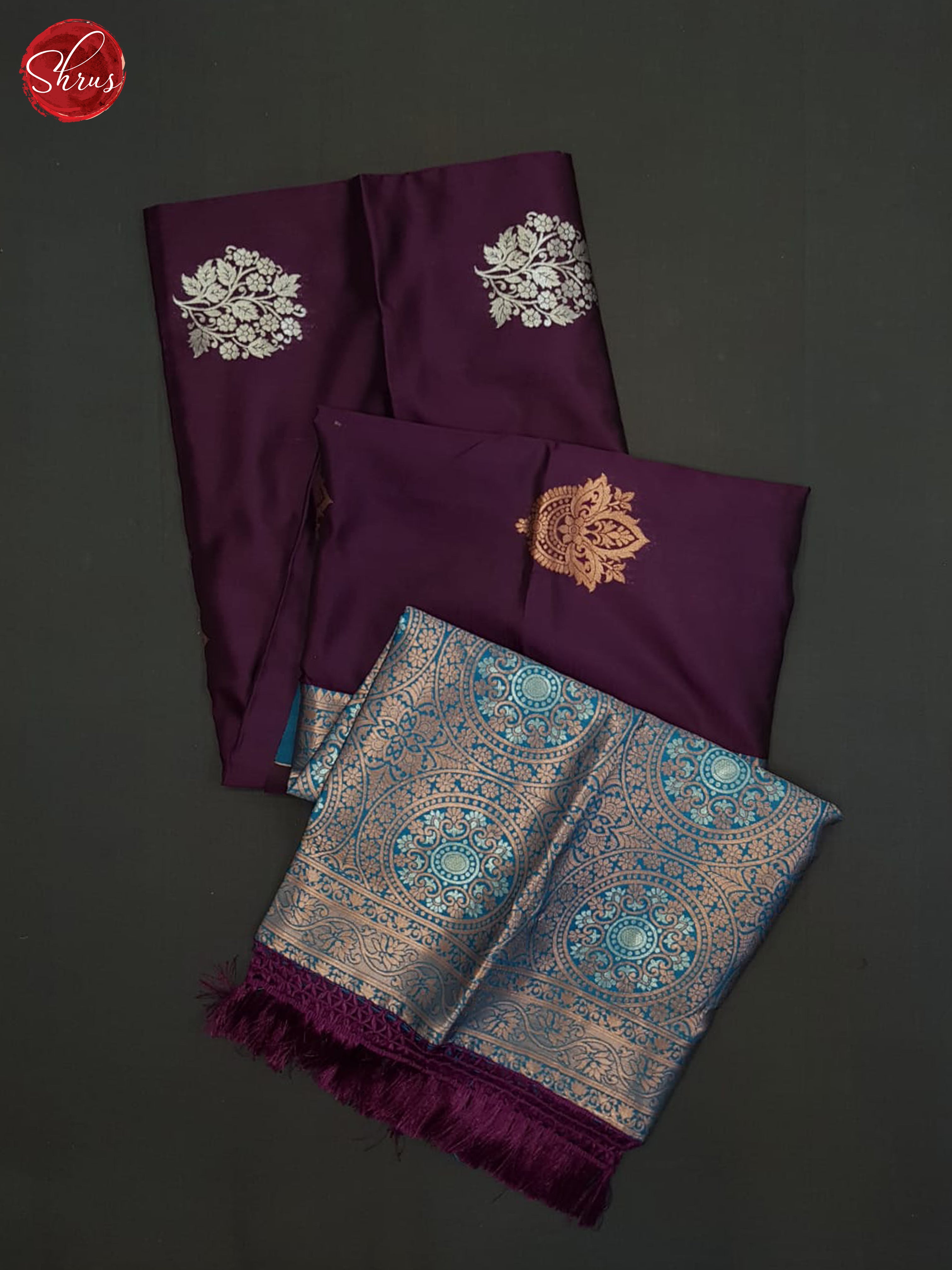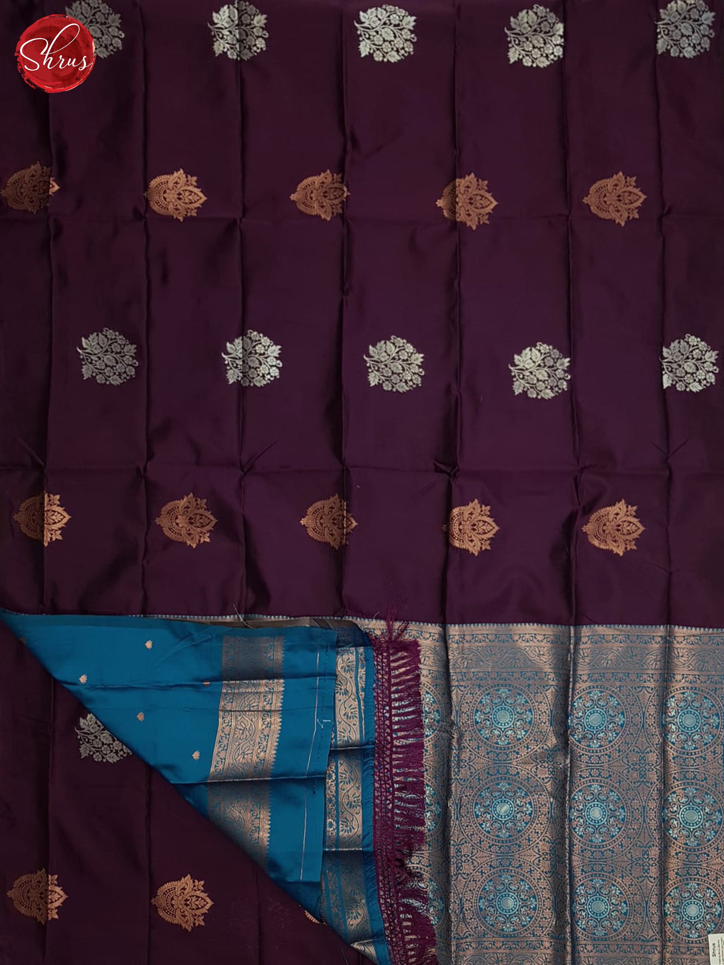 Pretty wine Semi soft Silk saree enchants with gold,silver zari woven floral motifs on the body .The rich blue zari woven brocade Pallu adds elegance . Attached with zari butta blue blouse with border completes The ensemble