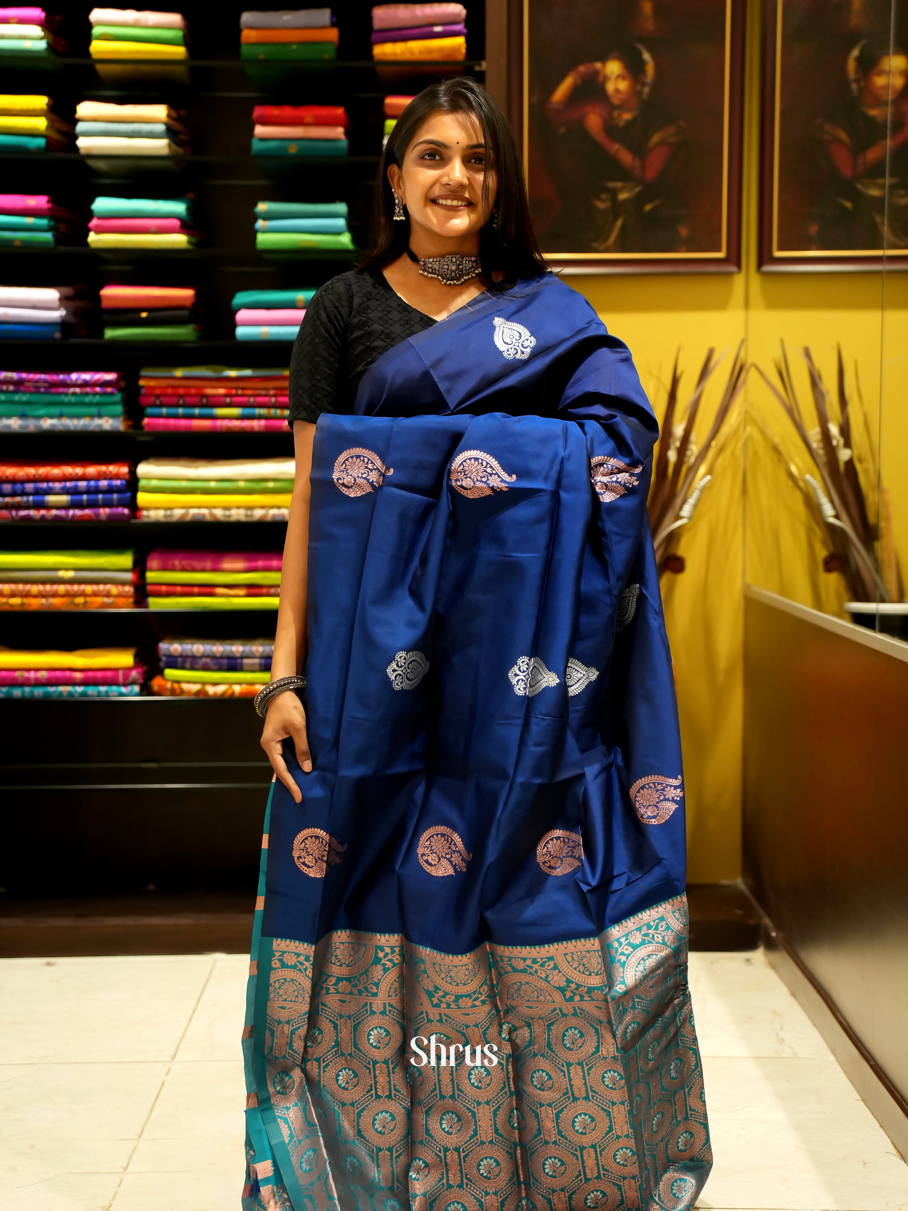 Blue And Peacock Green- Semi soft silk saree