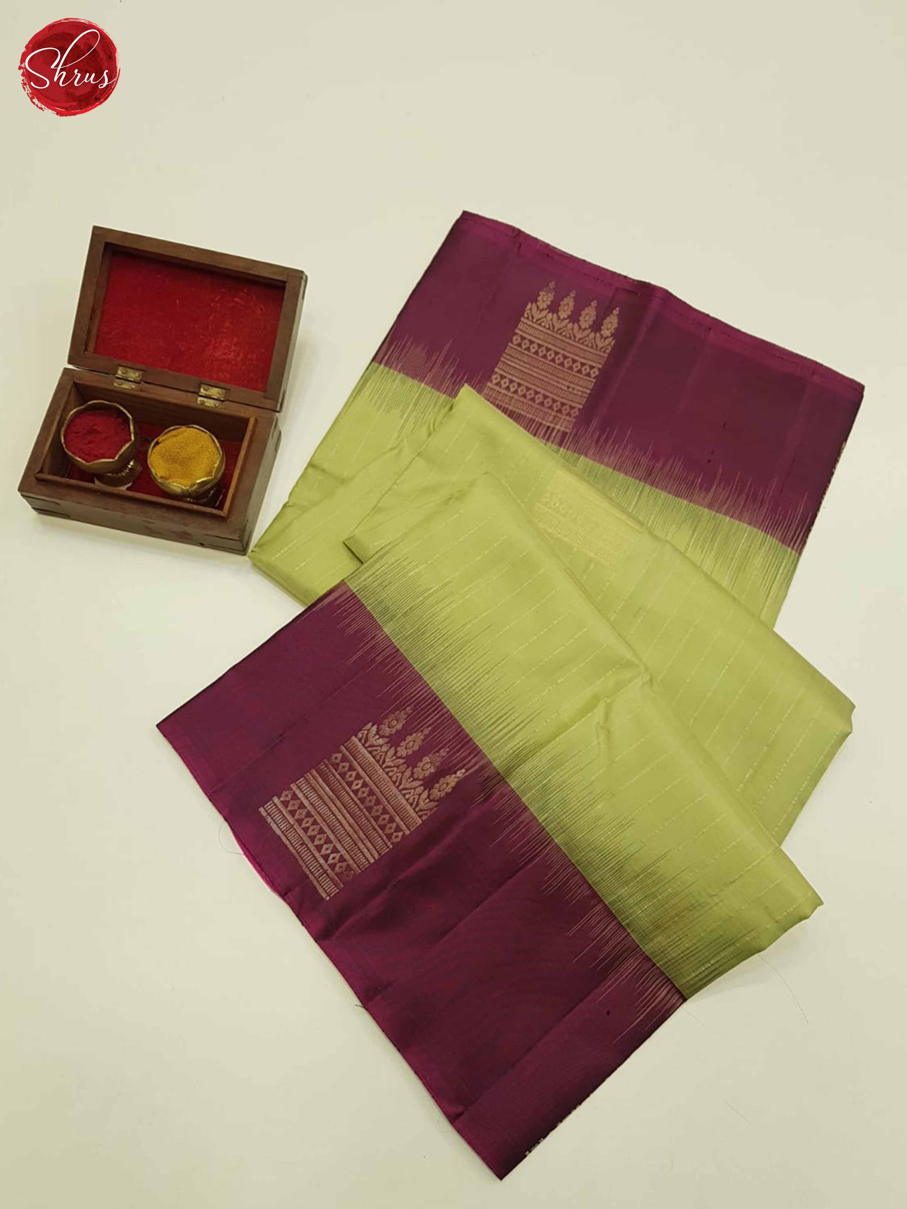 Beautifully chic Green soft silk Saree gleams with gold zari block motifs on the body . The contrast wine zari border and the contrast zari woven pallu with brocade accentuate the timeless enamor. The plain wine blouse completes this ensemble