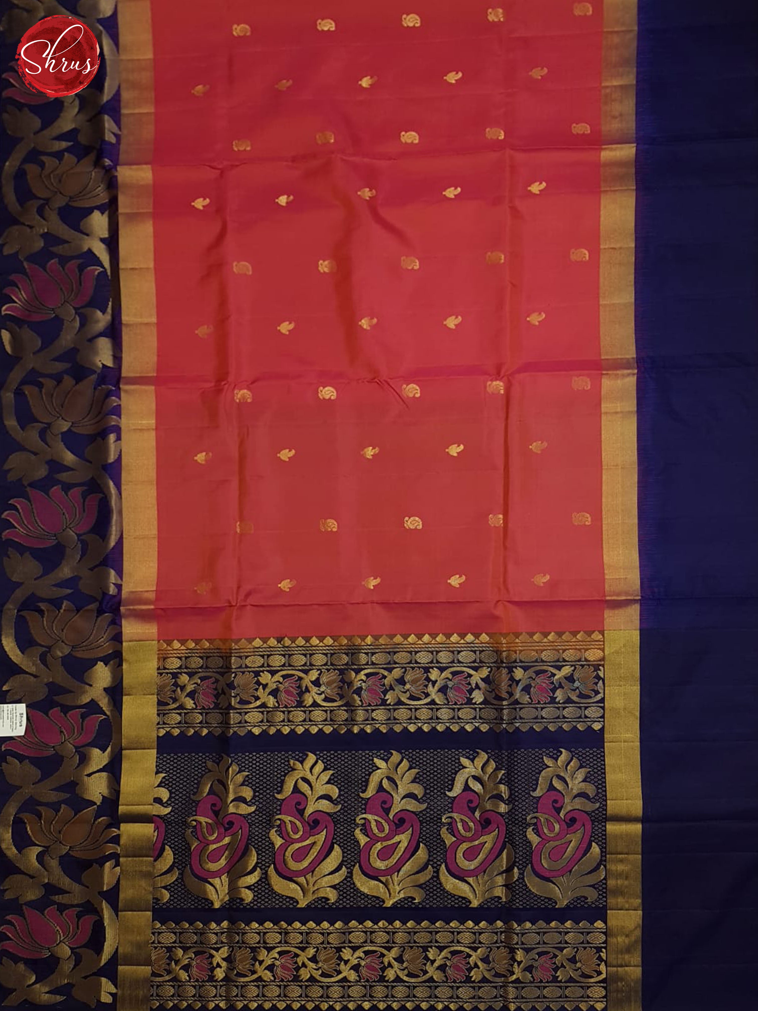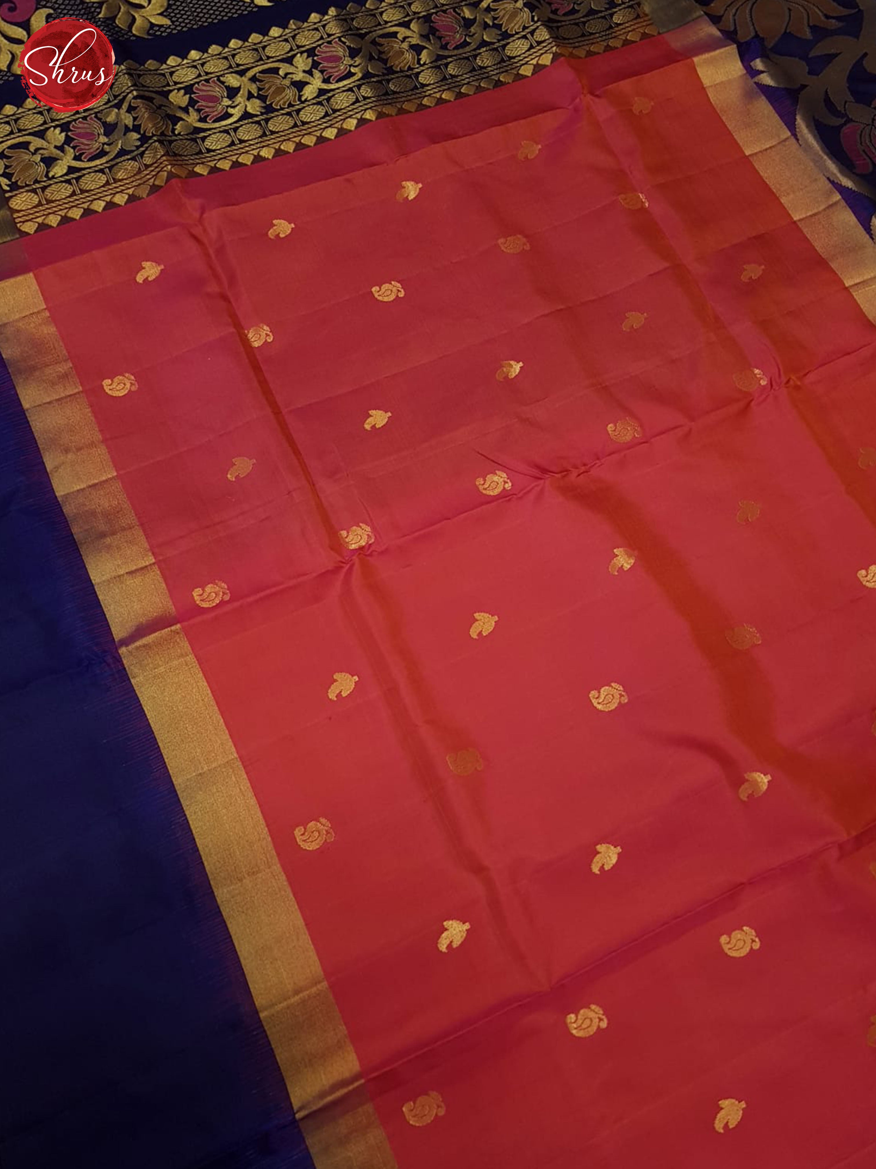 Beautifully chic Pink Soft Silk Saree enchants with gold zari woven buttas on the body . The delightful weave is beautifully complemented with a Blue zari brocade Border with floral vines . The rich Blue Zari woven Pallu with floral brocade And plain Blouse is a perfect finish.