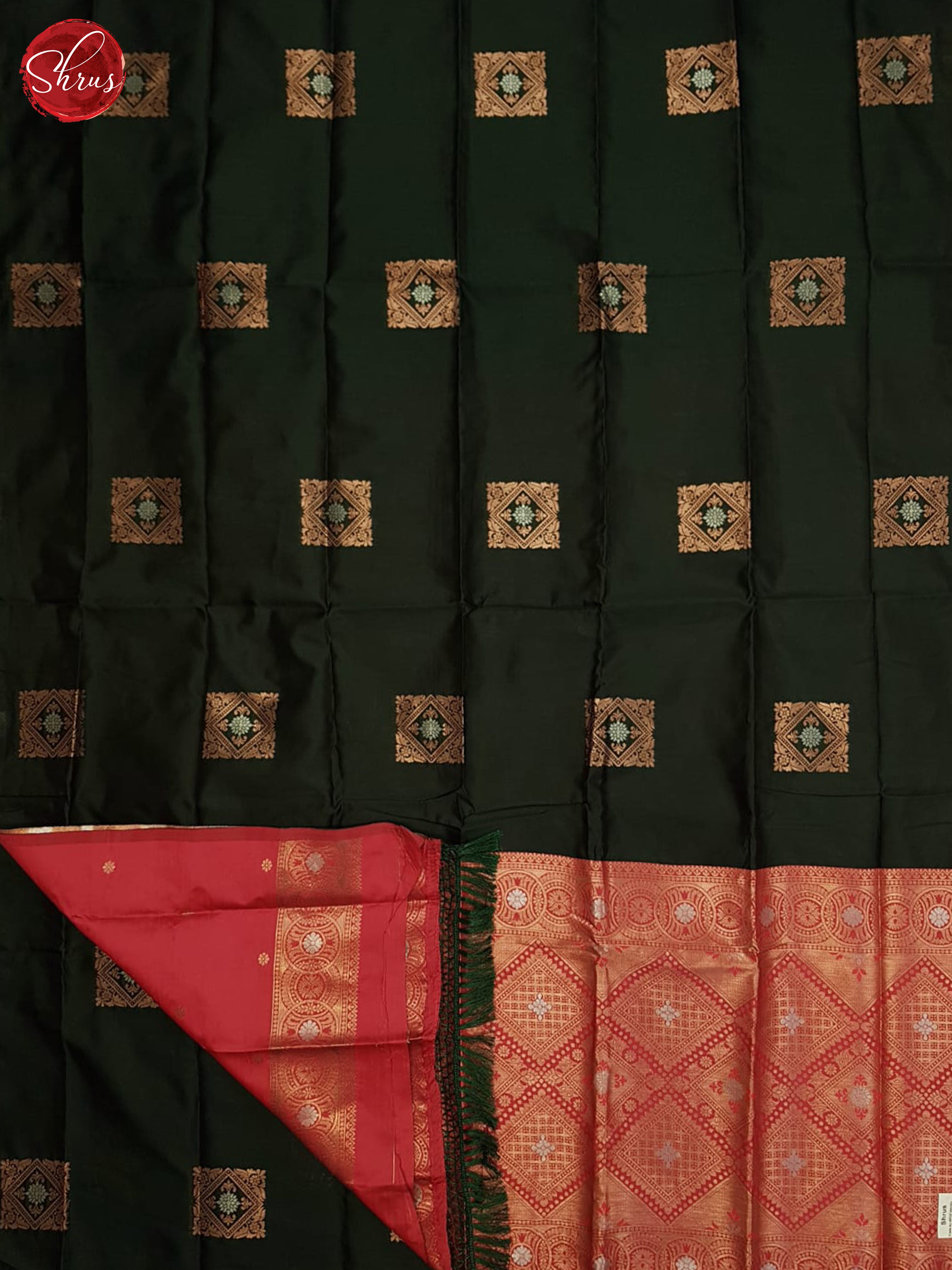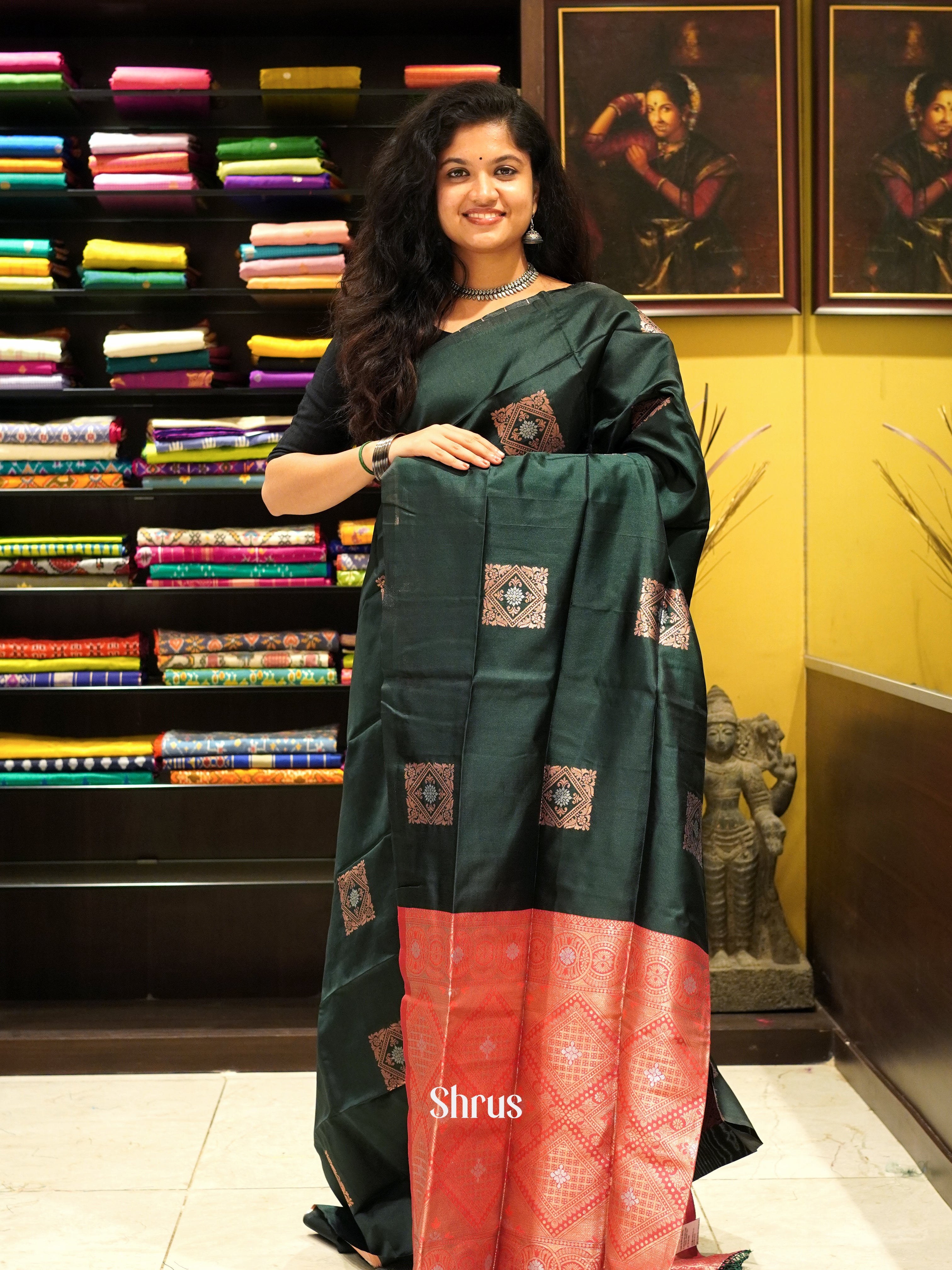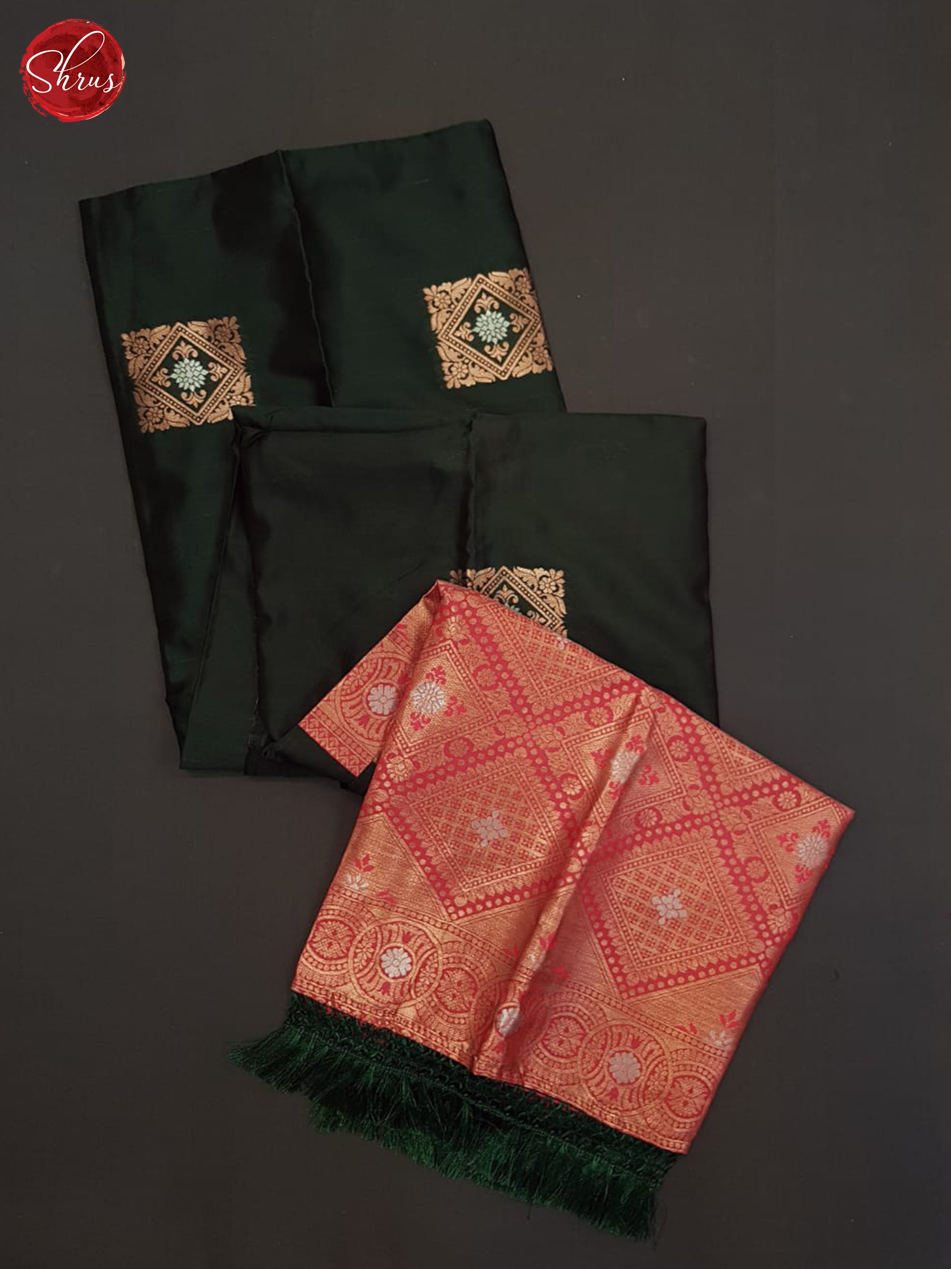Pretty Green Semi soft Silk saree enchants with gold zari woven block motifs on the body .The rich pink zari woven brocade Pallu adds elegance . Attached with zari butta pink blouse with border completes The ensemble