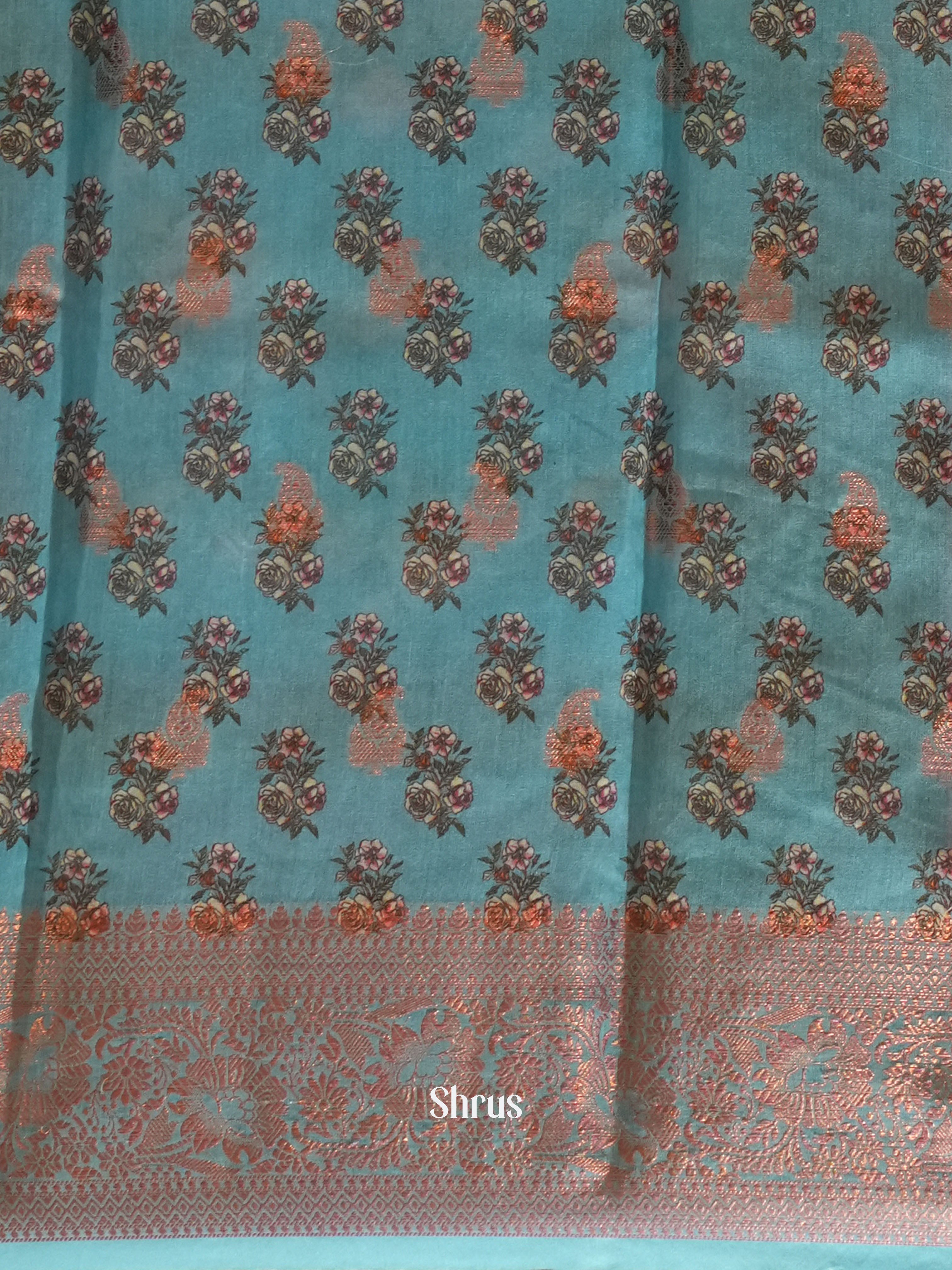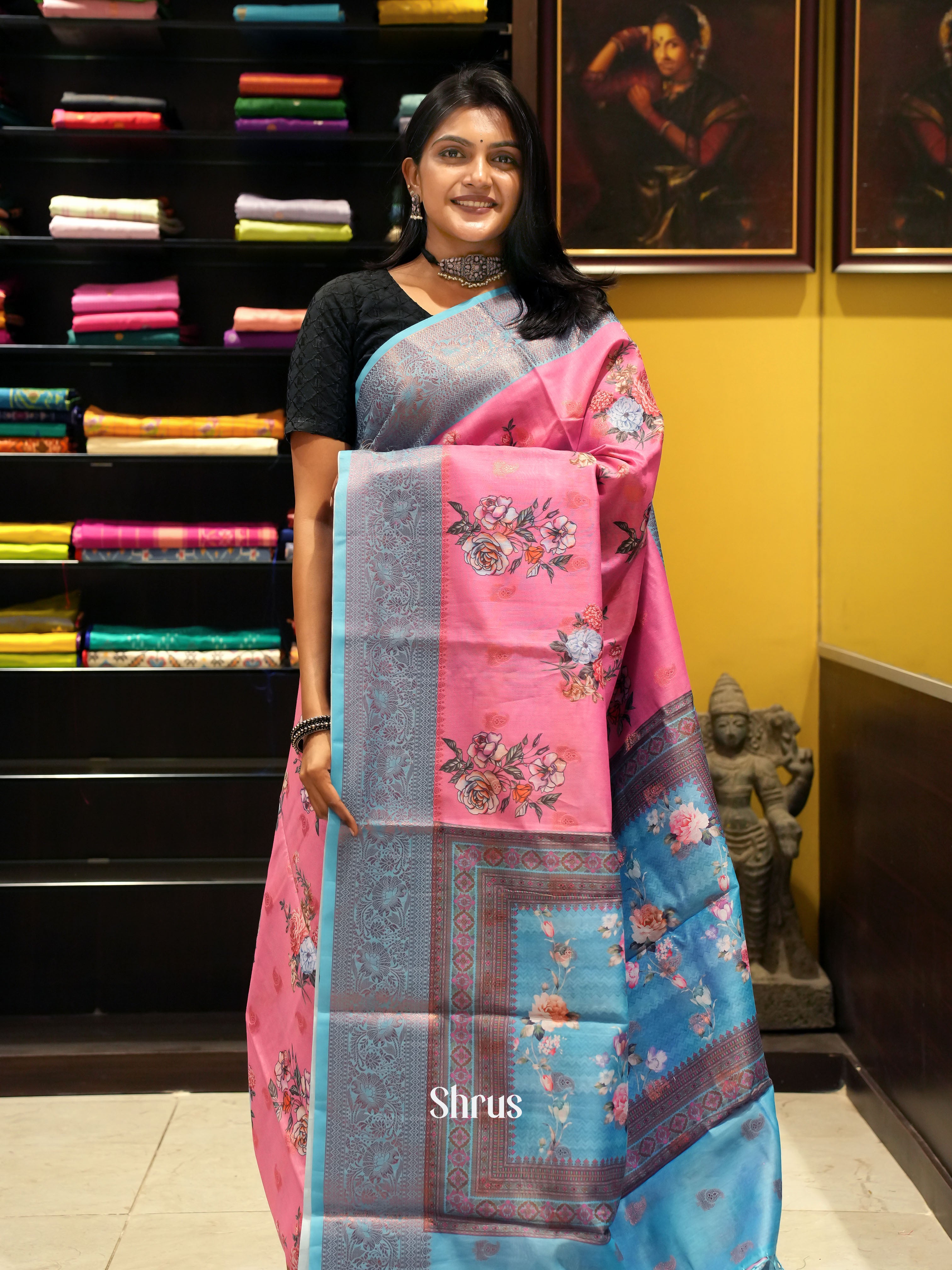 Pink & Blue - Semi Chanderi with floral print on the body & Zari Border