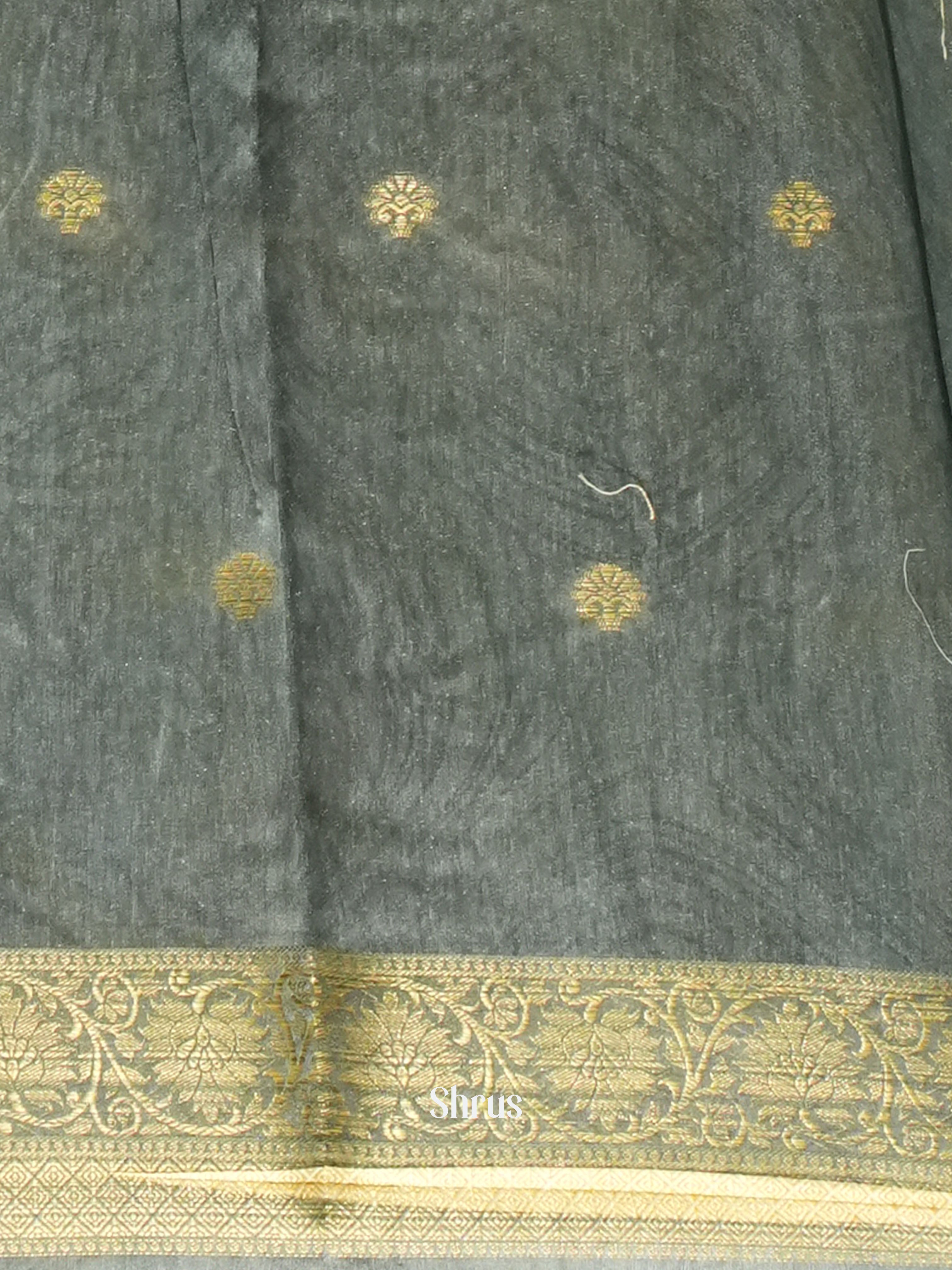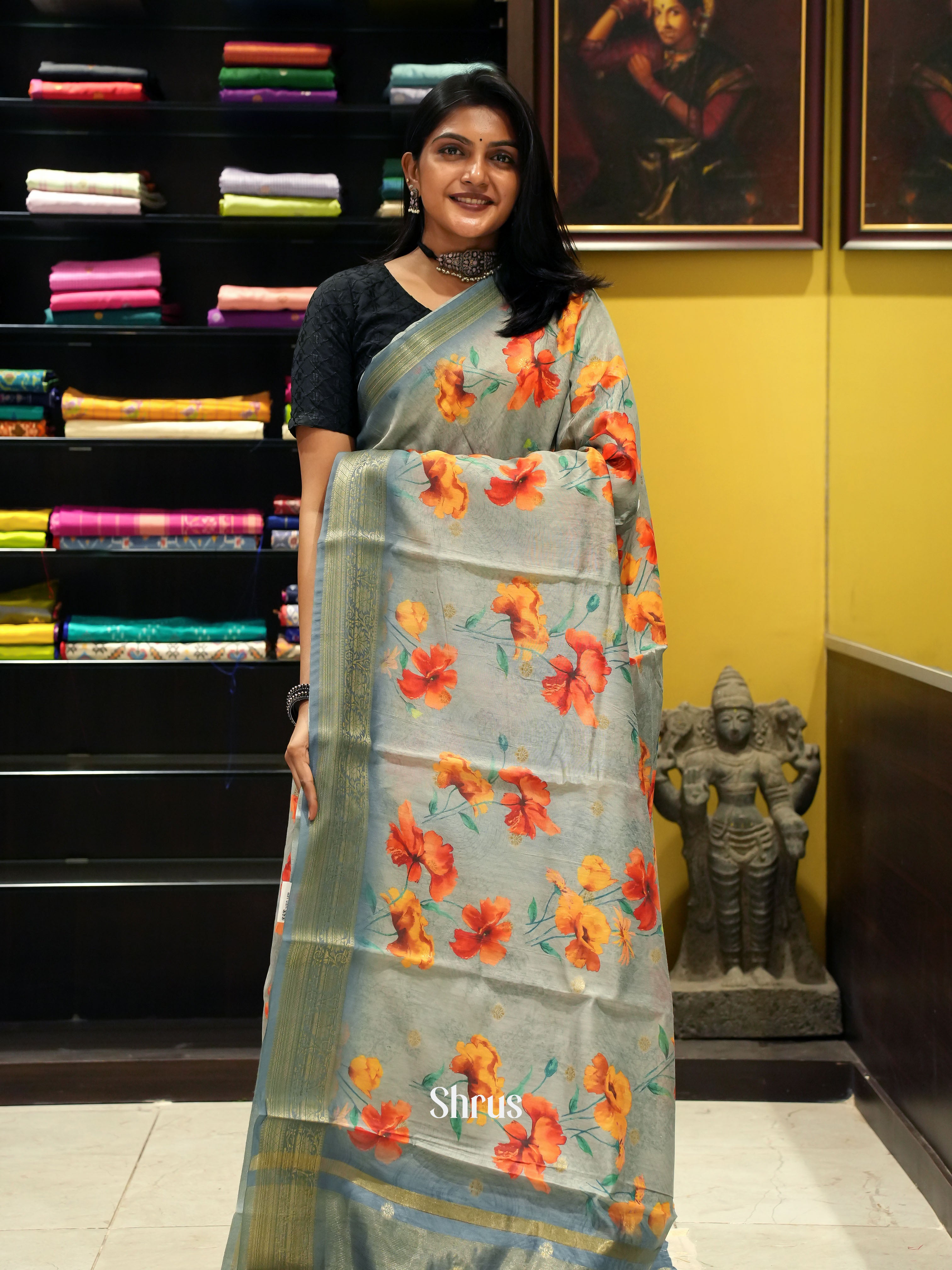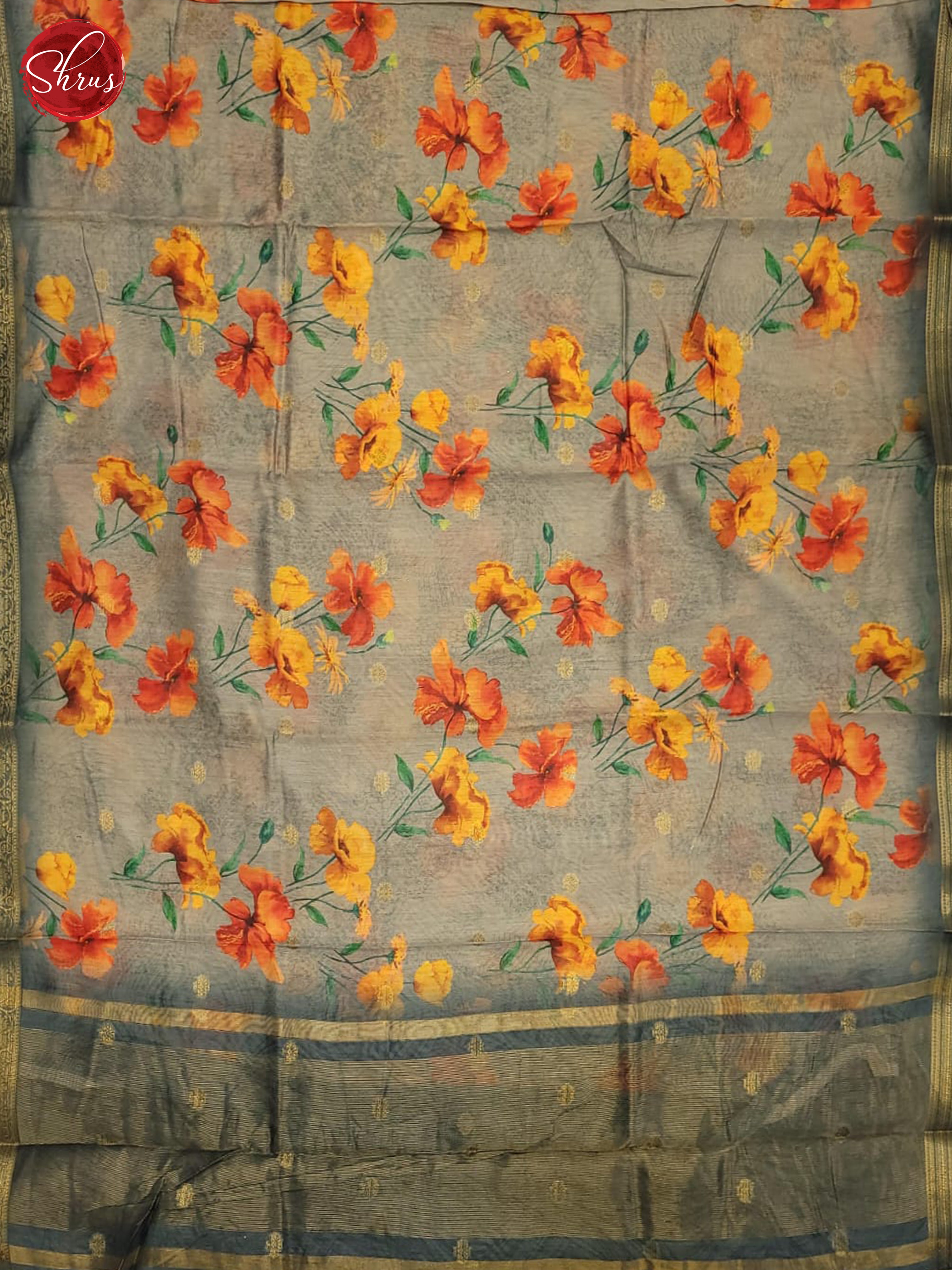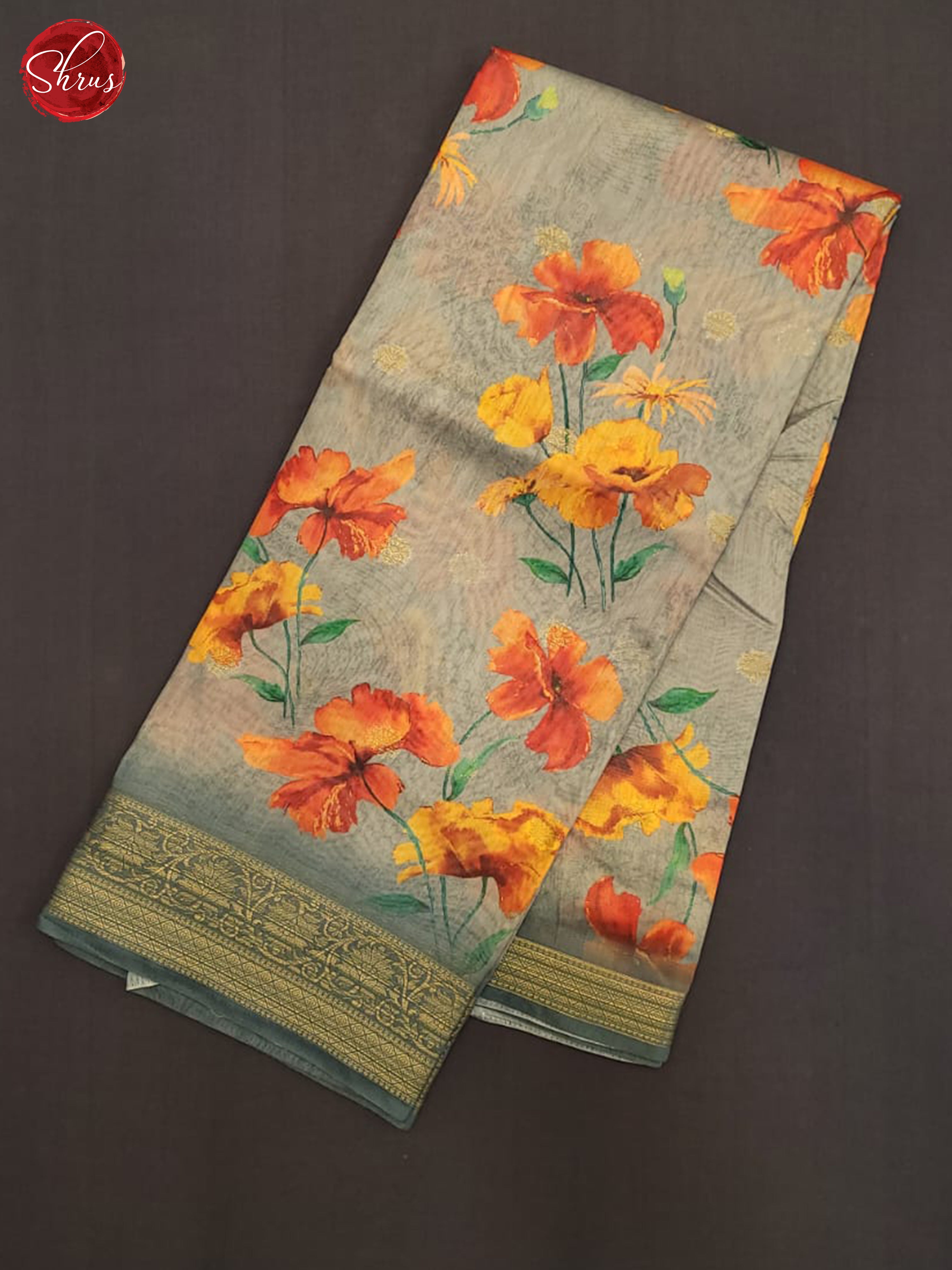 Elegant Grey Semi Chanderi printed saree with floral print, zari buttas on the body & bounded with self zari border The self zari pallu & blouse with border gives a perfect fit