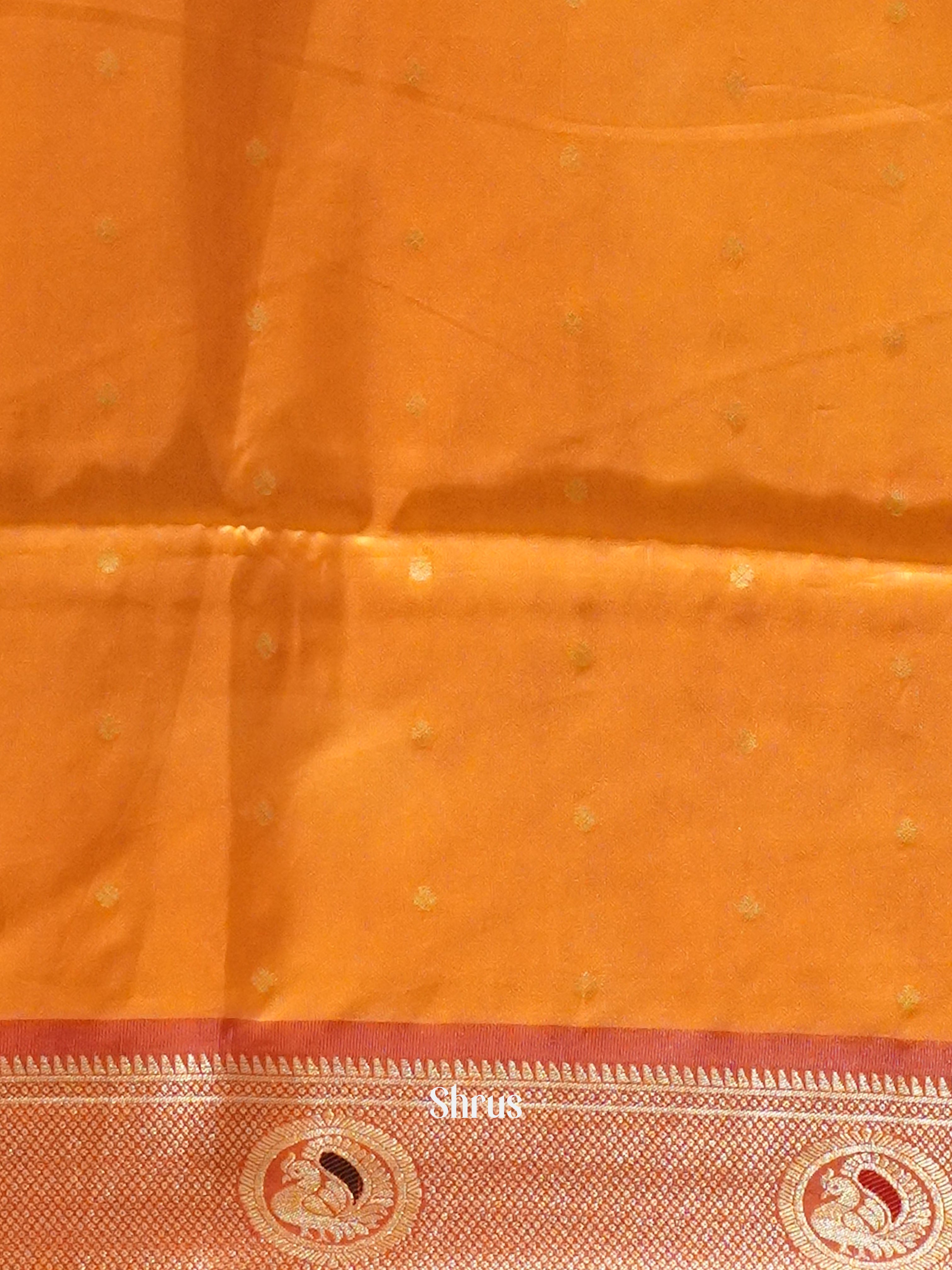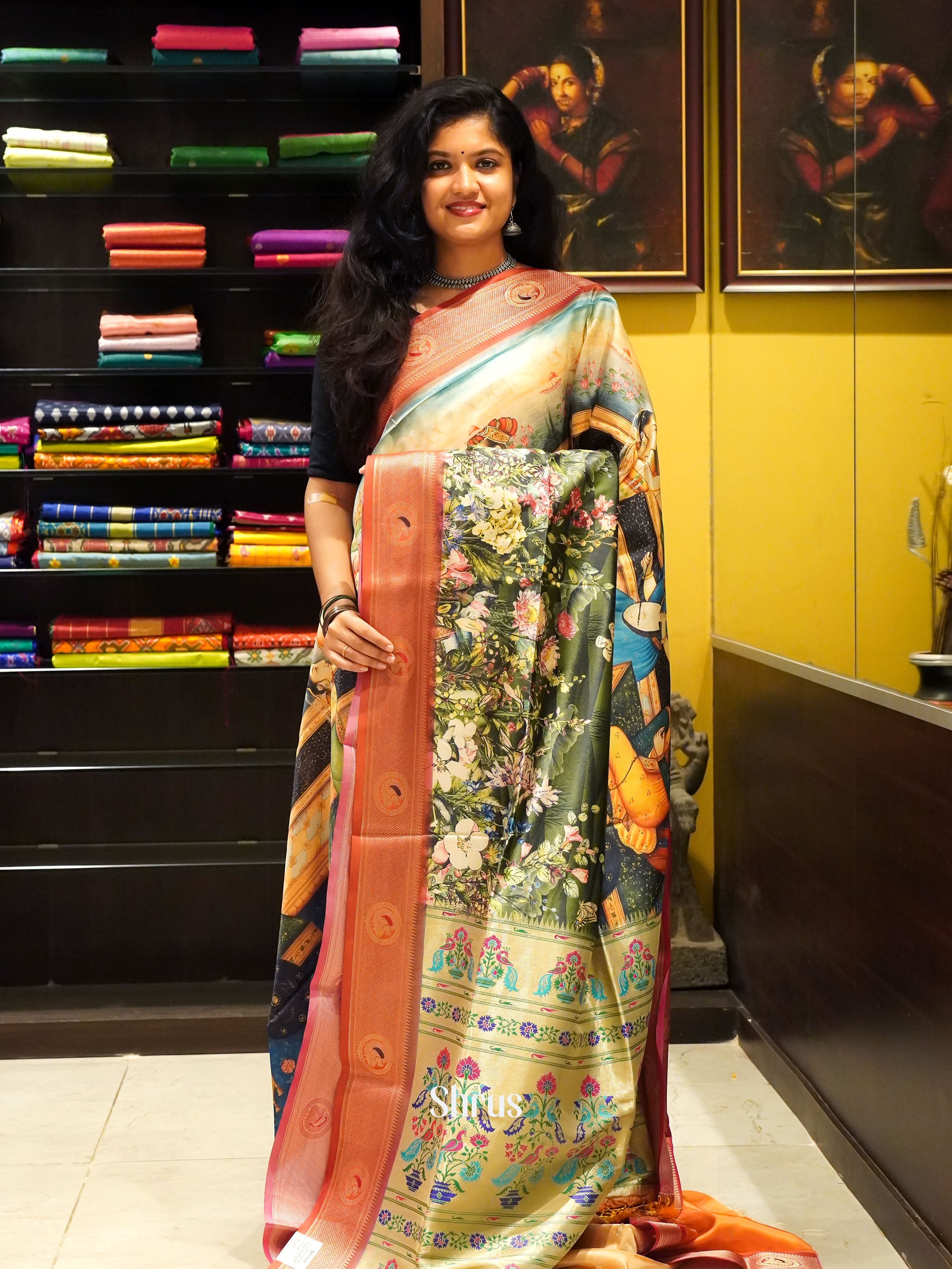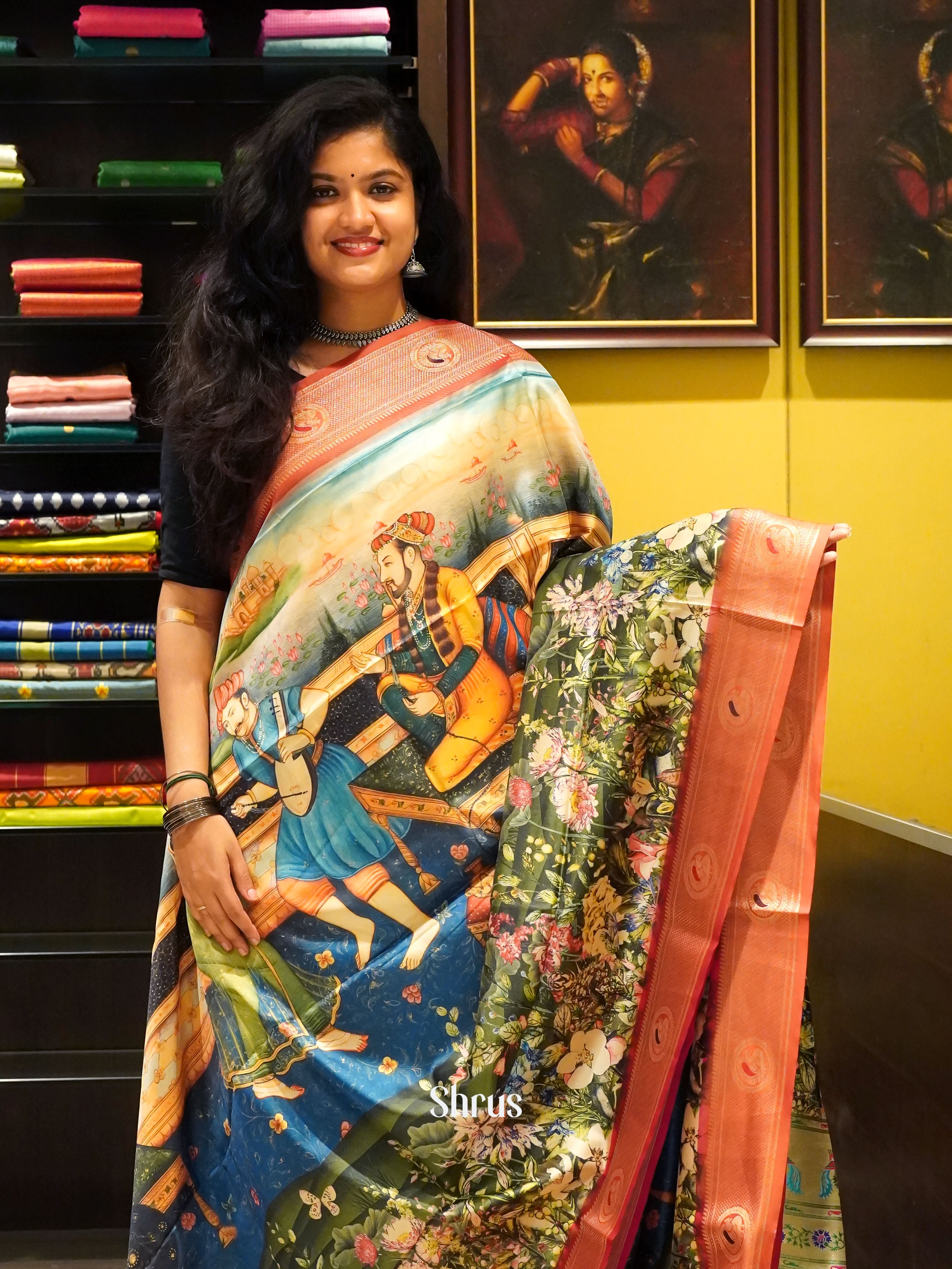 Blue & Orange -Semi Paithani with art printed body & Zari Border