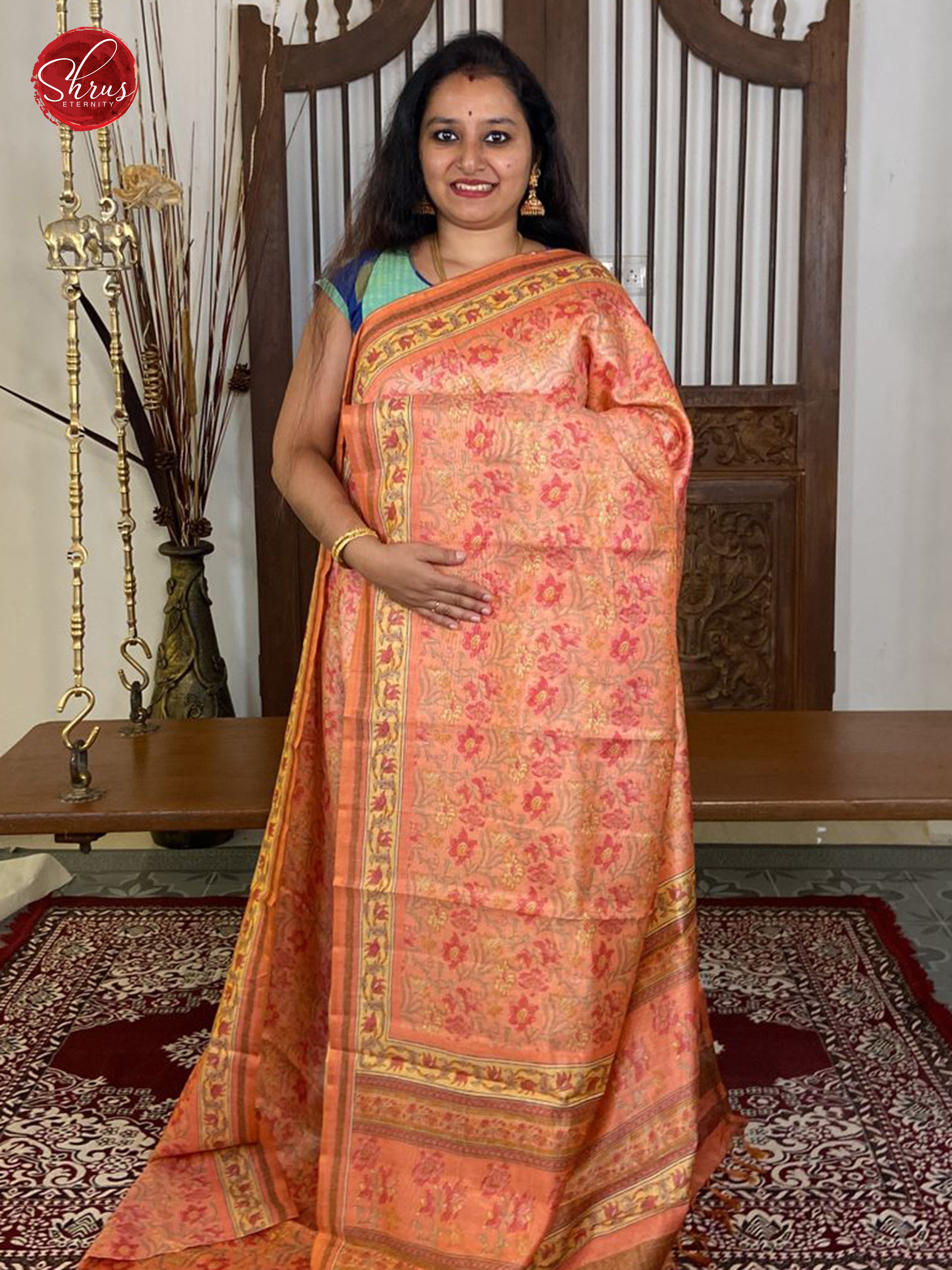 Peachish Pink & Yellow - Semi Gicha with floral print on the body & Border
