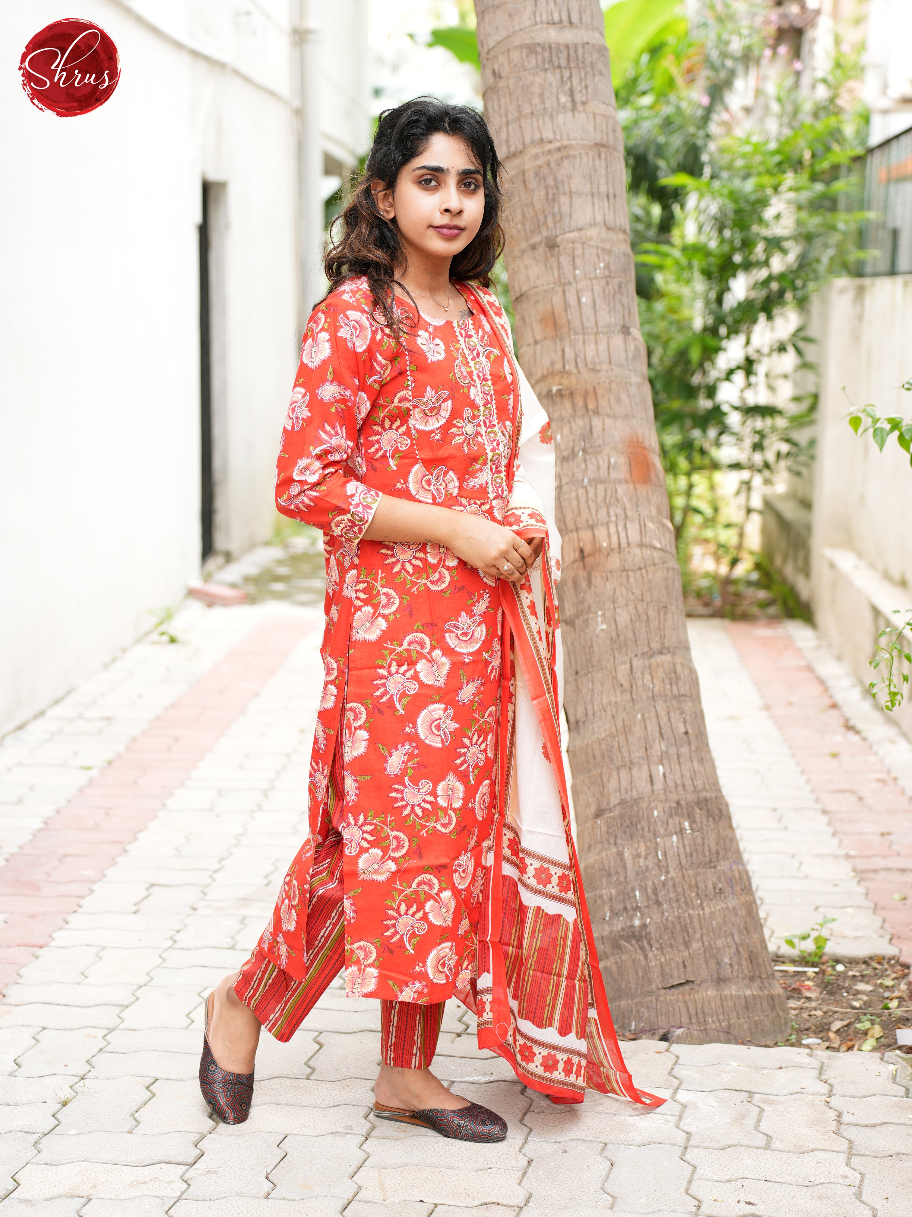 Pretty floral printed Red Readymade Cotton Salwar suit . Paired with lovely Red bottom & White Printed dupatta