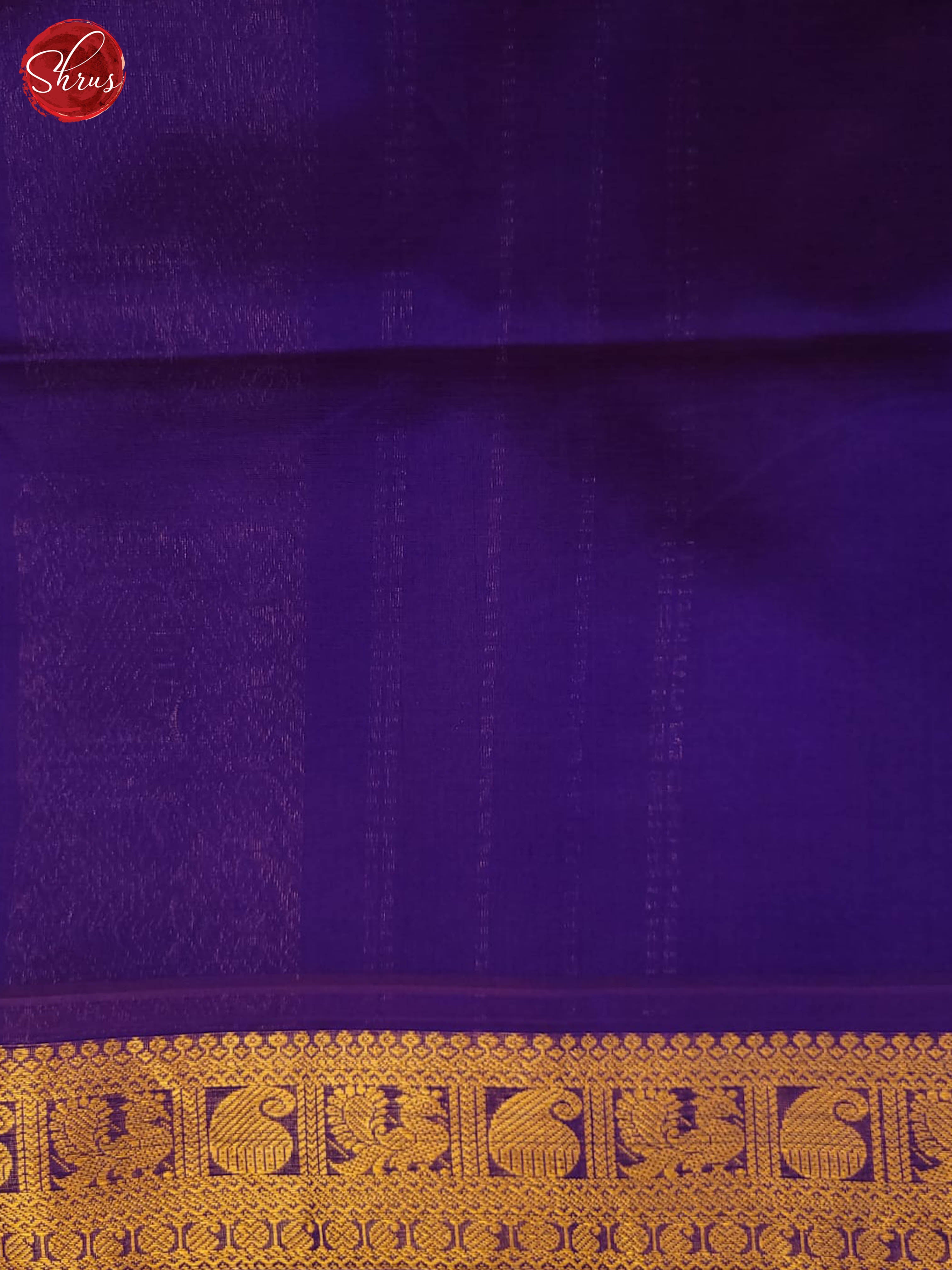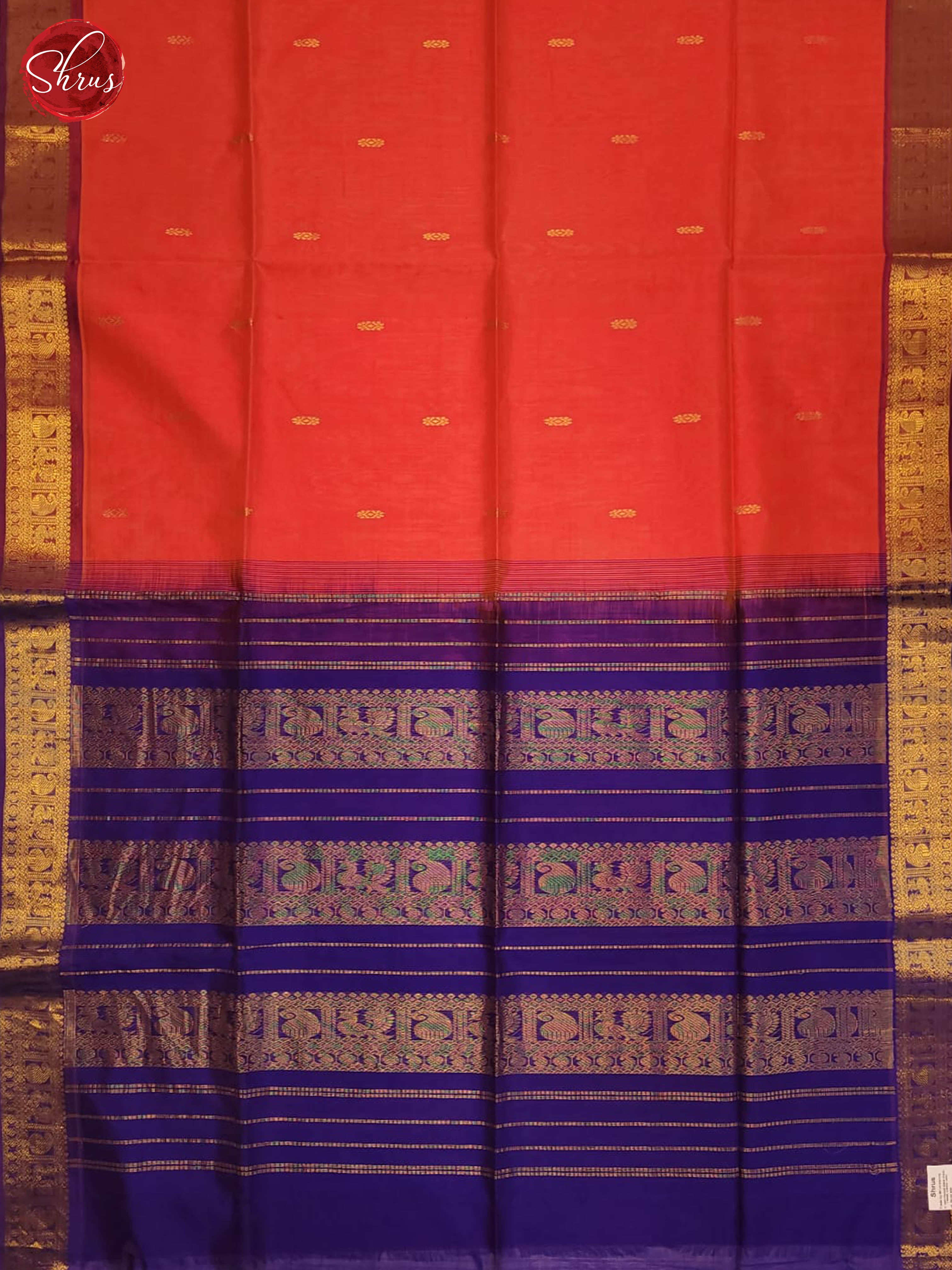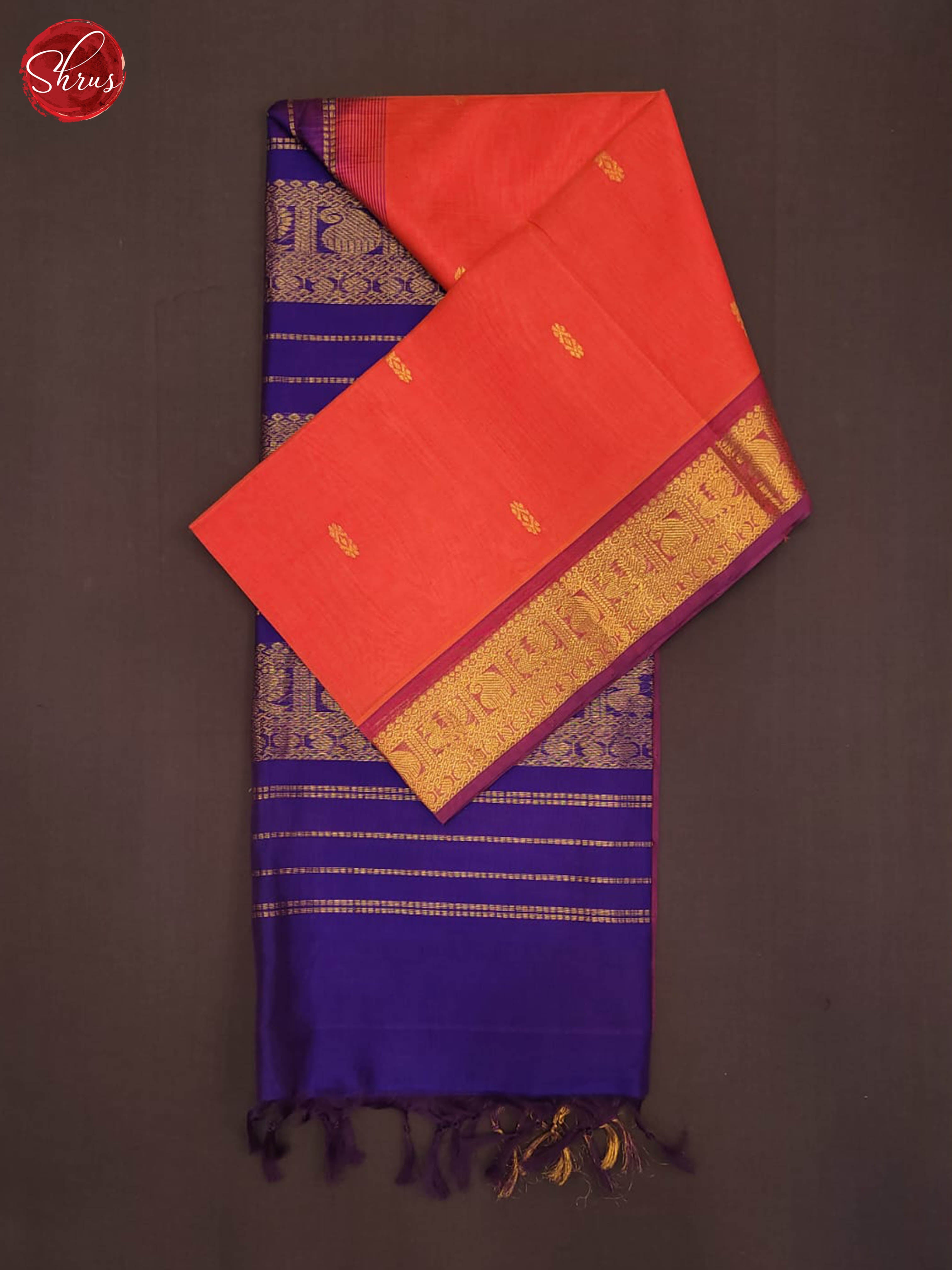 Beautifully Chic Orange Silk Cotton Saree enchants with zari woven buttas on the Body & bounded by a Contrast Purple Zari Border . The splendid Blue Contrast zari woven brocade Pallu And plain Blouse with zari border gives a chic twist