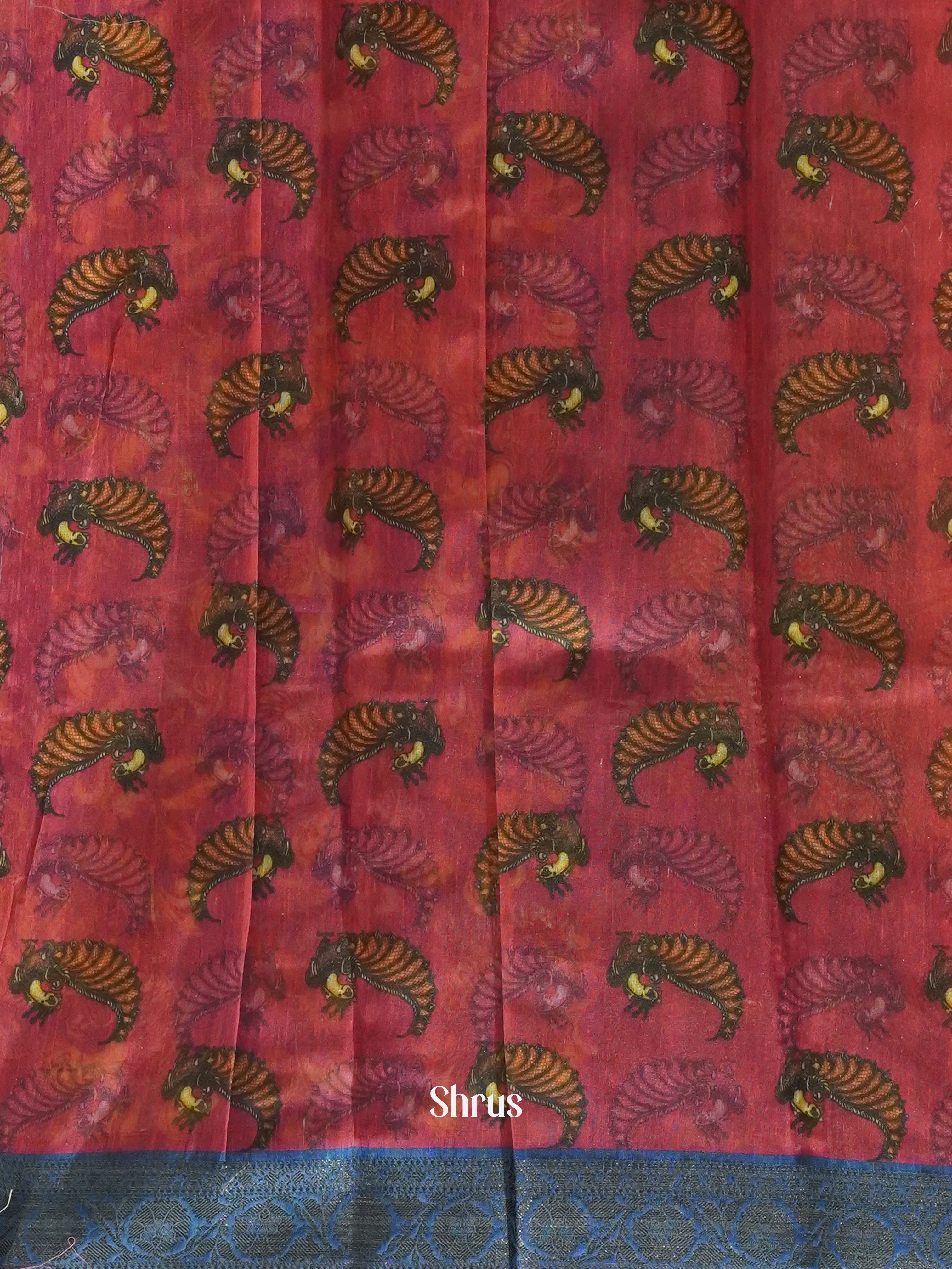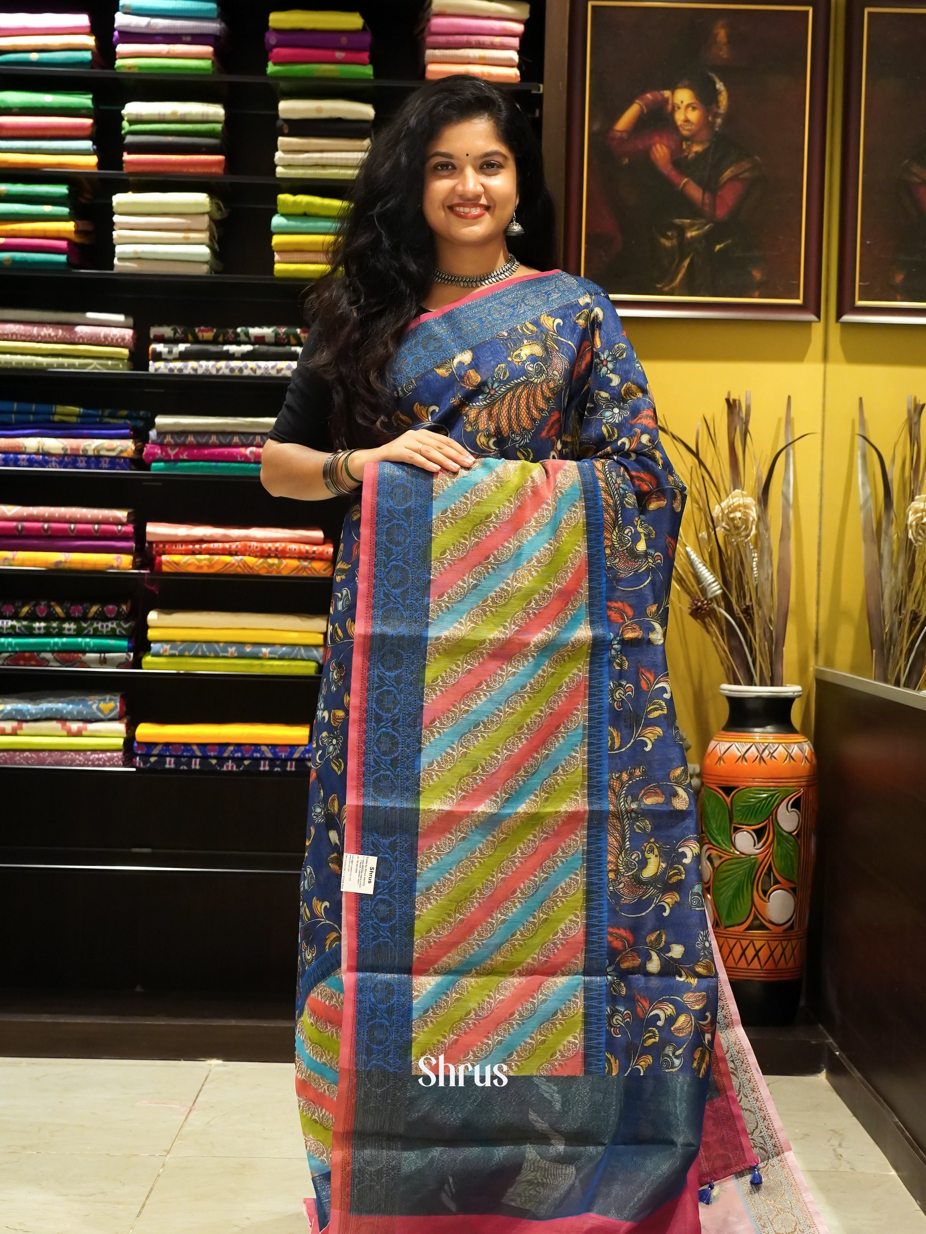 Pink & Blue - Linen with Kalamkari floral print on the body & Zari Border