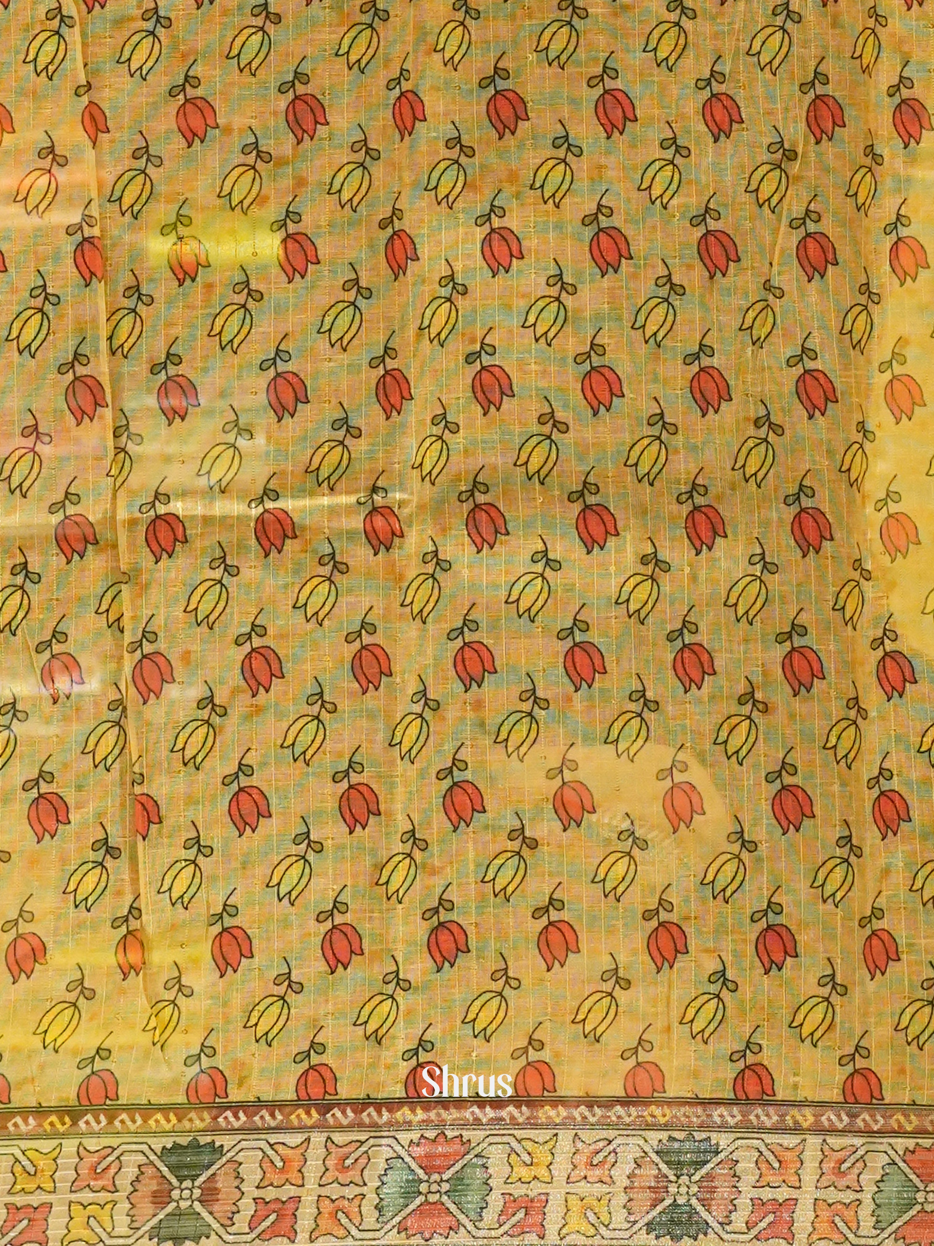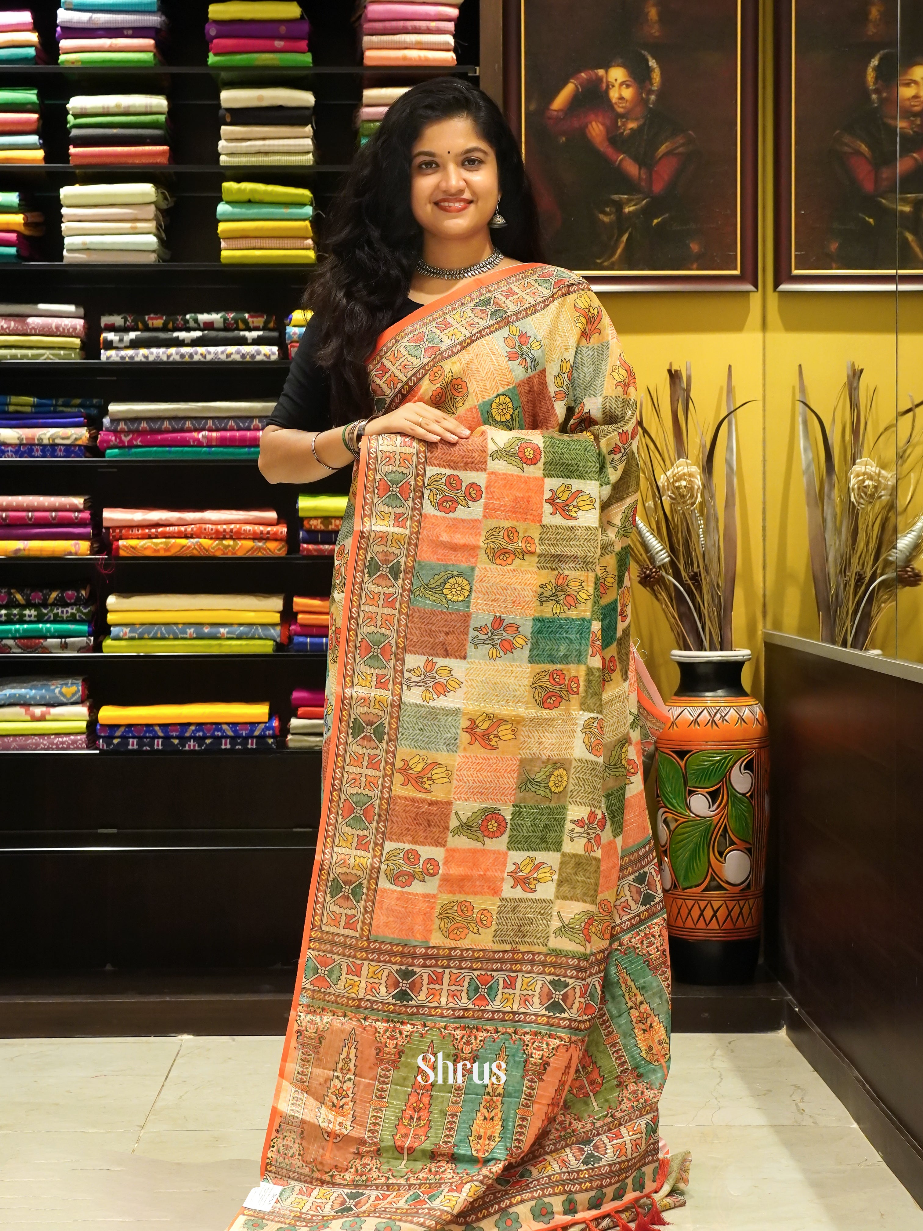 Very Pretty Multicolor Art Linen saree with Printed Body & Bounded with Orange printed border adds charms The self printed pallu & blouse lends Complement