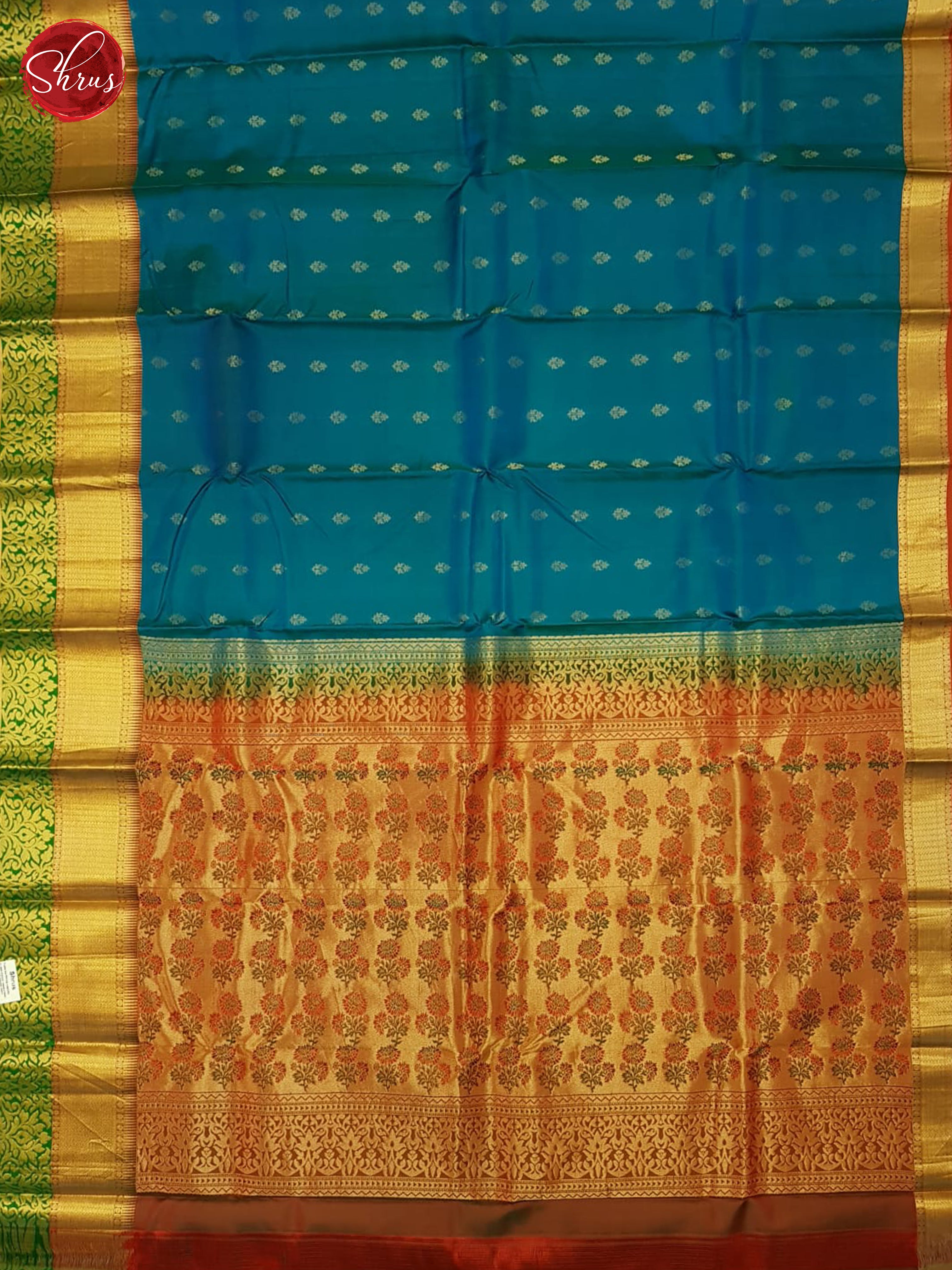 The elegant Blue Kanchipuram Silk Saree features zari buttas on the body, enhanced by a charming brown Zari Border woven with floral designs, known as Kaddi. The contrasting brown zari woven Pallu with floral brocade and a plain Blouse with a zari border completes the look.