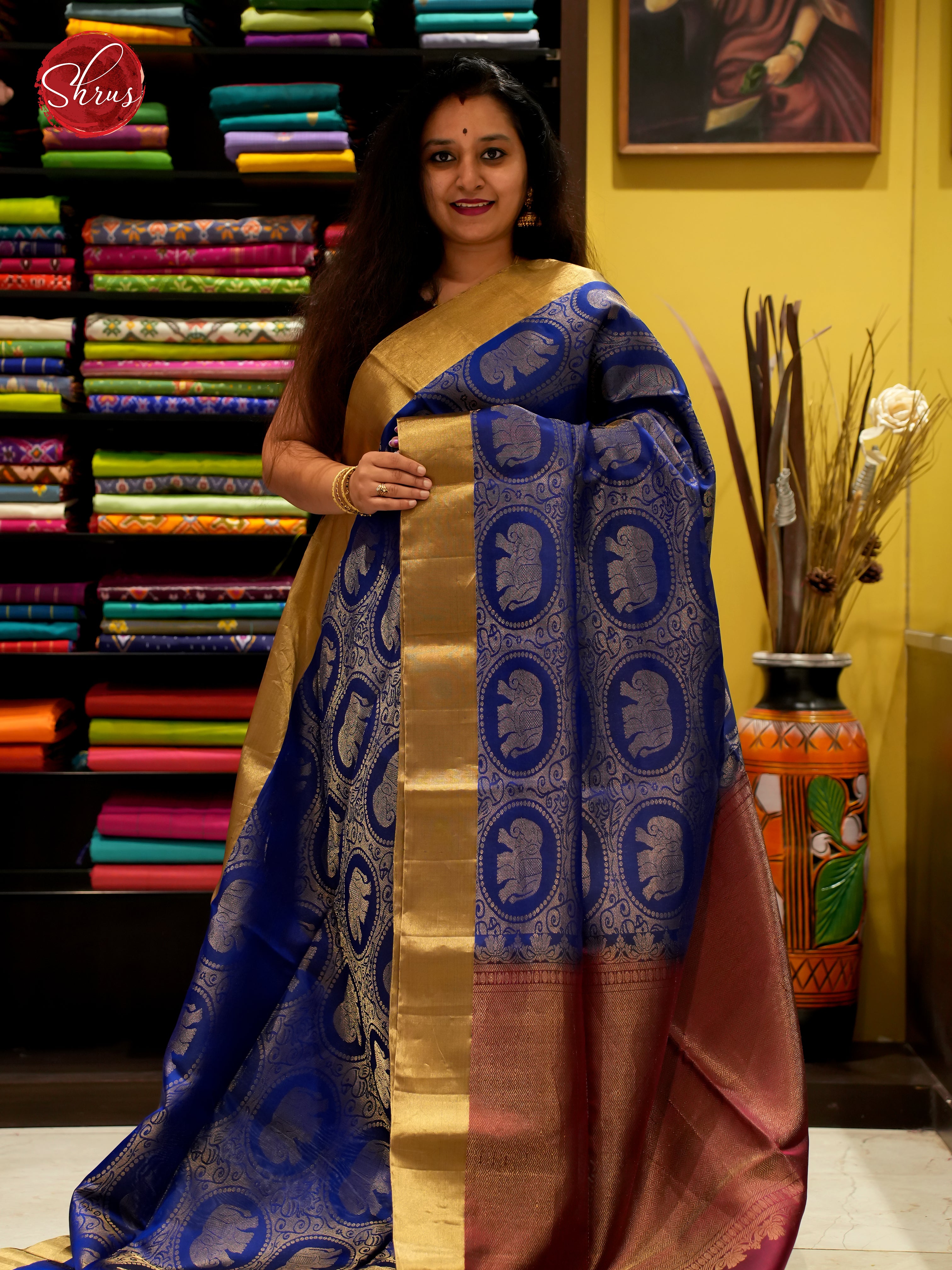 Blue & Maroon -Soft Silk Saree with Elephant motifs in brocade on the body & Zari Border