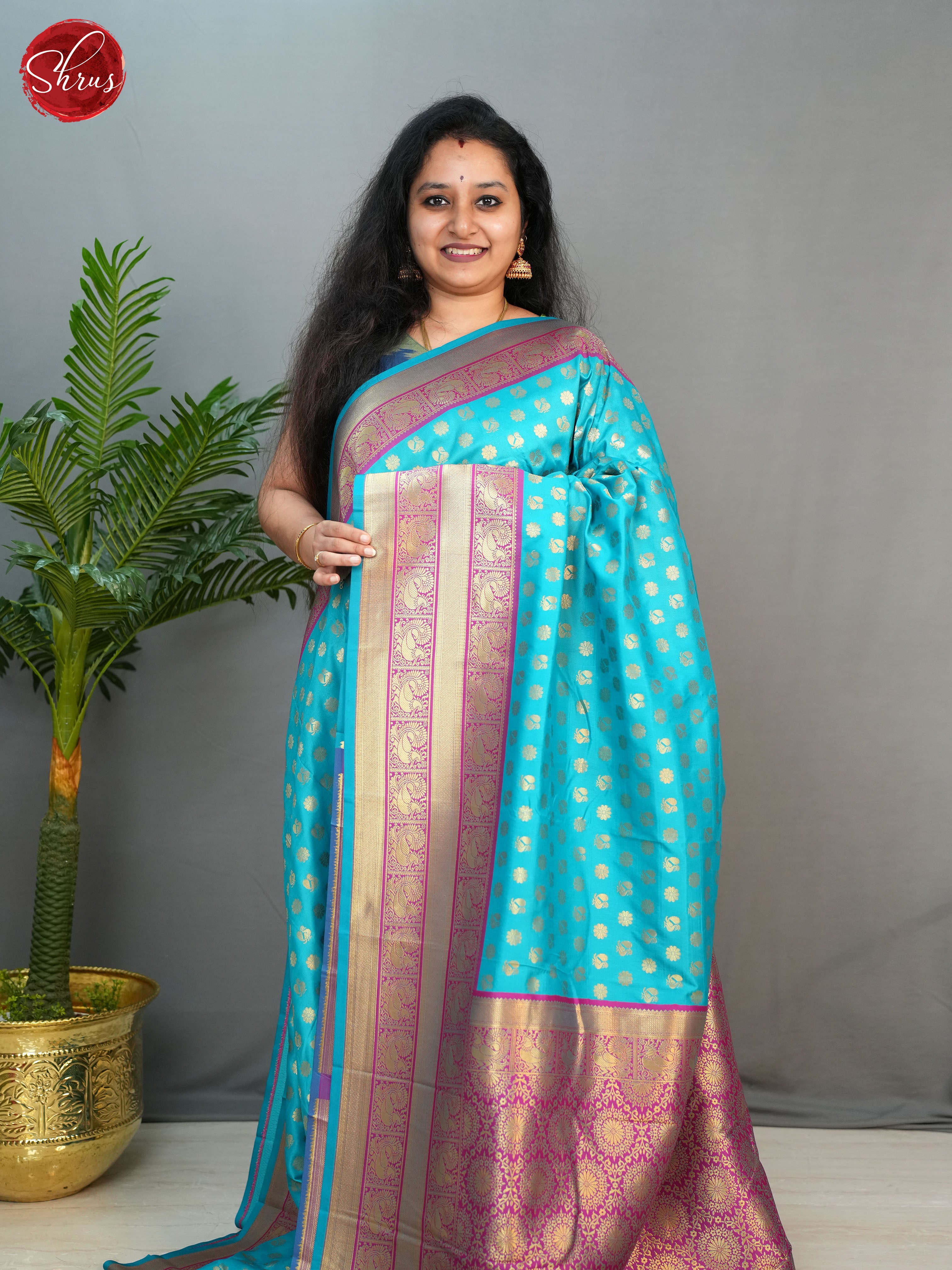 Blue & Purple -Semi Kanchipuram with Zari woven floral, peacock buttas on the body & Contrast Zari Border