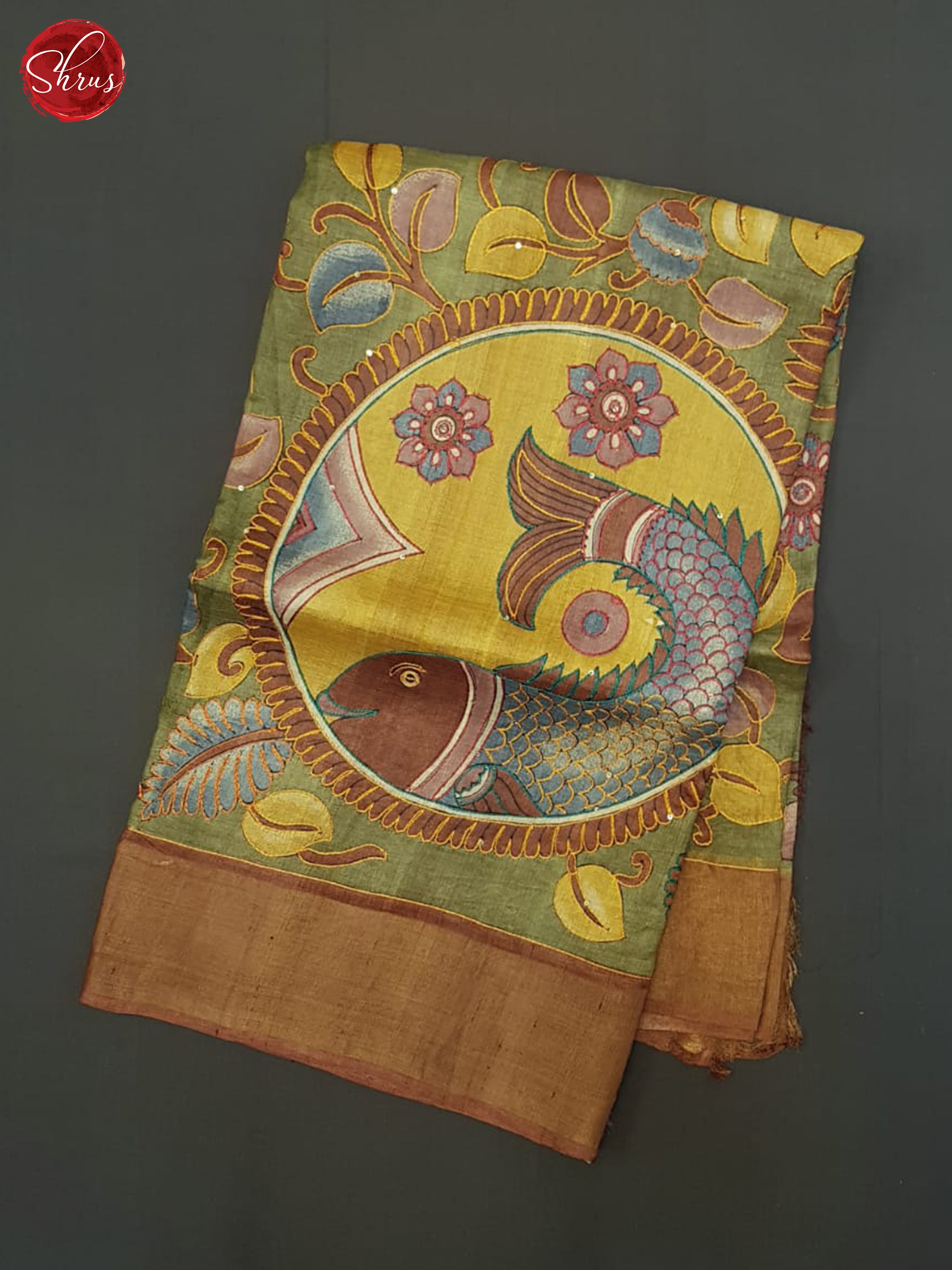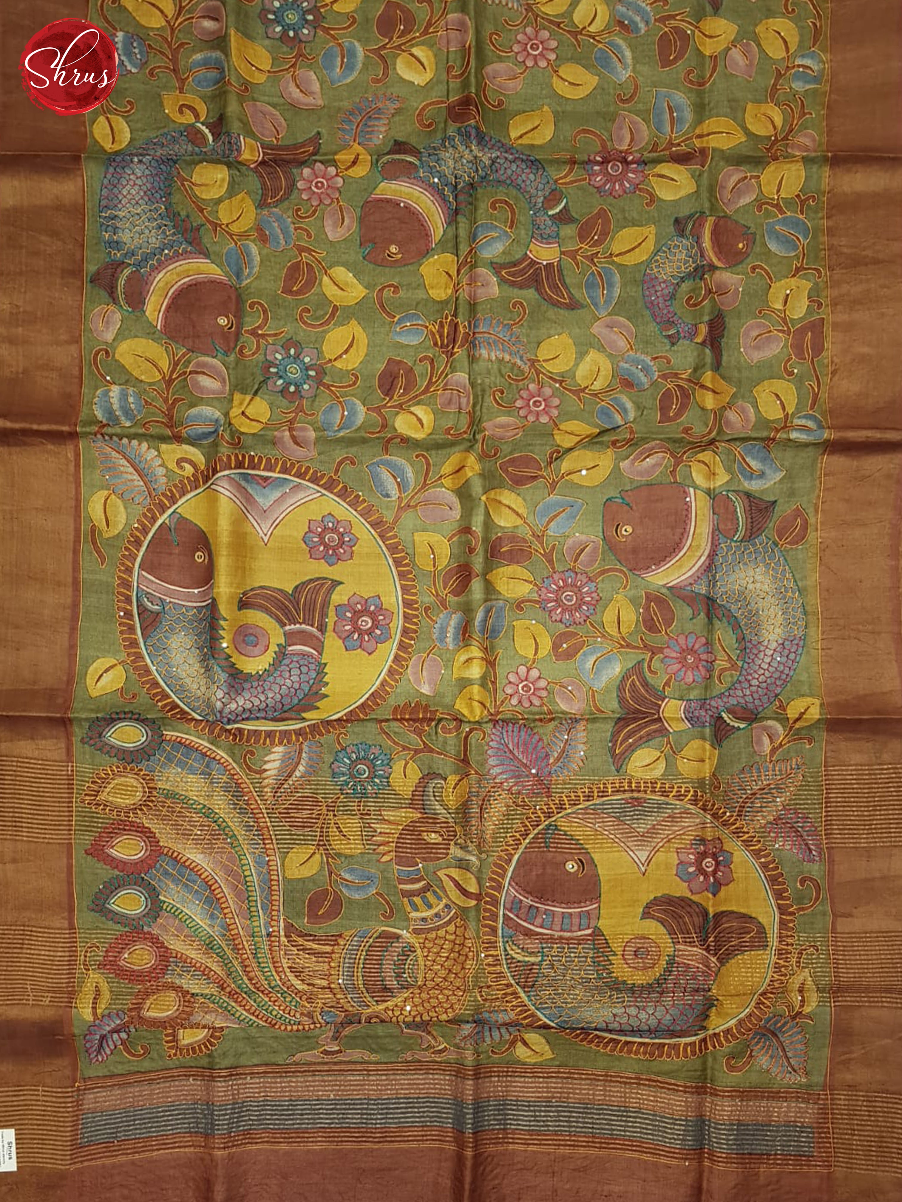 Beautiful Green Tussar Saree enchants with kalamkari floral printed , kantha Stitch body lends a beautiful complement Comes with contrast Brown zari border & Self Printed pallu adds elegance . Comes with plain Brown blouse with border gives a perfect fit