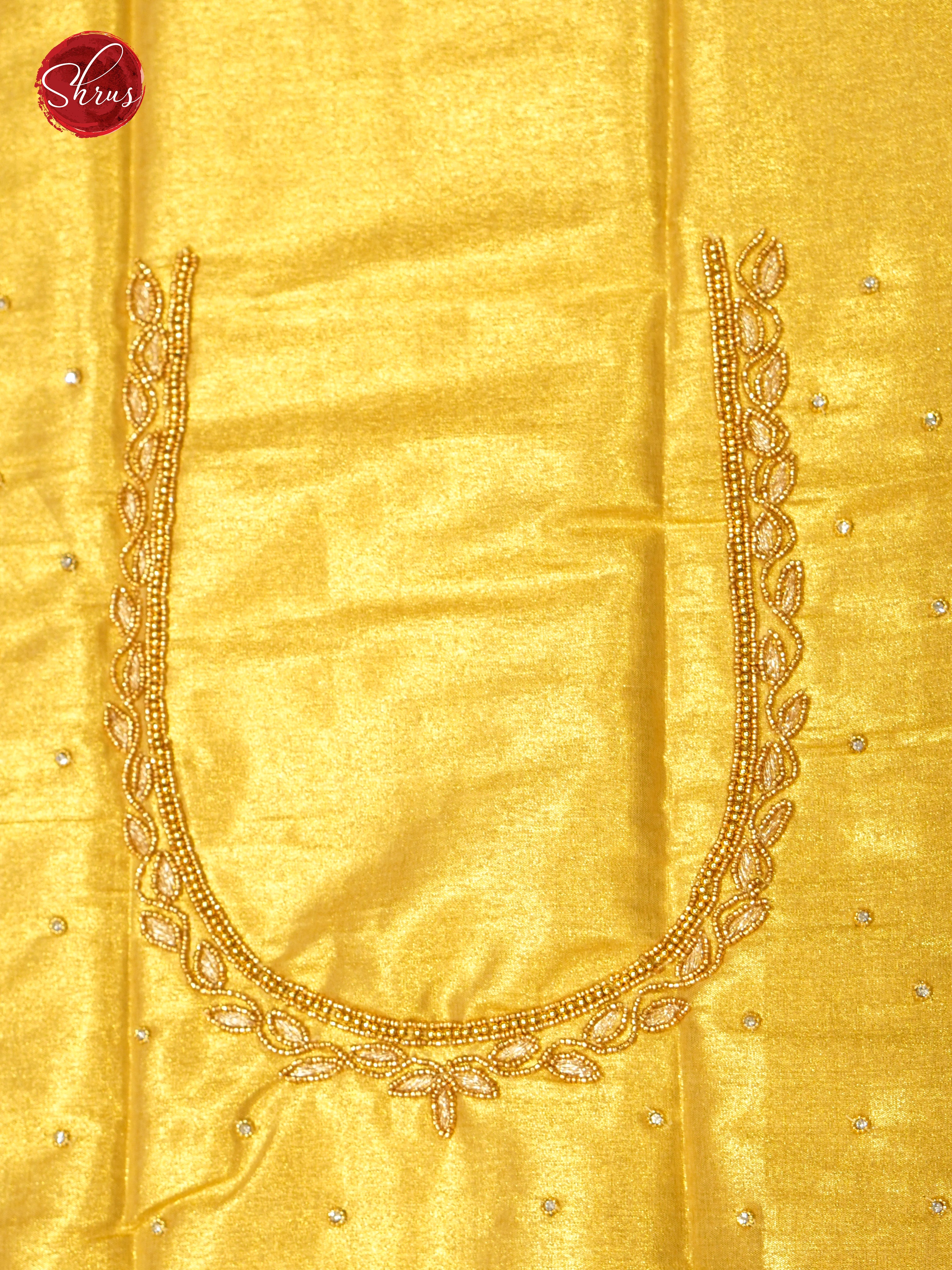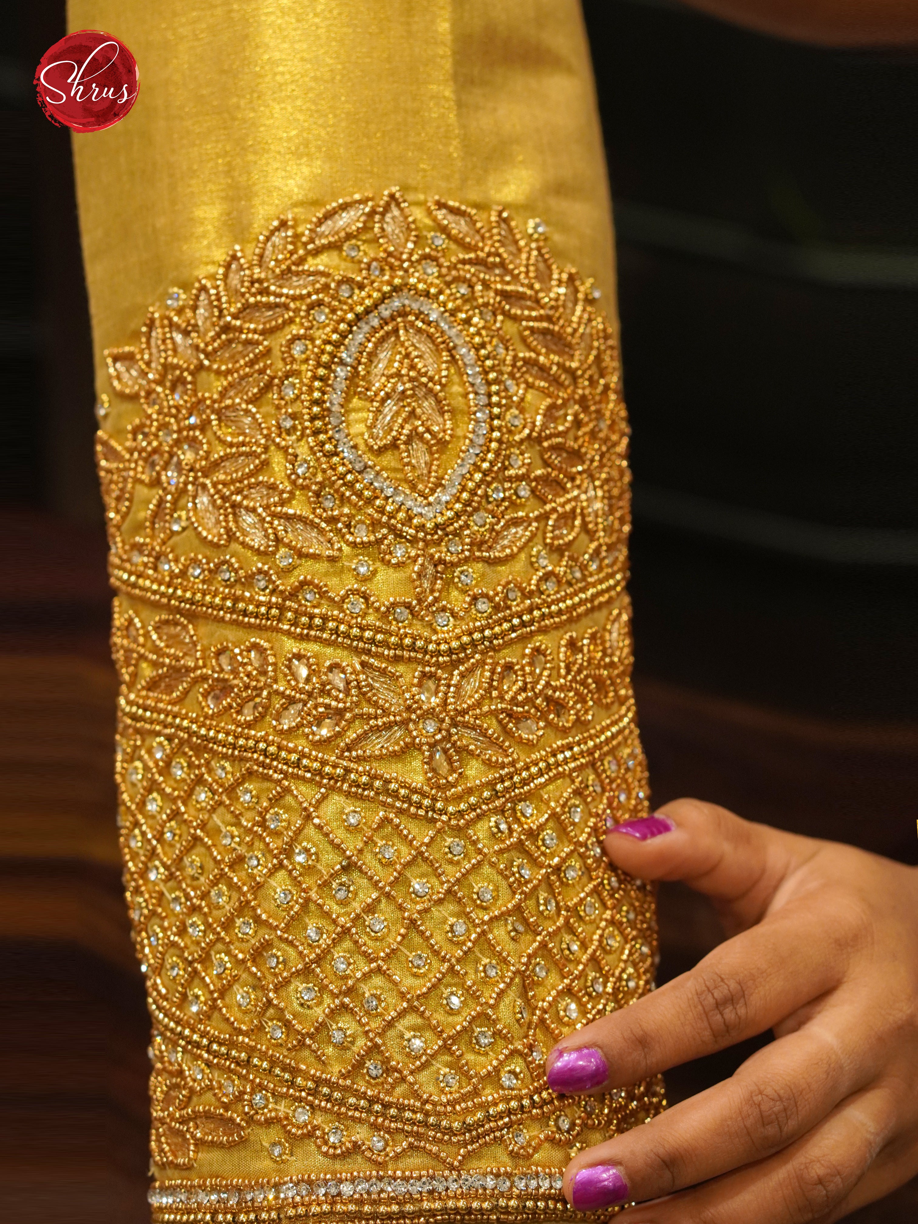 Shimmery Gold - Aari Blouse features a beautiful display of intricate aari work accented with sparkling stones and delicate beads. Elevate your style with the exquisite workmanship and ornate details, adding a touch of luxury to your wardrobe.