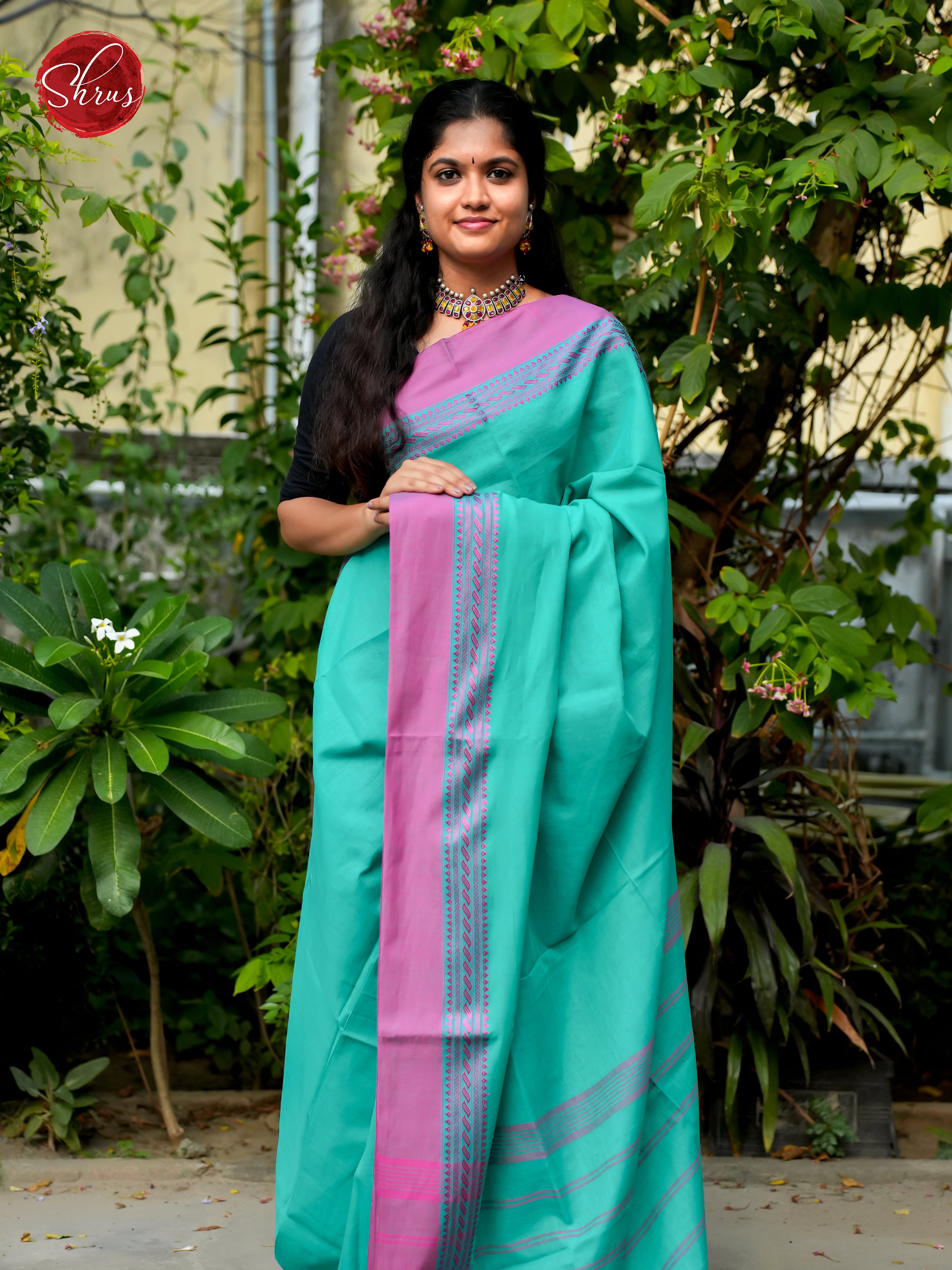Pretty Green Bengal cotton saree showcases a lovely plain body, bordered with a striking Pink. The refined self pallu has a striped design and is paired with a simple Self blouse with a border.
