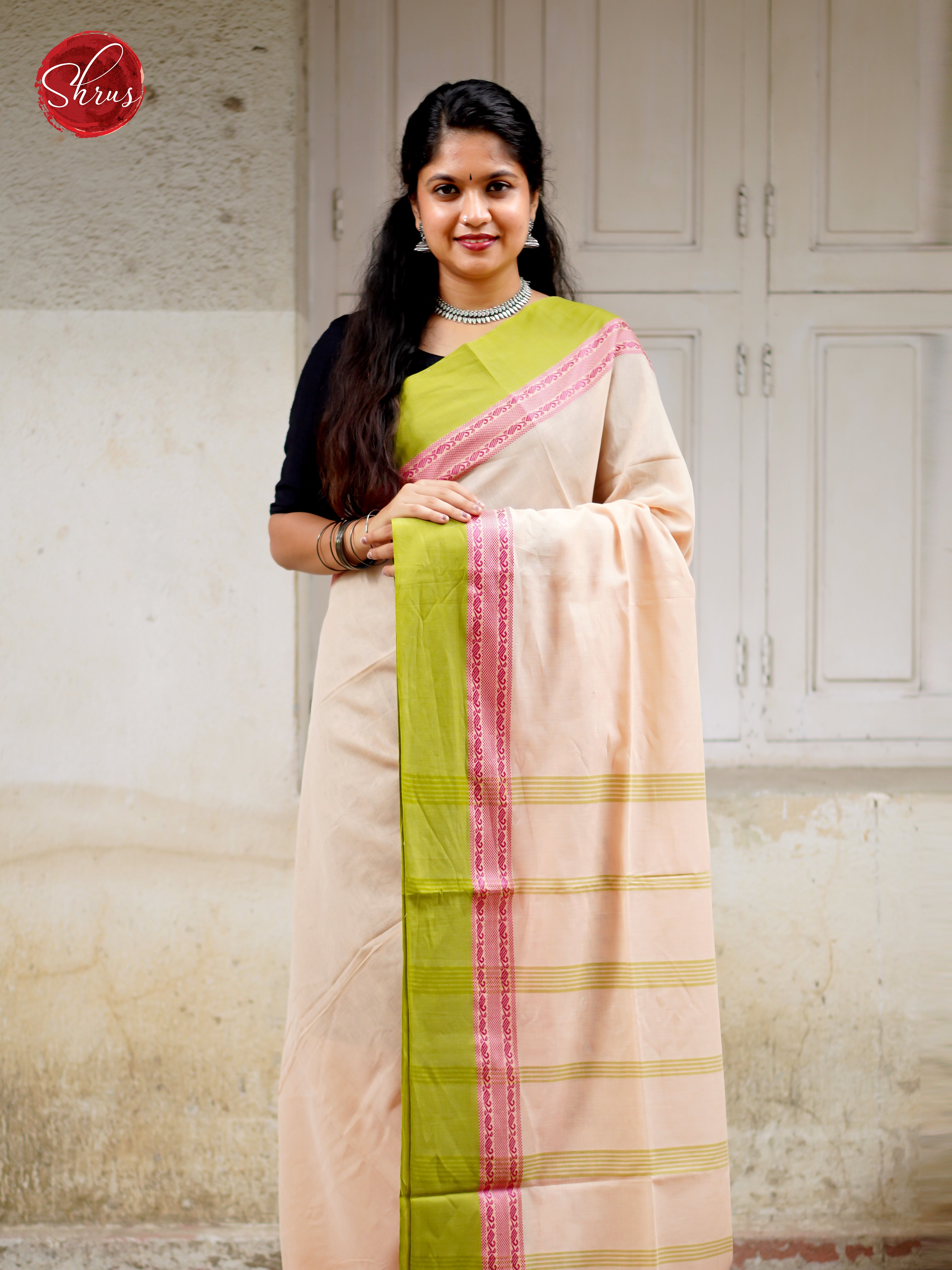 Elegant Sandal Bengal Cotton Saree features a charming plain body and is bordered with a vibrant Green Border. Its sophisticated self pallu includes a Stripes design, and it is accompanied by a plain self Blouse with a border.
