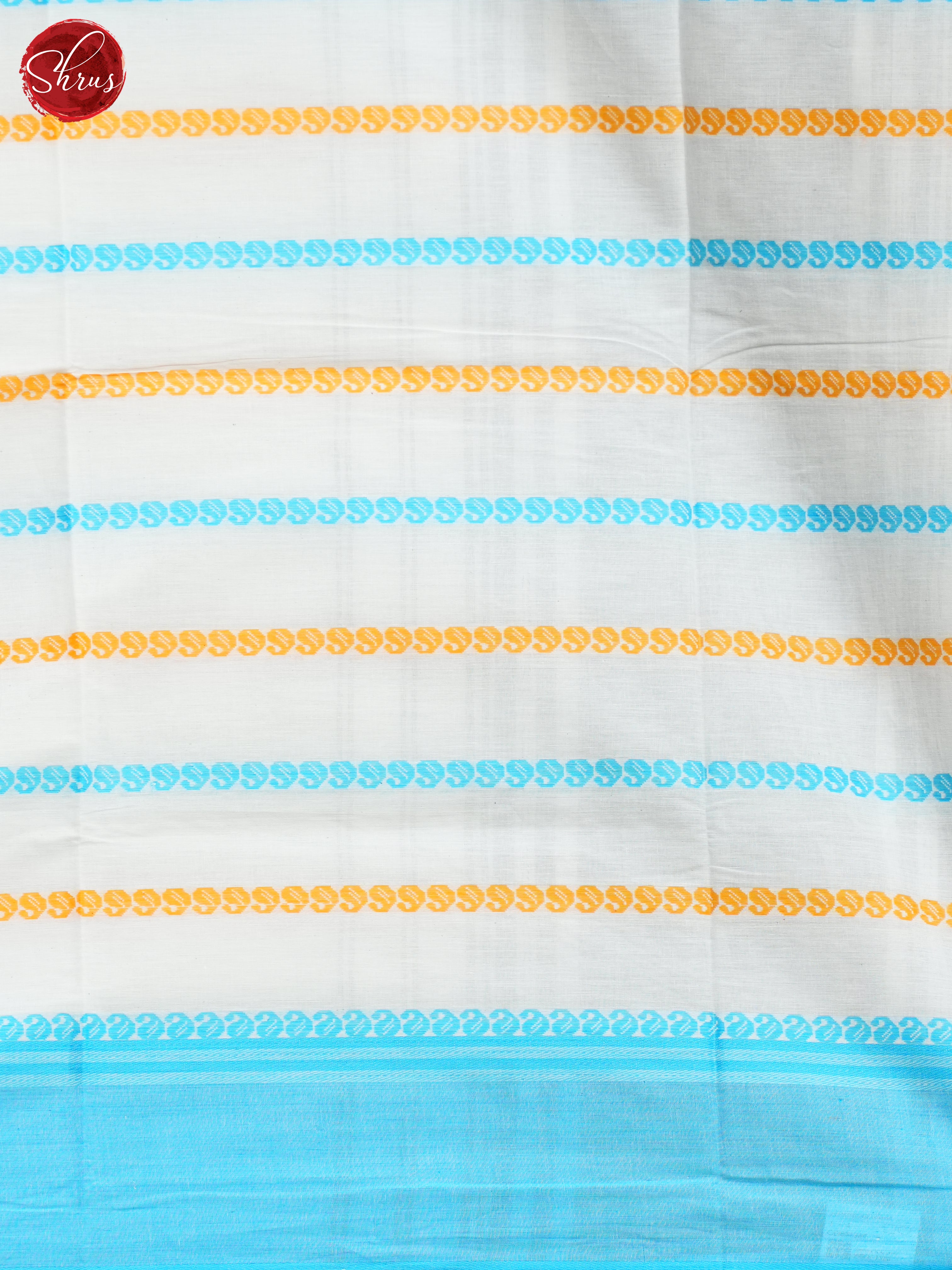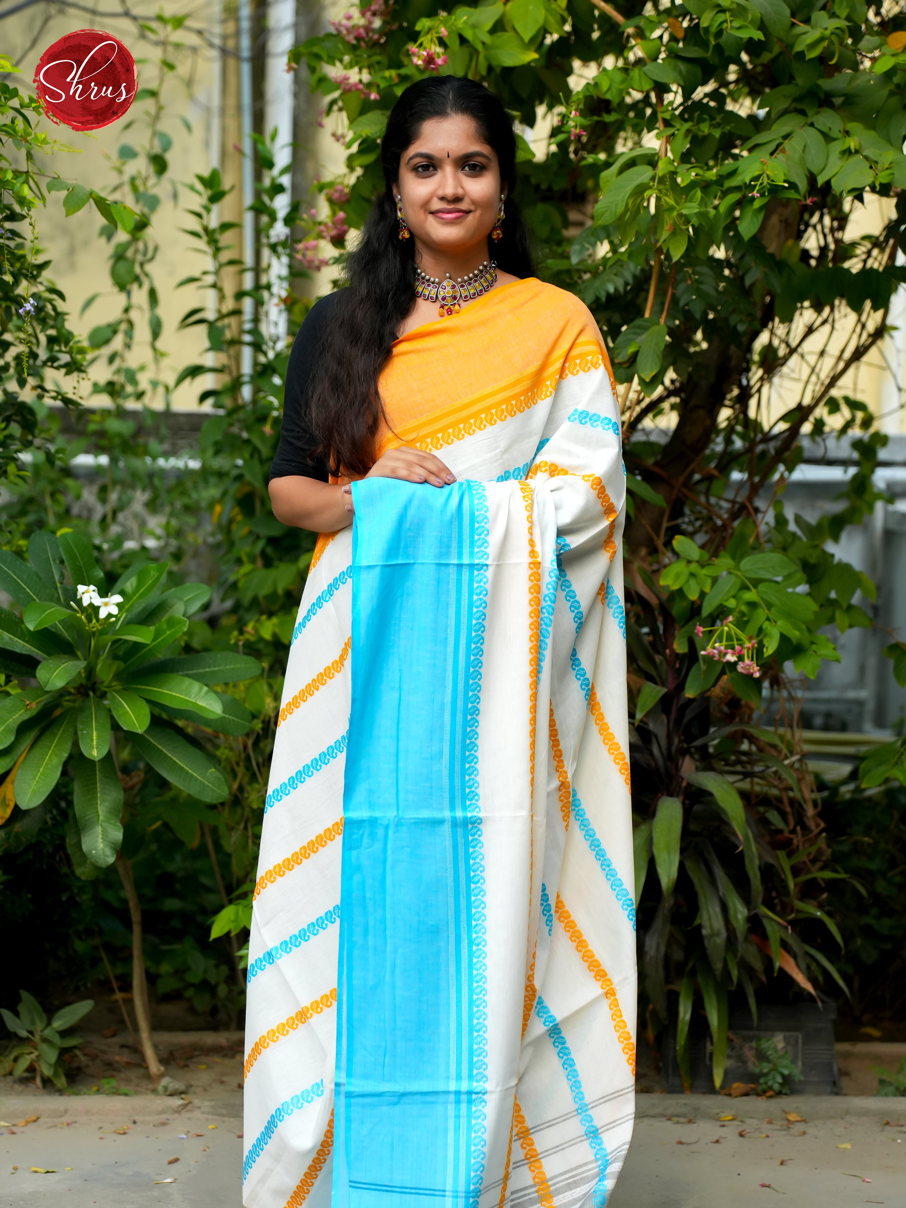 Pretty White &Blue Mercerized Cotton saree features a chic hand-woven design with thread woven stripes on the body. The contrast Blue,Mustard border and pallu add a touch of elegance. It comes with a matching Self Blouse with Border.