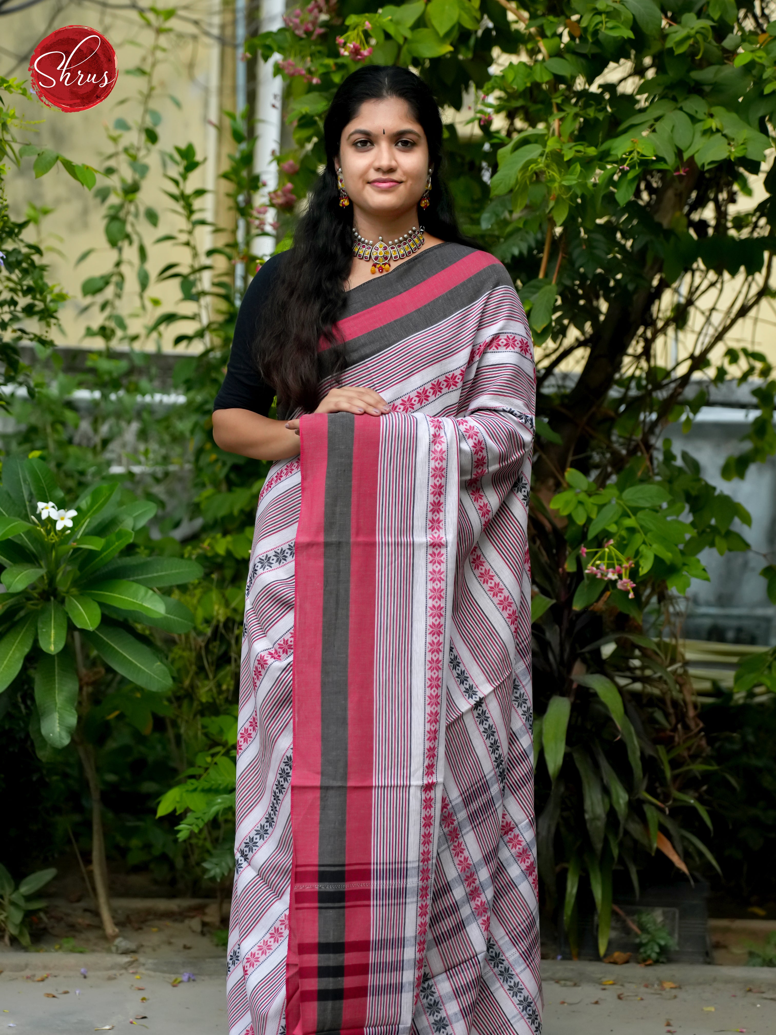 Elegant Onion Pink , White Mercerized Cotton saree features a chic hand-woven design with thread woven stripes on the body. The contrast Red, Black border and pallu add a touch of elegance. It comes with a matching Self Blouse with Border.