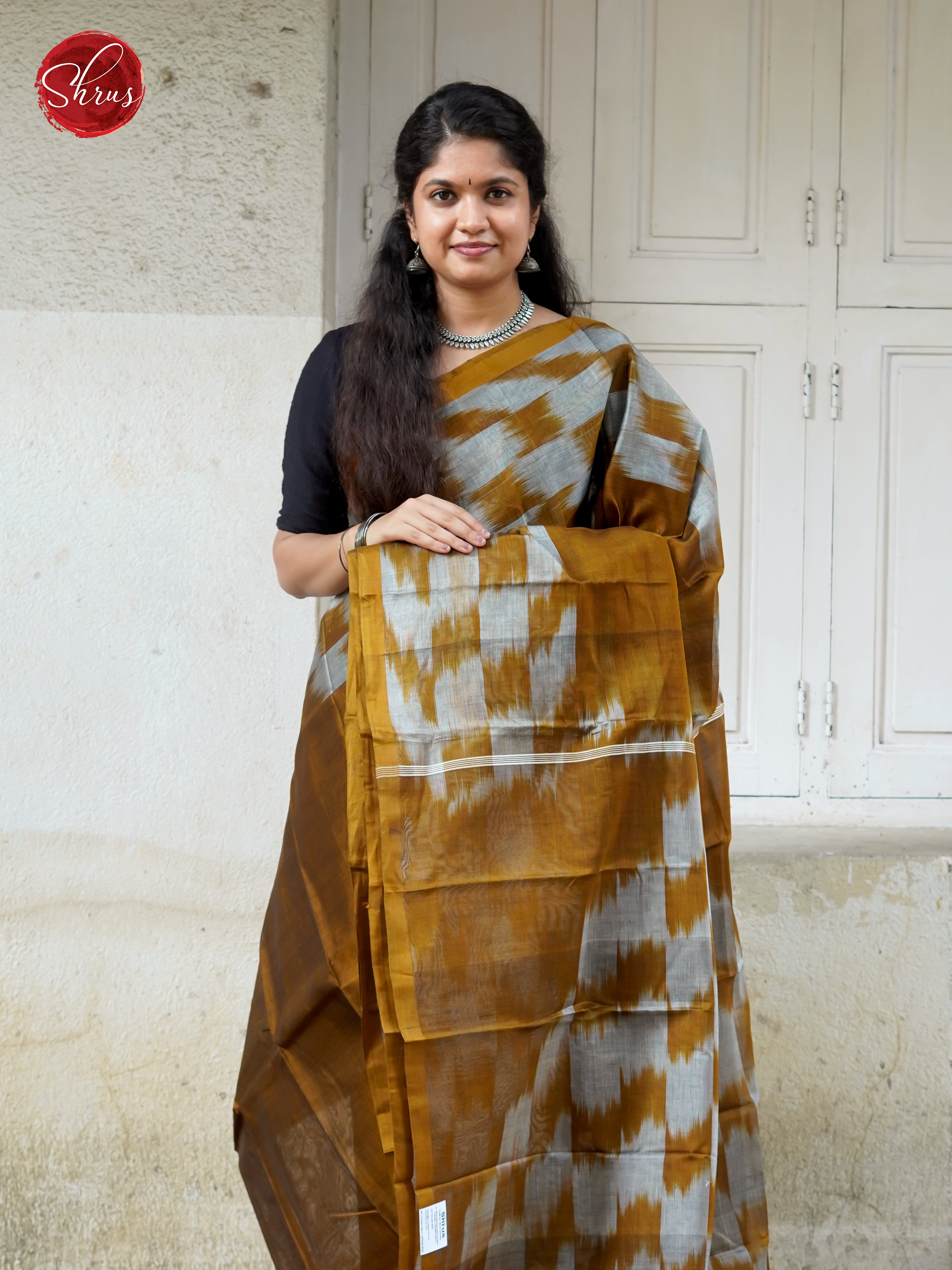 Elegant Brown & Grey saree features Dhakhai cotton of exceptional quality and showcases a sophisticated Bhatik design on its body, border, and pallu, adding a touch of elegance to your outfit.