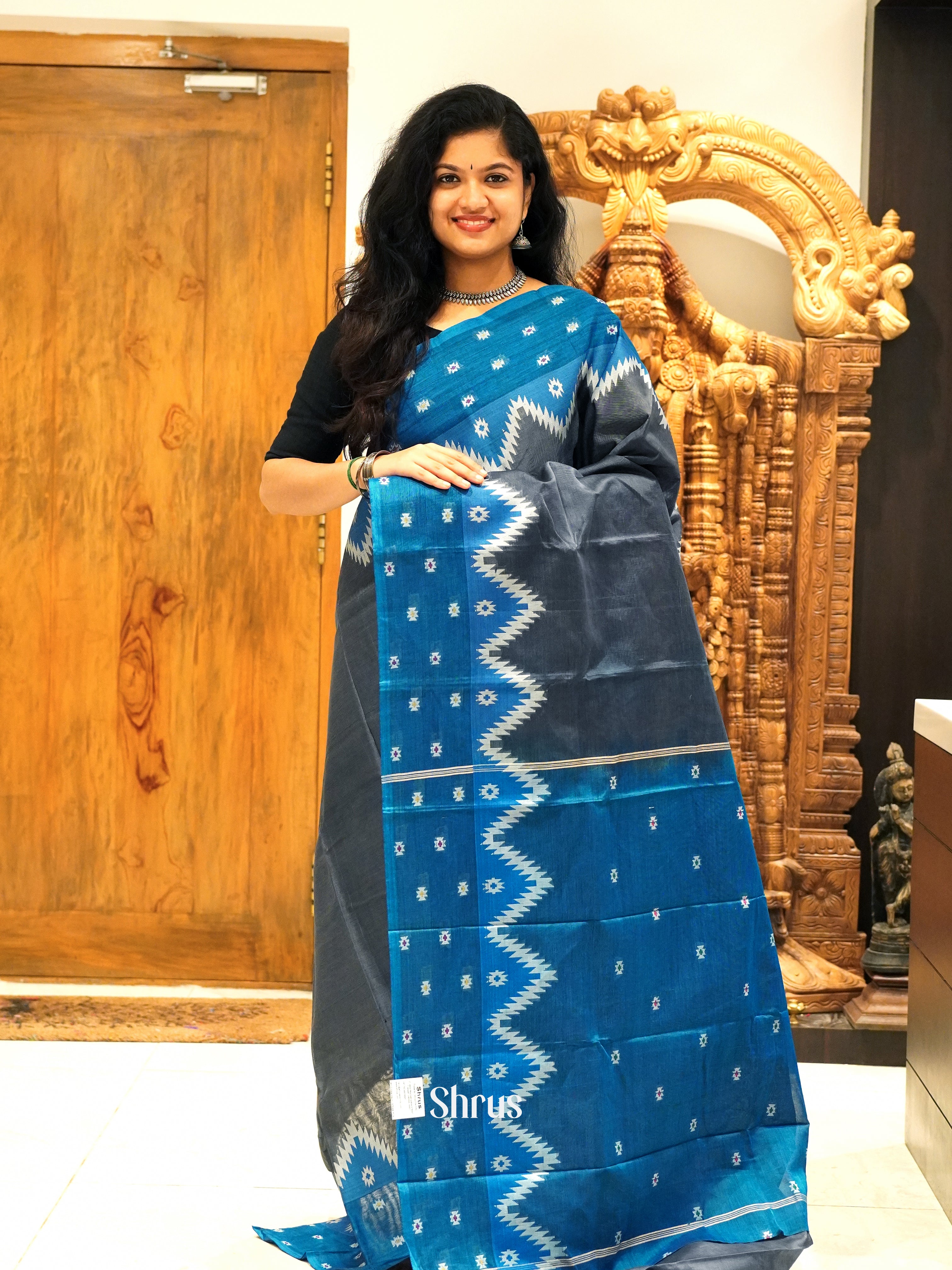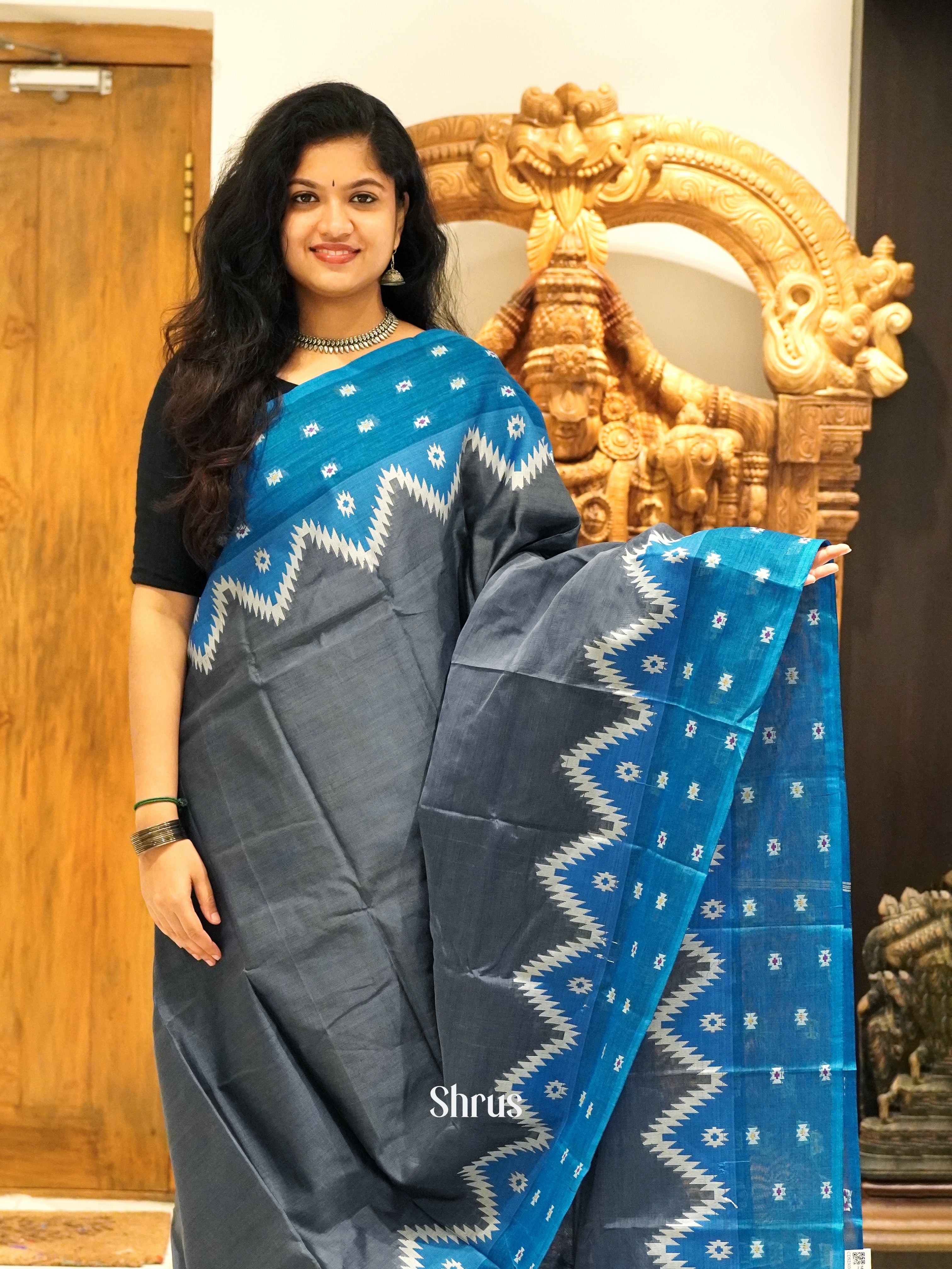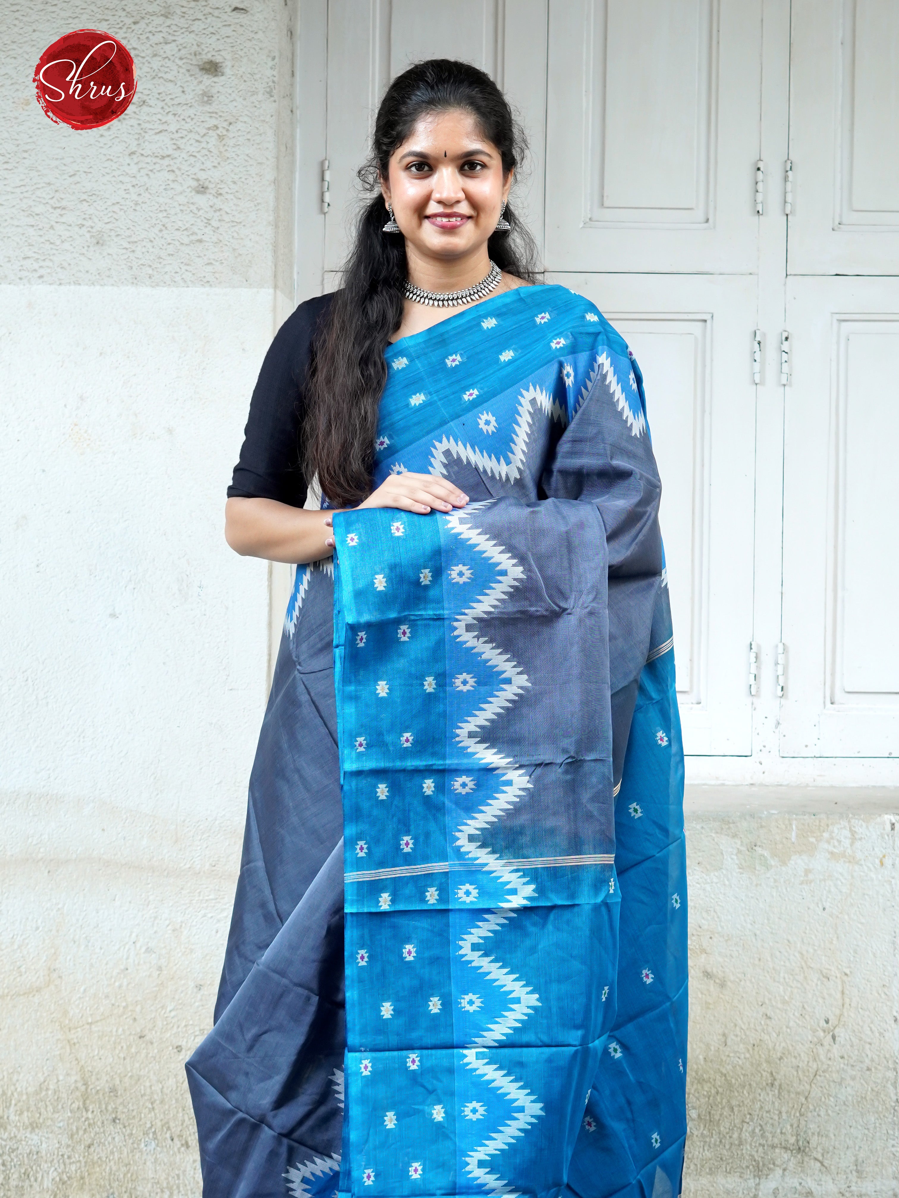 Pretty Grey & Blue saree features Dhakhai cotton of exceptional quality and showcases a sophisticated Bhatik design on its body, border, and pallu, adding a touch of elegance to your outfit.