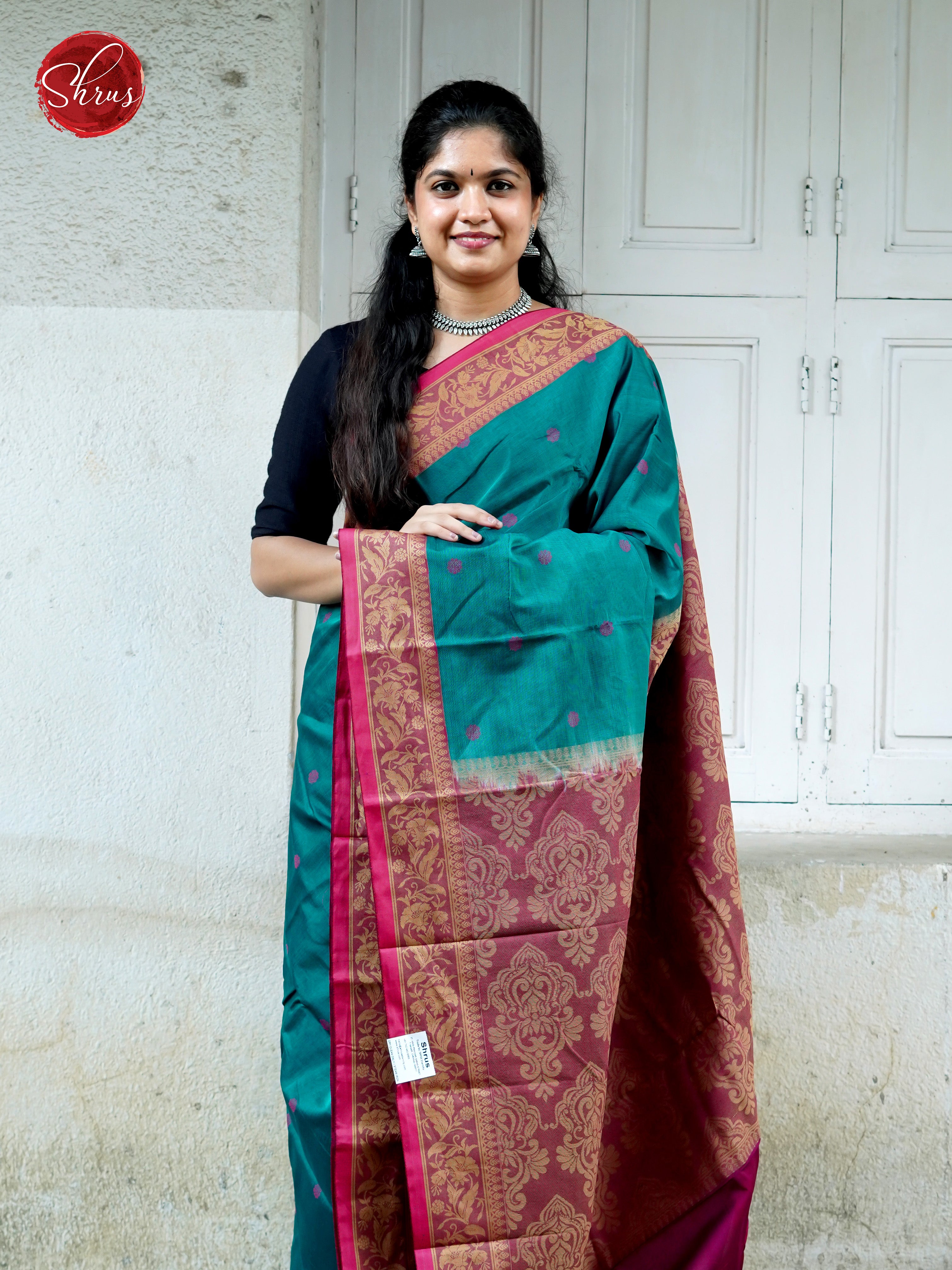 Elegant Green Mercerized Cotton saree boasts a beautifully hand-woven design with thread woven buttas on the body. The contrast Pink zari border and pallu provide an elegant touch. It also includes a matching Pink plain Blouse with Border.