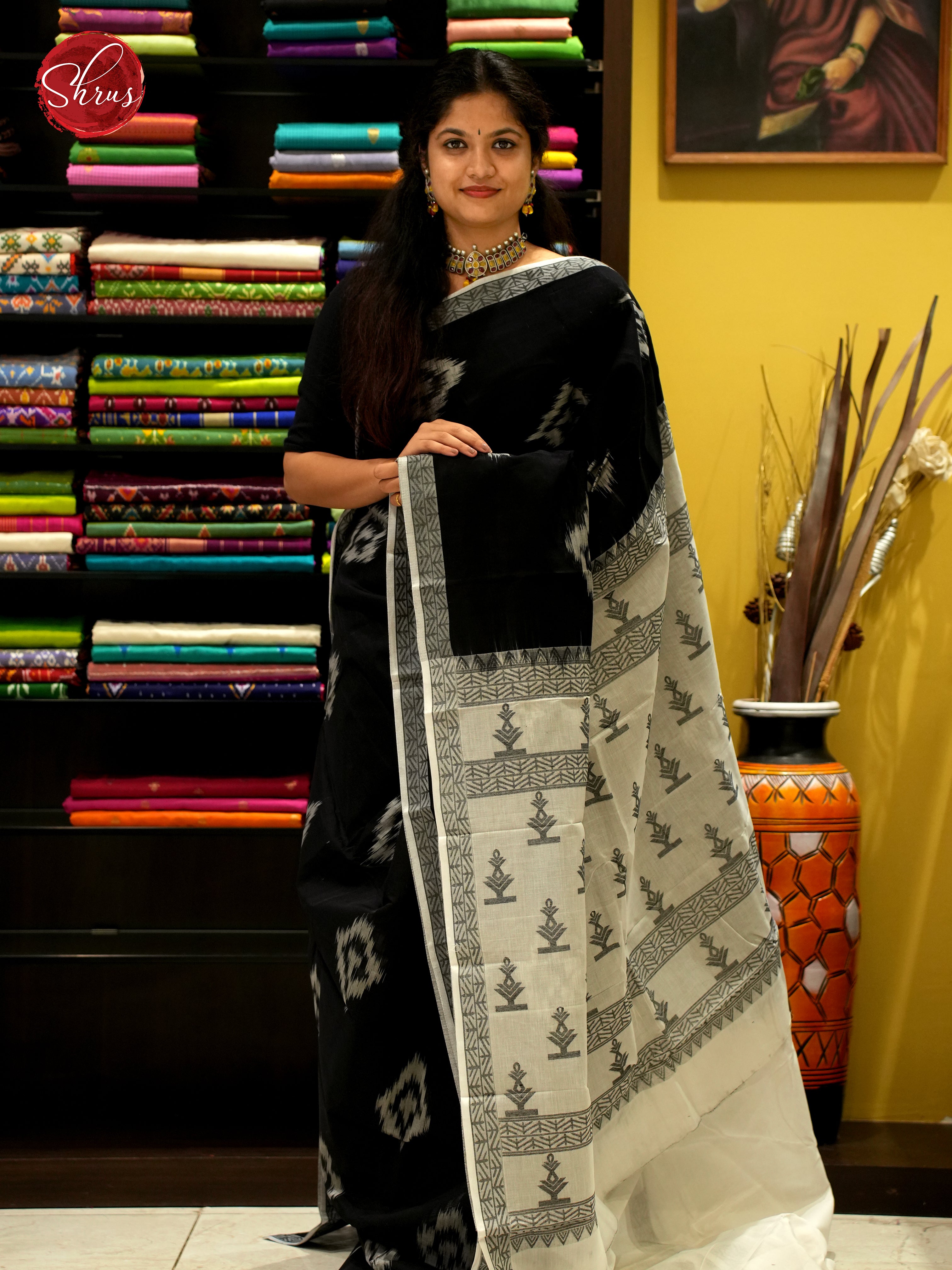 Pretty Black Mercerized Cotton saree features a chic hand-woven design with thread woven buttas on the body. The self zari border and cream pallu add a touch of elegance. It comes with a matching cream Blouse